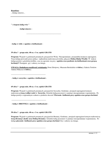 Bambino ...Kuligi zimowe... " z kopyta kulig rwie " - kuligi zimowe _____________________________________ - kulig w wiśle + ognisko z kiełbaskami - 59 zł/os.* - grupa min. 40 os.+ 3 os. opieki GRATIS Program: Wyjazd w godzinach porannych, przyjazd do Wisły. Niezapomniana przejażdżka konnym zaprzęgiem. Trasa kuligu prowadzi przez jedną z najbardziej malowniczych dolin, jaką jest Dolina Białej Wisełki. W trakcie kuligu postój w góralskiej kolibie, czas na ogrzanie się przy ognisku oraz posilenie się kiełbaskami oraz gorącą herbatą!!! Następnie gry i zabawy na śniegu. UWAGA: Dodatkowo możliwość zwiedzania: Dom Zdrojowy, Muzeum Beskidzkie (+3zł/os.), Galeria Trofeów Adama Małysza (+3zł/os.). _____________________________________ - kulig w szczyrku + ognisko z kiełbaskami - 69 zł/os.* - grupa min. 40 os.+ 3 os. opieki GRATIS Program: Wyjazd w godzinach porannych, przyjazd do Szczyrku. Godzinny przejazd zaprzęgiem konnym malowniczą trasą wzdłuż rzeki w Szczyrku. Góralski kulig pozostawi w pamięci niezapomniane wspomnienia. Po kuligu postój w regionalnym szałasie u podnóża skoczni! Pieczenie kiełbasek przy ognisku oraz gorąca herbata! _____________________________________ - kulig w BRENNEJ + ognisko z kiełbaskami - 58 zł/os.* - grupa min. 40 os.+ 3 os. opieki GRATIS Program: Wyjazd w godzinach porannych, przyjazd do Brennej. Godzinny przejazd zaprzęgiem konnym malowniczą trasą Brennej i okolic oraz Doliną Brennicy. Góralski kulig pozostawi w pamięci niezapomniane wspomnienia. Po kuligu pieczenie kiełbasek przy ognisku oraz gorąca herbata! Gry i zabawy na śniegu. _____________________________________ strona 1 / 2 Bambino ...Kuligi zimowe... - kulig w ojcowie + ognisko z kiełbaskami - 69 zł/os.* - grupa min. 40 os.+ 3 os. opieki GRATIS Program: Wyjazd w godzinach porannych, przyjazd do Ojcowa. Jedyna taka możliwość zwiedzania saniami Ojcowskiego Parku Narodowego i jego okolic! Niezapomniana przejażdżka malowniczą trasą Doliny Prądnika! Godzinny kulig zaprzęgiem konnym, a następnie ognisko z kiełbaskami i gorącą herbatą! Dodatkowo mozliwość przejazdu do Pieskowej Skały i spaceru pod Maczugę Herkulesa. _____________________________________ - kulig w ŚWIERKLAŃCU + ognisko z kiełbaskami - 39 zł/os.* traktor - grupa min. 45 os.+ 3 os. opieki GRATIS 49 zł/os.* zaprzęg - grupa min. 45 os.+ 3 os. opieki GRATIS Program: Wyjazd w godzinach porannych, przyjazd do Parku w Świerklańcu. Realizacja programu wycieczki: kulig przez malownicze aleje parkowe. Czas trwania kuligu: 30 min. (zaprzęg), 45 min. (traktor). Po kuligu poczętunek: kiełbaska z ogniska oraz gorąca herbata! Następnie gry i zabawy na śniegu. _____________________________________ galeria:___________________________________ strona 2 / 2