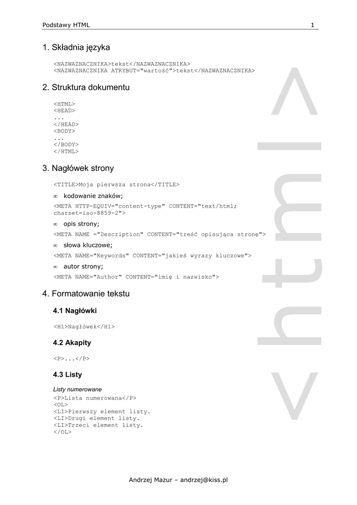 1 Podstawy HTML <NAZWAZNACZNIKA>tekst</NAZWAZNACZNIKA> <NAZWAZNACZNIKA ATRYBUT="wartość">tekst</NAZWAZNACZNIKA> 2. Struktura dokumentu <HTML> <HEAD> ... </HEAD> <BODY> ... </BODY> </HTML> 3. Nagłówek strony <TITLE>Moja pierwsza strona</TITLE> • kodowanie znaków; <META HTTP-EQUIV="content-type" CONTENT="text/html; charset=iso-8859-2"> • opis strony; <html> 1. Składnia języka <META NAME ="Description" CONTENT="treść opisująca stronę"> • słowa kluczowe; <META NAME="Keywords" CONTENT="jakieś wyrazy kluczowe"> • autor strony; <META NAME="Author" CONTENT="imię i nazwisko"> 4. Formatowanie tekstu 4.1 Nagłówki <H1>Nagłówek</H1> 4.2 Akapity <P>...</P> 4.3 Listy Listy numerowane <P>Lista numerowana</P> <OL> <LI>Pierwszy element listy. <LI>Drugi element listy. <LI>Trzeci element listy. </OL> Andrzej Mazur – [email protected] 2 Listy wypunktowane <P>Rodzaje list</P> <UL> <LI>lista numerowana <LI>lista wypunktowana <LI>lista definicji </UL> Listy zagnieŜdŜone <P>Urządzenia peryferyjne</P> <UL> <LI>Monitor <LI>Drukarka <UL> <LI>Atramentowa <LI>Laserowa <LI>Igłowa <LI>Termiczna </UL> <LI>Klawiatura <LI>Myszka </UL> <html> Podstawy HTML Urządzenia peryferyjne 4.4 Komentarze <!-- To jest komentarz --> 4.5 Style znaków Tabela 1 - Znaczniki formatowania logicznego Znacznik Znaczenie <EM>...</EM> Tekst wyświetlony najczęściej kursywą <STRONG>...</STRONG> Tekst najczęściej pogrubiony • • • • Monitor Drukarka o Atramentowa o Laserowa o Igłowa o Termiczna Klawiatura Myszka <CODE>...</CODE> Tekst objęty taką parą znaczników to fragment kodu i powinien być wyświetlony czcionką o stałej szerokości. <SAMP>...</SAMP> Tekst przykładowy, wyświetlony podobnie do <CODE> <KBD>...</KBD> Tekst powinien być wpisany przez uŜytkownika z klawiatury. <VAR>...</VAR> Nazwa zmiennej. Wyświetlany kursywą lub podkreślony. <DFN>...</DFN> Znacznik definicji. Oznacza słowo, które będzie lub zostało zdefiniowane. <CITE>...</CITE> Oznaczanie krótkich cytatów. źródło: materiały własne Andrzej Mazur – [email protected] 3 Podstawy HTML Znacznik Znaczenie <B>...</B> Pogrubienie <I>...</I> Kursywa <TT>...</TT> Czcionka maszynowa <U>...</U> Podkreślenie (zarzucony w wersji 4.0) <S>...</S> Przekreślenie (zarzucony w wersji 4.0) <BIG>...</BIG> Czcionka większa od reszty tekstu <SMAL>...</SMAL> Czcionka mniejsza od reszty tekstu <SUB>...</SUB> Indeks dolny <SUP>...</SUP> Indeks górny źródło: materiały własne 4.6 Tekst preformatowany <PRE> Lp. Nazwisko Imię Kwota -------------------------------------1. Abramowicz Paweł 150,00 zł 2. Dominik Agata 160,00 zł 3. Gaj Marek 140,00 zł 4. Nowak Maria 125,00 zł 5. Stefański Adam 170,00 zł </PRE> 4.7 Linie poziome <HR> 4.8 Łamanie linii <BR> [...W malinowym chruśniaku, przed ciekawych wzrokiem Zapodziani po głowy, przez długie godziny Zrywaliśmy przybyłe tej nocy maliny. Palce miałaś na oślep skrwawione ich sokiem. Bąk złośnik huczał basem, jakby straszył kwiaty, Rdzawe guzy na słońcu wygrzewał liść chory, Złachmaniałych pajęczyn skrzyły się wisiory, I szedł tyłem na grzbiecie jakiś Ŝuk kosmaty...] B. Leśmian Andrzej Mazur – [email protected] <html> Tabela 2 - Znaczniki formatowania fizycznego 4 Podstawy HTML <ADDRESS>...</ADDRESS> [email protected] Andrzej Mazur Stowarzyszenie Komputer i Sprawy Szkoły - KISS ul. Raciborska 3 40-074 Katowice 4.10 Cytaty <BLOCKQUOTE>...</BLOCKQUOTE> W twoje cudne...oczy... W twoje cudne, cudne, cudne oczy kiedy patrzy: wstrzymuje się słońce, i dziwuje im się kwiat na łące i czar idzie z niebieskich roztoczy w twoje cudne, cudne, cudne oczy.[...] Kazimierz Przerwa-Tetmajer 4.11 PołoŜenie tekstu na stronie <html> 4.9 Adresy <H1 ALIGN="center">KISS</H1> <H3 ALIGN="center">Stowarzyszenie Komputer i Sprawy Szkoły</H3> <P ALIGN="center">ul. Raciborska 3<BR> 40-074 Katowice</P> <DIV ALIGN="left"> <H1>KISS</H1> <H3>Stowarzyszenie Komputer i Sprawy Szkoły</H3> <P>ul. Koszarowa 6a<BR> 40-158 Katowice</P> </DIV> 4.12 Czcionki i jej rozmiar <FONT face="Arial, Helvetica"> <FONT SIZE="7" FACE="Arial">Czcionka o rozmiarze 7</FONT> Andrzej Mazur – [email protected]