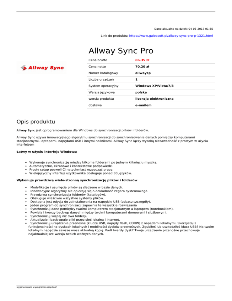 Dane aktualne na dzień: 04-03-2017 01:35 Link do produktu: https://www.galeosoft.pl/allway-sync-pro-p-1321.html Allway Sync Pro Cena brutto 86.35 zł Cena netto 70.20 zł Numer katalogowy allwaysp Liczba urządzeń 1 System operacyjny Windows XP/Vista/7/8 Wersja językowa polska wersja produktu licencja elektroniczna dostawa e-mailem Opis produktu Allway Sync jest oprogramowaniem dla Windows do synchronizacji plików i folderów. Allway Sync używa innowacyjnego algorytmu synchronizacji do synchronizowania danych pomiędzy komputerami stacjonarnymi, laptopami, napędami USB i innymi nośnikami. Allway Sync łączy wysoką niezawodność z prostym w użyciu interfejsem Łatwy w użyciu interfejs Windows: Wykonuje synchronizację między kilkoma folderami po jednym kliknięciu myszką. Automatyczne, ekranowe i kontekstowe podpowiedzi. Prosty setup pozwoli Ci natychmiast rozpocząć pracę. Wielojęzyczny interfejs użytkownika obsługuje ponad 30 języków. Wykonuje prawdziwą wielo-stronną synchronizację plików i folderów Modyfikacje i usunięcia plików są śledzone w bazie danych. Innowacyjne algorytmy nie opierają się o dokładność zegara systemowego. Prawdziwa synchronizacja folderów (katalogów). Obsługuje właściwie wszystkie systemy plików. Dostępna jest edycja do zainstalowania na napędzie USB (zobacz szczegóły). Jeden program do synchronizacji zapewnia te wszystkie rozwiązania Synchronizuj dane pomiędzy twoimi komputerem stacjonarnym a laptopem (notebookiem). Powiela i tworzy back-up danych między twoimi komputerami domowymi i służbowymi. Synchronizuj więcej niż dwa foldery. Aktualizuje i back-upuje pliki przez sieć lokalną i Internet. Synchronizuj urządzenia przenośne (klucze USB, napędy flash, CDRW) z napędami lokalnymi. Skorzystaj z funkcjonalności na dyskach lokalnych i mobilności dysków przenośnych. Zgubiłeś lub uszkodziłeś klucz USB? Na twoim lokalnym napędzie zawsze masz aktualną kopię. Padł twardy dysk? Twoje urządzenie przenośne przechowuje najaktualniejsze wersja twoich ważnych danych. wygenerowano w programie shopGold Powered by TCPDF (www.tcpdf.org)