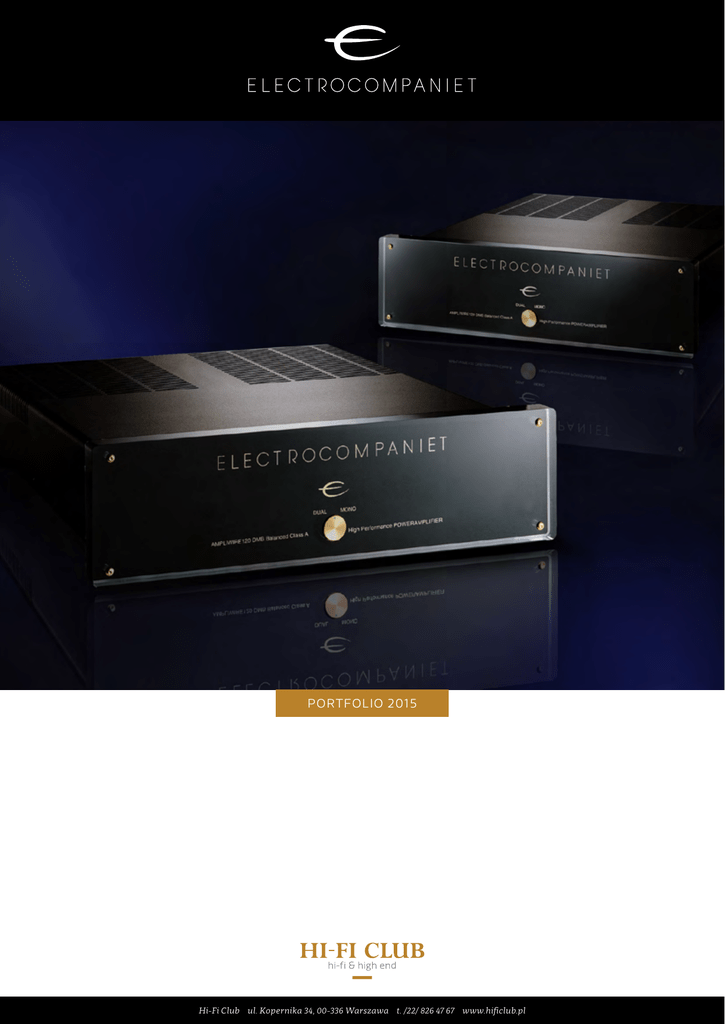 PORTFOLIO 2015 Hi-Fi Club ul. Kopernika 34, 00-336 Warszawa t. /22/ 826 47 67 www.hificlub.pl PORTFOLIO 2015 SERIA CLASSIC – ŹRÓD ŁA – – WZM. ZINTEGROWANE – str. 3 str. 8 – PRZEDWZMACNIACZE – – WZMACNIACZE MOCY – str. 11 str. 14 SERIA PRELUDE – ŹRÓD ŁA – str. 18 ZESTAWY GŁOŚNIKOWE str. 23 – WZM. ZINTEGROWANE – str. 20 AKCESORIA str. 24 Hi-Fi Club ul. Kopernika 34, 00-336 Warszawa t. /22/ 826 47 67 www.hificlub.pl SERIA CLASSIC / ŹRÓDŁA – ECC1 – Napięcie wyjściowe: 2.3/4.6 Vrms (niesymetr./symetr.) Poziom tła: <-130 dB Odchylenia w paśmie: < 0.05 dB (20-20 000Hz) Separacja kanałów: > 110 dB Zniekształcenia THD + N: < 0.002% Konwersja cyfrowo-analogowa: 24-bit/192-kHz Zakres dynamiki: 120 dB Formaty: CD, HDCD, CD-R/RW, MP3, WMA Pobór energii: 35 W W tym odtwarzaczu zastosowaliśmy nowoczesne technologie produkcji, by obniżyć koszty wytworzenia, a jednocześnie utrzymać jakość dĽwięku na poziomie porównywalnym z najlepszymi. Mechanizm oparto na doskonałym systemie antywibracyjnym zastosowanym w modelu referencyjnym EMC 1UP. Odtwarzacz ma wyjścia zarówno symetryczne (XLR) jak i niesymetryczne (RCA) oraz cyfrowe wyjście koaksjalne. Bazą dla precyzyjnego, delikatnego, ale i dynamicznego dźwięku są: przetwornik C/A 24-bit/192-kHz, najnowszy produkt firmy Cirrus Logic, oraz sekcja analogowa - w pełni zbalansowany układ działający w klasie A. Analogowy filtr wyjściowy został zoptymalizowany pod kątem redukcji przesunięć fazowych przy wyższych częstotliwościach, które dzięki temu nabrały większej spójności. -3- Hi-Fi Club ul. Kopernika 34, 00-336 Warszawa t. /22/ 826 47 67 www.hificlub.pl SERIA CLASSIC / ŹRÓDŁA – EMC 1 UP – Napięcie wyjściowe: 2.3/4.6 Vrms (niesymetr./symetr.) Poziom tła: <-125 dB Odchylenia w paśmie: < 0.1 dB (20-20 000Hz) Separacja kanałów: > 90 dB Zniekształcenia THD + N: < 0.003% Konwersja cyfrowo-analogowa: 24-bit/192-kHz Zakres dynamiki: 120 dB Formaty: CD, CD-R/RW Pobór energii: 23 W EMC 1 UP oparto na unikalnym systemie eliminacji wszelkich mechanicznych i akustycznych wibracji, który chroni wkładkę laserową przed szkodliwymi, degradującymi sygnał rezonansami. Odtwarzacz ma nowy projekt w pełni zbalansowanych obwodów sygnałowych. Są one zasilane w opracowanej przez nas technologii FTT (Floating Transformer Technology). Użyty upsampler obniża poziom szumu tła o 10 dB, poszerzając jednocześnie pasmo przenoszenia o dwie oktawy w górę, co umożliwiło użycie filtra o spadku 6 dB w stopniu wyjściowym. -4- Hi-Fi Club ul. Kopernika 34, 00-336 Warszawa t. /22/ 826 47 67 www.hificlub.pl SERIA CLASSIC / ŹRÓDŁA – EMP 3 – Obsługiwane formaty Audio: Dolby True HD, DTS-HD Master Obsługiwane formaty Video: skalowanie do rozdzielczości 4K, obsługa formatu 24 klatek na sekundę, Blu-ray 2D/3D, Full HD 1080p, BD-Live (Profil 2.0), BonusVIEW, HDMI 1.4a Media: CD, DVD, SACD, DVD-Audio, Blu-ray 2D & 3D Streaming: DLNA Certified, Ethernet/WiFi Możliwości podłączenia: Dwa wyjścia HDMI 1.4a, jedno wejście HDMI, 2 x USB2.0, RS232, Ethernet i sieć bezprzewodowa, wielokanałowe audio 7.1, XLR stereo. EMP 3 to wszechstronne urządzenie obsługujące wszystkie najnowsze formaty dźwięku i obrazu. Nowe rozwiązania wprowadzone do EMP 3 to: skalowanie obrazu do rozdzielczości 4K (3840 x 2160), wejście HDMI oraz procesor dwurdzeniowy umożliwiający szybszy start i odczytywanie płyt. Dzięki konwersji 2D do 3D, standardowe płyty DVD, Blu-ray i inne materiały wideo uzyskają trójwymiarowy obraz, poprzez proste wciśnięcie przycisku na pilocie. Specjalne filtry usuwają szum wysokich częstotliwości, przy jednoczesnym zachowaniu oryginalnej charakterystyki amplitudy i fazy sygnału. Najnowocześniejszy procesor obrazu Qdeo Kyoto-G2H firmy Marvell zastosowany w celu optymalnej jakości odtwarzania formatu Blu-ray, zapewnia naturalny obraz bez występowania niepożądanych szumów ani innych szkodliwych artefaktów. EMP 3 to prawdziwe urządzenie wieloformatowe, które doskonale spisuje się jako centrum multimediów w systemie wielokanałowego kina domowego oraz jako stereofoniczny odtwarzacz CD/SACD. EMP 3 posiada gniazda wyjściowe sygnału typu RCA i XLR, co jest typowe dla produktów firmy Electrocompaniet. Zbalansowane gniazda XLR zapewniają wysokiej jakości odtwarzanie dźwięku w trybie stereofonicznym, w posiadanym zestawie audio. Cechy charakterystyczne EMP 3: Format CD – PCM jest przetwarzany do jakości 192kHz/24bitów, zanim zostanie przesłany do przetworników cyfrowo-analogowych. Odtwarzanie płyt SACD w trybie stereofonicznym i wielokanałowym, przy użyciu technologii DSD. Sygnał DSD jest przesyłany bezpośrednio z płyty do przetworników cyfrowo-analogowych. Up-skalowanie 4K – skalowanie wszystkich źródeł wideo do rozdzielczości 3840x2160, co oznacza czterokrotną poprawę jakości materiału wideo w porównaniu do rozdzielczości Full HD 1080p. -5- Hi-Fi Club ul. Kopernika 34, 00-336 Warszawa t. /22/ 826 47 67 www.hificlub.pl SERIA CLASSIC / ŹRÓDŁA – ECD 2 – ZBALANSOWANY PRZETWORNIK CYFROWO-ANALOGOWY Jakość sygnału upsamplingu: 192kHz, 24bit Próbkowanie: wejście USB: 32 kHz do 192 kHz, asynchroniczne wejście koaksjalne: 32 kHz do 192 kHz, 24 bit wejście optyczne: 32 kHz do 192 kHz, 24 bit THD+N: mniejsza niż 0.0005% Wejścia: USB 2.0, 2x optyczne, 2 x koaksjalne Wyjścia: Stereofoniczne analogowe RCA oraz XLR Coraz więcej osób nabiera zaufania do przechowywania oraz odtwarzania swojej ulubionej muzyki za pomocą takich źródeł cyfrowych jak komputery, iPody i urządzenia służące do przechowywania danych. Tego rodzaju rozwiązanie jest bardzo wygodne i użyteczne, ale często jakość dźwięku odtwarzanego z powyższych komponentów nie jest taka jakiej się spodziewamy – mamy wrażenie jakbyśmy tracili coś z pasji i uczuć zapisanych w muzyce. W ECD 2 udało się połączyć nowoczesne rozwiązania w zakresie 