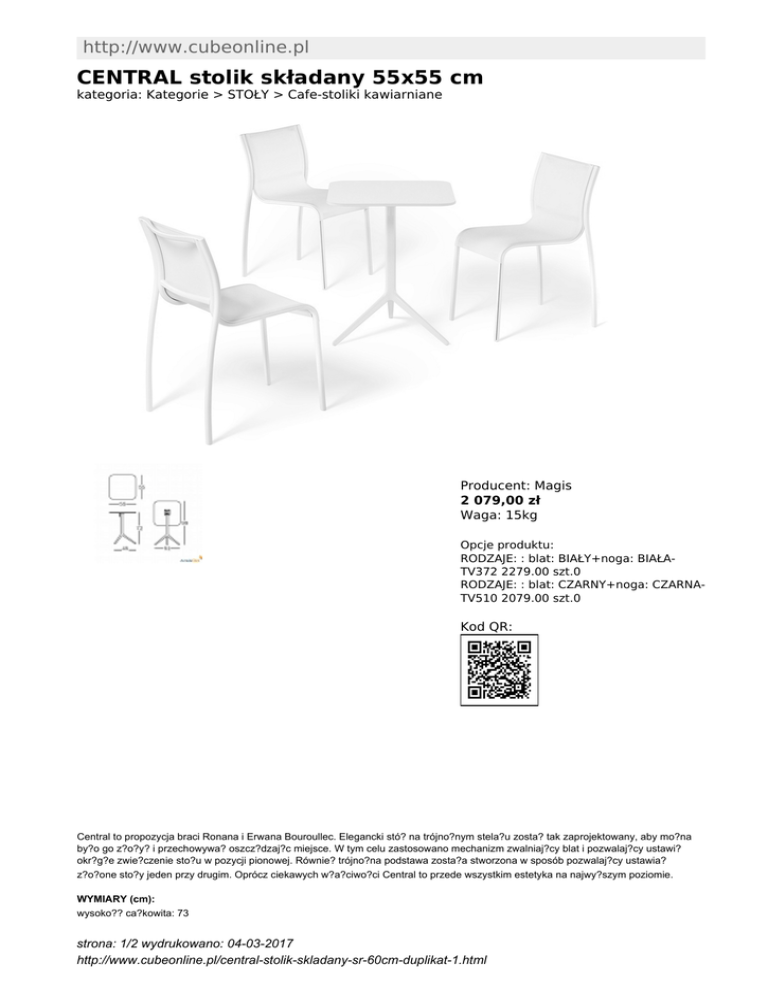 http://www.cubeonline.pl CENTRAL stolik składany 55x55 cm kategoria: Kategorie > STOŁY > Cafe-stoliki kawiarniane Producent: Magis 2 079,00 zł Waga: 15kg Opcje produktu: RODZAJE: : blat: BIAŁY+noga: BIAŁATV372 2279.00 szt.0 RODZAJE: : blat: CZARNY+noga: CZARNATV510 2079.00 szt.0 Kod QR: Central to propozycja braci Ronana i Erwana Bouroullec. Elegancki stó? na trójno?nym stela?u zosta? tak zaprojektowany, aby mo?na by?o go z?o?y? i przechowywa? oszcz?dzaj?c miejsce. W tym celu zastosowano mechanizm zwalniaj?cy blat i pozwalaj?cy ustawi? okr?g?e zwie?czenie sto?u w pozycji pionowej. Równie? trójno?na podstawa zosta?a stworzona w sposób pozwalaj?cy ustawia? z?o?one sto?y jeden przy drugim. Oprócz ciekawych w?a?ciwo?ci Central to przede wszystkim estetyka na najwy?szym poziomie. WYMIARY (cm): wysoko?? ca?kowita: 73 strona: 1/2 wydrukowano: 04-03-2017 http://www.cubeonline.pl/central-stolik-skladany-sr-60cm-duplikat-1.html d?ugo?? po z?o?eniu blatu: 99 szeroko?? blatu: 55 długość baltu: 55 ?rednica podstawy: 45x51 MATERIA?: blat: HPL -lamina bia?y lub czarny, polerowane aluminium noga: aluminium lakierowane na kolor bia?y lub czarny- wersja na zewn?trz INNE: stó? ma sk?adany blat, co zncznie u?atwia magazynowanie stolika Inne produkty Magis: http://www.cubeonline.pl/manufacturer/magis Inne produkty projektanta: http://www.cubeonline.pl/designer/bouroullec-ronan-erwan strona: 2/2 wydrukowano: 04-03-2017 http://www.cubeonline.pl/central-stolik-skladany-sr-60cm-duplikat-1.html