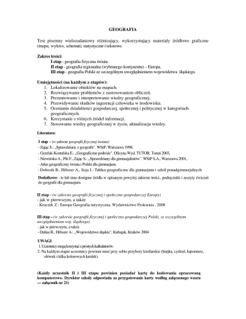 GEOGRAFIA Test pisemny wielozadaniowy różnicujący, wykorzystujący materiały źródłowe graficzne (mapa, wykres, schemat), statystyczne i tekstowe. Zakres treści: I etap - geografia fizyczna świata. II etap - geografia regionalna (wybranego kontynentu) – Europa. III etap - geografia Polski ze szczególnym uwzględnieniem województwa śląskiego. Umiejętności (na każdym z etapów): 1. Lokalizowanie obiektów na mapach. 2. Rozwiązywanie problemów z zastosowaniem obliczeń. 3. Prezentowanie i interpretowanie wiedzy geograficznej. 4. Przewidywanie skutków ingerencji człowieka w środowisku. 5. Ocenianie działalności gospodarczej, społecznej i politycznej w kategoriach geograficznych. 6. Korzystanie z różnych źródeł informacji. 7. Stosowanie wiedzy geograficznej w życiu, aktualizacja wiedzy. Literatura: I etap - (w zakresie geografii fizycznej świata) - Zając S.: „Sprawdziany z geografii". WSiP, Warszawa 1998, - Grzelak-Kostulska E.: „Geograficzne podróże". Oficyna Wyd. TUTOR, Toruń 2003, - Niewińska A., Plit F., Zając S.: „Sprawdziany dla gimnazjalistów". WSiP S.A., Warszawa 2001, - Atlas geograficzny świata i Polski dla gimnazjum. - Dobosik B., Hibszer A., Soja J.: Tablice geograficzne dla gimnazjum i szkół ponadgimnazjalnych Dodatkowo - te lub inne dostępne źródła w opisanym powyżej zakresie treści., podręczniki i zeszyty ćwiczeń do geografii dla gimnazjum. II etap - (w zakresie geografii fizycznej i społeczno-gospodarczej Europy) - jak w pierwszym, a także - Kruczek Z.: Europa Geografia turystyczna, Wydawnictwo Proksenia , 2008 III etap – (w zakresie geografii fizycznej i społeczno-gospodarczej Polski, ze szczególnym uwzględnieniem woj. śląskiego) - jak w pierwszym, a także - Dulias R., Hibszer A.: „Województwo śląskie", Kubajak, Kraków 2004 UWAGI 1. Uczestnicy mogą korzystać z prostych kalkulatorów. 2. Na każdym etapie uczestnicy powinni mieć przy sobie przybory kreślarskie (linijkę, cyrkiel, kątomierz, ołówek i kilka kolorowych kredek). (Każdy uczestnik II i III etapu powinien posiadać kartę do kodowania opracowaną komputerowo. Dyrektor szkoły odpowiada za przygotowanie karty według załączonego wzoru — załącznik nr 21)