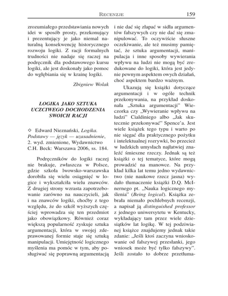 Recenzje zrozumiałego przedstawiania nowych idei w sposób prosty, przekonujący i prezentujący je jako niemal naturalną konsekwencję historycznego rozwoju logiki. Z racji formalnych trudności nie nadaje się raczej na podręcznik dla podstawowego kursu logiki, ale jest doskonały jako pomoc do wgłębiania się w krainę logiki. Zbigniew Wolak LOGIKA JAKO SZTUKA UCZCIWEGO DOCHODZENIA SWOICH RACJI ⋄ Edward Nieznański, Logika. Podstawy — język — uzasadnienie, 2. wyd. zmienione, Wydawnictwo C.H. Beck: Warszawa 2006, ss. 184. Podręczników do logiki raczej nie brakuje, zwłaszcza w Polsce, gdzie szkoła lwowsko-warszawska dorobiła się wielu osiągnięć w logice i wykształciła wielu znawców. Z drugiej strony wzrasta zapotrzebowanie zarówno na nauczycieli, jak i na znawców logiki, choćby z tego względu, że do szkół wyższych częściej wprowadza się ten przedmiot jako obowiązkowy. Również coraz większą popularność zyskuje sztuka argumentacji, która w swojej zdeprawowanej formie staje się sztuką manipulacji. Umiejętność logicznego myślenia ma pomóc w tym, aby posługiwać się poprawną argumentacją 159 i nie dać się złapać w sidła argumentów fałszywych czy nie dać się zmanipulować. To oczywiście słuszne oczekiwanie, ale też musimy pamiętać, że sztuka argumentacji, manipulacja i inne sposoby wywierania wpływu na ludzi nie mogą być zredukowane do logiki, która jest jedynie pewnym aspektem owych działań, choć aspektem bardzo ważnym. Ukazują się książki dotyczące argumentacji i w ogóle technik przekonywania, na przykład doskonała „Sztuka argumentacji” Wieczorka czy „Wywieranie wpływu na ludzi” Cialdiniego albo „Jak skutecznie przekonywać” Spence’a. Jest wiele książek tego typu i warto po nie sięgać dla praktycznego pożytku i intelektualnej rozrywki, bo przecież w ludzkich umysłach najłatwiej znaleźć śmieszne rzeczy. Jednak są też książki o tej tematyce, które mogą prowadzić na manowce. Na przykład kilka lat temu jedno wydawnictwo (nie naukowe rzecz jasna) wydało tłumaczenie książki D.Q. McInernego pt. „Nauka logicznego myślenia” (Being logical). Książka zebrała niemało pochlebnych recenzji, a napisał ją distinguished professor z jednego uniwersytetu w Kentucky, wykładający tam przez wiele dziesiątków lat logikę. W tej podziwianej książce znajdujemy jednak takie zdanie: „Jeśli ktoś zaczyna wnioskowanie od fałszywej przesłanki, jego wniosek może być tylko fałszywy”. Jeśli zostało to dobrze przetłuma- 160 Recenzje czone (jeśli źle, odpowiedzialność spada na tłumaczkę, a inne fragmenty dowodzą, że nie ma ona dużego pojęcia o logice), to mamy znak, że trzeba się od takiej książki trzymać z daleka. Każdy przecież, kto choćby z daleka otarł się o logikę, wie, że błąd w rozumowaniu prowadzi do wniosku o nieznanej wartości logicznej, o ile oczywiście nie znamy jej skądinąd. Chodzi o to, że dostrzegamy dziś zapotrzebowanie na opracowania dotyczące logicznego myślenia, ale nie zawsze zapotrzebowanie to jest zaspokajane na wystarczającym poziomie. Na tle tej sytuacji podręcznik prof. Nieznańskiego jest ciekawą propozycją. Nie jest to opracowanie popularne, ponieważ służy jako pomoc dla studentów, ale posiada ciekawy układ i kompetencje logiczne autora łączy z jego długą i wysoko cenioną praktyką dydaktyczną. Ponadto jest to podręcznik dla prawników, dla których umiejętność logicznego operowania prawem pisanym jest niezwykle ważna. Prawo pisane znajduje potwierdzenie tylko w tym, co zostało napisane, czyli nie ma innego rodzaju sprawdzianów, na przykład empirycznych. Jeśli rozumowanie przeprowadzone na podstawie ustaw będzie błędne, może zostać wydany niewłaściwy wyrok, a rzeczywistość go nie skoryguje. Natomiast gdy fizyk popełni błąd w rozumowaniu wykorzystującym prawa przyrody, przyroda może mu to bar- dzo wyraźnie uświadomić. Na przykład źle obliczona trajektoria pocisku da znać o sobie już w momencie jego wybuchu. W prawie poza porządną argumentacją trudno o inne sprawdziany słuszności rozumowania. Podobnie jest w filozofii i teologii. Wprawdzie teologia ma własne specyficzne źródła swoich tez, ale w tej części, gdzie jest rozumową refleksją, na pewno mniej lub bardziej jawnie korzysta z logiki. Jednocześnie niebezpieczne skłonności do nadużywania argumentacji i naciągania wniosków do naszych własnych oczekiwań też wymagają niemałej czujności, bo jak powiada Schopenhauer, „słabość naszego rozumu i przewrotność naszej woli wzajemnie się wspierają”. Natomiast dobrze uczona i praktykowana logika ma, jak przypomina autor za Arystotelesem, łączyć logos z etosem, czyli „logiczność rozumu z prawością woli”. Układ podręcznika odpowiada naszemu naturalnemu poznawaniu rzeczywistości. Na początku są ontologiczne podstawy logiki, czyli wyróżnienie rzeczy, cech, sytuacji i zbiorów, a następnie inne elementy, a wszystko ujęte w terminach logicznych. Takie podejście doskonale koresponduje z twierdzeniem Bocheńskiego, że logika jest najbardziej ogólną ontologią. Jednocześnie widzimy związek ontologii z logiką i dzięki temu objawia się jakaś fundamentalna racjonalność ontologicznego podejścia do świata, która jest Recenzje próbą rzetelnego opisu rzeczywistości. Autor skupia się na ontologii mnogości, w której logika odgrywa podstawową rolę. Następny rozdział mówi o języku i metajęzyku. Są one kolejnym etapem poznawania świata poprzez opis i komunikację, a to są przecież podstawowe funkcje języka. Omówione są znaki, rodzaje wyrażeń, problemy związane z wieloznacznością wypowiedzi oraz teoria definicji. Dopiero w ostatnim, trzecim rozdziale autor porusza kwestię uzasadnień, argumentacji. W wielu podręcznikach te zagadnienia pojawiają się na początku, ale tutaj dopiero na końcu omówione są pod