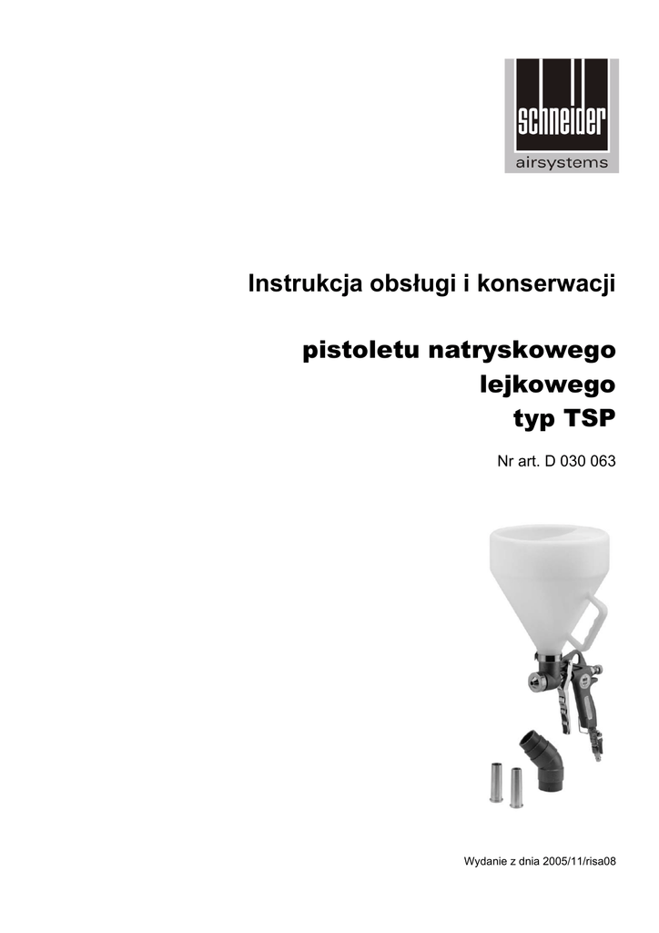 Instrukcja obsługi i konserwacji pistoletu natryskowego lejkowego typ TSP Nr art. D 030 063 Wydanie z dnia 2005/11/risa08 Bardzo dziękujemy za zaufanie, jakim obdarzyli Państwo nas i nasze produkty. Prosimy przeczytać najpierw dokładnie niniejszą instrukcję obsługi i konserwacji, zanim przystąpią Państwo do pracy z pistoletem natryskowym. Poniższa instrukcja zawiera ważne wskazówki, konieczne dla zapewnienia bezpiecznej pracy bez zakłóceń. Dlatego też instrukcja ta zawsze powinna być dołączona do pistoletu. Ważne wskazówki Zalecamy: kontroli, regulacji oraz konserwacji pistoletu natryskowego powinna dokonywać zawsze ta sama osoba lub delegowani przez nią przedstawiciele, a ponadto prace te powinny być dokumentowane w książce konserwacji. W przypadku pytań prosimy o podawanie numeru seryjnego, numer artykułu oraz oznaczenia pistoletu. Posługiwanie się instrukcją Dla zapewnienia przejrzystości niniejszej instrukcji oraz szybkiej orientacji, ważne oraz praktyczne wskazówki opatrzone zostały symbolami. Symbole te umieszczone są obok fragmentów tekstu (odnoszą się do tekstu), ilustracji (odnoszą się do danej ilustracji) lub na początku strony (odnoszą się do treści całej strony). Jeśli zakrętarka eksploatowana jest poza terenem Niemiec, w kwestii jej eksploatacji mogą obowiązywać inne przepisy ustaw i rozporządzeń niż wymienione w niniejszej instrukcji obsługi (np. dotyczące przyłącza elektrycznego oraz bezpieczeństwa eksploatacji). Uwaga: symbole te należy traktować z najwyższą uwagą! Znaczenie symboli Przeczytać instrukcję obsługi! Użytkownik zobowiązany jest do przestrzegania instrukcji obsługi oraz do poinstruowania wszystkich użytkowników pistoletu na temat zasad jej eksploatacji zgodnie z niniejszą instrukcją obsługi. Uwaga! Tym symbolem oznakowane są ważne opisy, informacje o niebezpiecznych warunkach, zagrożeniach lub wskazówki dotyczące bezpieczeństwa. Jakie czynności i warunki są absolutnie konieczne: Podczas pracy z pistoletem natryskowym używać specjalnych środków ochronnych, zwłaszcza nauszników przeciwhałasowych, siatki na włosy, okularów ochronnych i rękawic roboczych. Przestrzegać wskazówek dotyczących bezpieczeństwa! ____________________ 2 Schneider Druckluft Spis treści 1. Dane techniczne ....................................................................... 3 2. Zakres dostawy ........................................................................ 3 3. Ilustracja pistoletu natryskowego lejkowego.............................. 4 4. Użytkowanie zgodnie z przeznaczeniem .................................. 4 4.1 Właściwości ......................................................................... 4 5. Wskazówki dotyczące bezpieczeństwa ..................................... 5 6. Uruchamianie ............................................................................ 6 7. Konserwacja .............................................................................. 7 8. Usuwanie nieprawidłowości ....................................................... 8 9. Warunki gwarancji...................................................................... 9 10. Wyposażenie............................................................................ 9 11. Rysunek aksonometryczny i lista części zamiennych ……..… 10 11.1 Rysunek aksonometryczny pistoletu natryskowego lejkowego typ TSP ........................................................... 10 11.2 Lista części zamiennych pistoletu natryskowego lejkowego typ TSP............................................................ 10 12. Deklaracja zgodności z normami WE ...................................... 11 13. Adres........................................................................................ 12 1. Dane techniczne Zużycie powietrza: Maks. dopuszczalne ciśnienie robocze: Średnica dyszy do tynków: Średnica dyszy do kolorowych płatków typu „chips”: Pojemność pojemnika grawitacyjnego: Zalecana średnica przewodu (wewnętrzna) dla dł. = 10 m: Wymiary szer. x głęb. x wys.: Ciężar: Wymagania jakościowe dla powietrza: Wydajność sprężarki: Nastawne parametry robocze: 2. Zakres dostawy 225 5 4,5 / 6,0 / 8,0 15,0 / 18,0 l/min bar mm mm 5 6 l mm 250 x 235 x 475 1,26 mm kg Powietrze oczyszczone, pozbawione kondensatu i oleju. Sprężarka o wydajności wyjściowej min. 250 l/min (odpowiadającej mocy silnika ok. 2,2 kW) ze zbiornikiem o pojemności min. 50 l. Nastawione ciśnienie robocze (hydrauliczne) na reduktorze ciśnienia 1 – 4 bar. 1 pistolet natryskowy lejkowy typ TSP 3 dysze do tynków (średnica 4,5 / 6,0 / 8,0) 2 dysze do kolorowych płatków typu „chips” (średnica 15,0 / 18,0) 1 złączka – kolano 450 2 zaciski do przewodów 1 grawitacyjny pojemnik cieczy 5,0 l 1 iglica do kolorowych płatków typu „chips” 1 instrukcja obsługi pistoletu natryskowego lejkowego typ TSP _________________ Schneider Druckluft 3 3. Ilustracja pistoletu natryskowego lejkowego Pos. 0010 0020 0030 0040 0100 Nr art. G 427 172 B 030 350 B 030 351 B 030 352 G 427 179 0160 B 030 355 0170 E 132 050 0190 G 427 180 0210 G 427 173 0260 G 427 174 0270 B 030 353 0280 B 030 354 0290 G 012 033 0310 E 700 213 Opis Nakrętka złączkowa Da 39,0 x 13,6 Dysza D 4,5 mm do tynków Dysza D 6,0 mm do tynków Dysza D 8,0 mm do tynków Śruba regulacyjna kompletna z pierścieniem o-ring Pojemnik cieczy 5,0 l Zacisk do przewodów D 32-50 mm x 12,0 Dźwignia spustowa 150,4 x 26,0 x 6,2 Klamra ustalająca na spuście 33,0 x 1,6 x 30,0 Kolano 45) Dysza D 15,0 mm do kolorowych płatków typu „chips” Dysza D 18,0 mm do kolorowych płatków typu „chips” Minizawór kulkowy G 1/4"a x G 1/4”i Złączka wtykowa R1/4”a Ilość 1 1 1 1 1 1 1 1 1 1 1 1 1 1 4. Użytkowanie zgodnie z przeznaczeniem Pistolet typu TSP to poręczny, zasilany sprężonym powietrzem pistolet natryskowy lejkowy, idealny do nakładania tynków strukturalnych i ozd