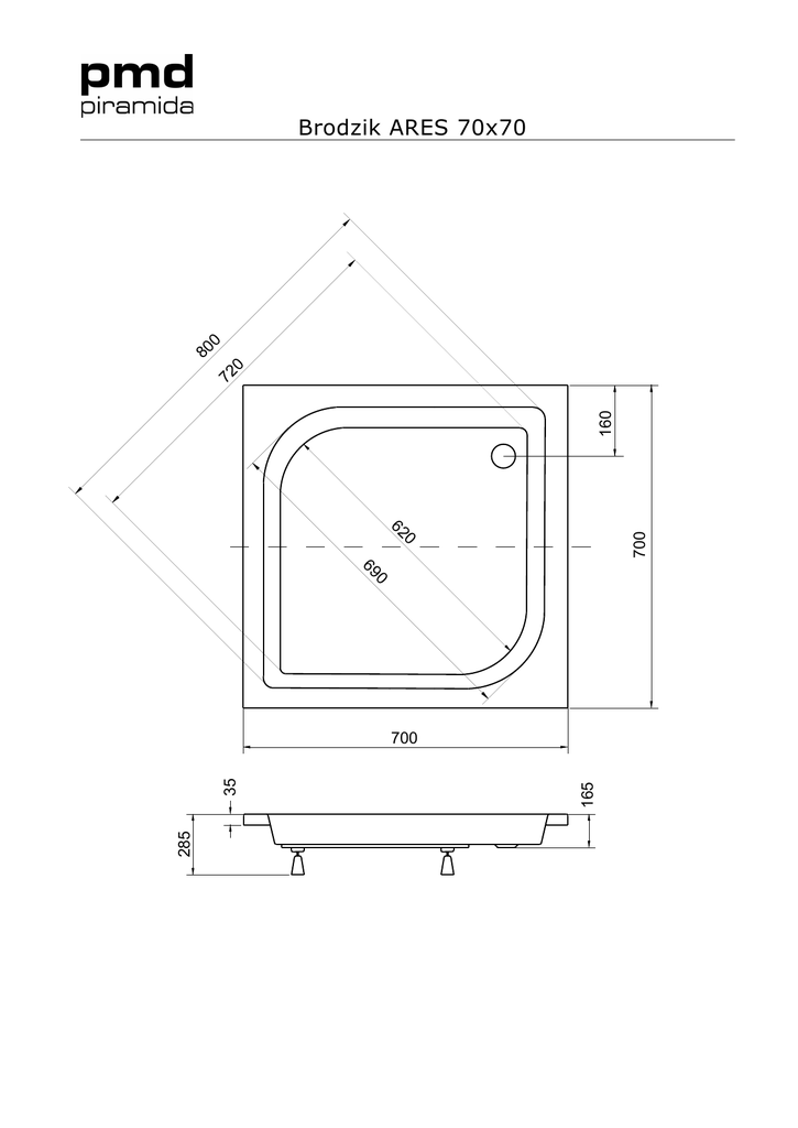 160 72 0 80 0 Brodzik ARES 70x70 0 700 62 0 69 285 165 35 700