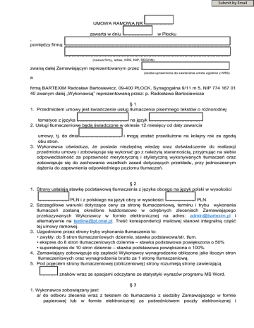Submit by Email UMOWA RAMOWA NR ...................... zawarta w dniu ....................... w Płocku , pomiędzy firmą: .....………………………………………………………………………………………... .…………………………………………………………………………………………… (nazwa firmy, adres, KRS, NIP, REGON) zwaną dalej Zamawiającym reprezentowanym przez …………………….………………………….. (osoba uprawniona do zawierania umów zgodnie z KRS) a firmą BARTEXIM Radosław Bartosiewicz, 09-400 PŁOCK, Synagogalna 9/11 m 5, NIP 774 167 01 40 zwanym dalej „Wykonawcą” reprezentowaną przez: p. Radosława Bartosiewicza §1 1. Przedmiotem umowy jest świadczenie usług tłumaczenia pisemnego tekstów o różnorodnej tematyce z języka ........................................ na język …………………………… . 2. Usługi tłumaczeniowe będą świadczone w okresie 12 miesięcy od daty zawarcia umowy, tj. do dnia………………………. i mogą zostać przedłużone na kolejny rok za zgodą obu stron. 3. Wykonawca oświadcza, że posiada niezbędną wiedzę oraz doświadczenie do realizacji przedmiotu umowy i zobowiązuje się wykonać go z należytą starannością, przyjmując na siebie odpowiedzialność za poprawność merytoryczną i stylistyczną wykonywanych tłumaczeń oraz zobowiązuje się do zachowania wszelkich zasad dotyczących przekładu, przy jednoczesnym dążeniu do zapewnienia odpowiedniego poziomu tłumaczeń. §2 1. Strony ustalają stawkę podstawową tłumaczenia z języka obcego na język polski w wysokości ……………….. PLN i z polskiego na język obcy w wysokości ……………….. PLN. 2. Szczegółowe warunki dotyczące ceny za stronę tłumaczeniową, terminu i trybu wykonania tłumaczeń zostaną określone każdorazowo w odrębnych zleceniach Zamawiającego przekazywanych Wykonawcy w formie elektronicznej na adres: [email protected] i alternatywnie na [email protected]. Treść korespondencji mailowej stanowi integralną część tej umowy ramowej. 3. Uzgodnione przez strony tryby wykonania tłumaczenia to: • zwykły: do 5 stron tłumaczeniowych dziennie, stawka podstawowa/str. tłum. • ekspres do 8 stron tłumaczeniowych dziennie – stawka podstawowa powiększona o 50% • superekspres do 10 stron dziennie – stawka podstawowa powiększona o 100% 4. Zamawiający zobowiązuje się zapłacić Wykonawcy wynagrodzenie obliczone jako iloczyn stron tłumaczeniowych oraz wynagrodzenia brutto za 1 stronę tłumaczeniową. 5. Pod pojęciem strony tłumaczeniowej (obliczeniowej) strony rozumieją stronę zawierającą ………… znaków wraz ze spacjami odczytane ze statystyki wyrazów programu MS Word. §3 1. Wykonawca zobowiązany jest: a/ do odbioru zlecenia wraz z tekstem do tłumaczenia z siedziby Zamawiającego w formie papierowej lub w formie elektronicznej za pośrednictwem poczty elektronicznej i dostarczenia przetłumaczonego tekstu w formie elektronicznej i papierowej do siedziby Zamawiającego. Za termin wykonania tłumaczeń uważa się dzień dostarczenia tłumaczeń w formie elektronicznej na pocztę elektroniczną, a tłumaczenia w formie papierowej pocztą lub osobiście do siedziby Zamawiającego. b/ do zachowania szaty graficznej oryginału; c/ do zachowania tajemnicy handlowej dotyczącej przedmiotu i treści wykonywanych tłumaczeń d/ do wykonania tłumaczeń z własnych materiałów i przy wykorzystaniu własnych urządzeń, a wszelkie wydatki związane z wykonaniem tłumaczeń ponosi Wykonawca. 2. W przypadku stwierdzenia przez Zamawiającego, że tłumaczenie zostało wykonane nieprawidłowo, Zamawiającemu przysługuje prawo do zgłoszenia reklamacji w ciągu 3 dni roboczych od daty otrzymania wykonanego tłumaczenia. 3. Po zgłoszeniu przez Zamawiającego reklamacji w terminie, o którym mowa w ust. 2, Wykonawca zobowiązany jest do bezpłatnego poprawienia tłumaczenia w terminie 3 dni roboczych i przekazania Zamawiającemu poprawionego tłumaczenia do akceptacji. 4. Zamawiający zastrzega sobie prawo do zgłoszenia w terminie 2 dni roboczych zastrzeżeń do poprawionego tłumaczenia i wezwania Wykonawcy do ich uwzględnienia i przekazania ostatecznej wersji tłumaczenia, w terminie 2 dni roboczych od dnia wezwania Wykonawcy. §4 1. Zamawiający zobowiązuje się do zapłaty wynagrodzenia za tłumaczenia, po otrzymaniu faktury VAT Wykonawcy w terminie 14 dni od daty wystawienia faktury przelewem na rachunek Wykonawcy podany w fakturze. 2. Za termin dokonania płatności uważa się datę złożenia w banku przez Zamawiającego polecenia przelewu na rachunek bankowy Wykonawcy i przesłanie w tym samym dniu skanu potwierdzenia przelewu na adres mailowy Wykonawcy. §5 Wykonawca oświadcza, że jest wyłącznym podmiotem majątkowych i osobistych praw autorskich powstałych w wyniku wykonania niniejszej umowy i że dysponowanie tymi prawami nie narusza praw osób trzecich. W tym miejscu Wykonawca rezygnuje w pełnym przewidzianym prawem zakresie z wyżej wymienionych praw autorskich i przenosi je w ramach uzgodnionej kwoty wynagrodzenia na Zamawiającego. 2. Jeżeli Zamawiający stwierdzi, że Wykonawca wykonuje przedmiot zamówienia w sposób wadliwy albo sprzeczny z umową może wezwać Wykonawcę do zmiany sposobu wykonania umowy i wyznaczyć w tym celu odpowiedni termin. Po bezskutecznym upływie wyznaczonego terminu, Zamawiający może odstąpić od umowy albo powierzyć poprawianie lub dalsze wykonanie zamówienia innej firmie na koszt i odpowiedzialność Wykonawcy. 3. Strony umowy zastrzegają możliwość rozwiązania niniejszej umowy za dwutygodniowym okresem wypowiedzenia. 4. Wszelkie spory czy roszczenia miedzy Stronami wynikające z niniejszej umowy, powinny być rozwiązywane bez zbędnej zwłoki – droga negocjacji między Stronami, a w przypadku niepowodzenia tych negocjacji, zaistniałe spory będzie rozstrz