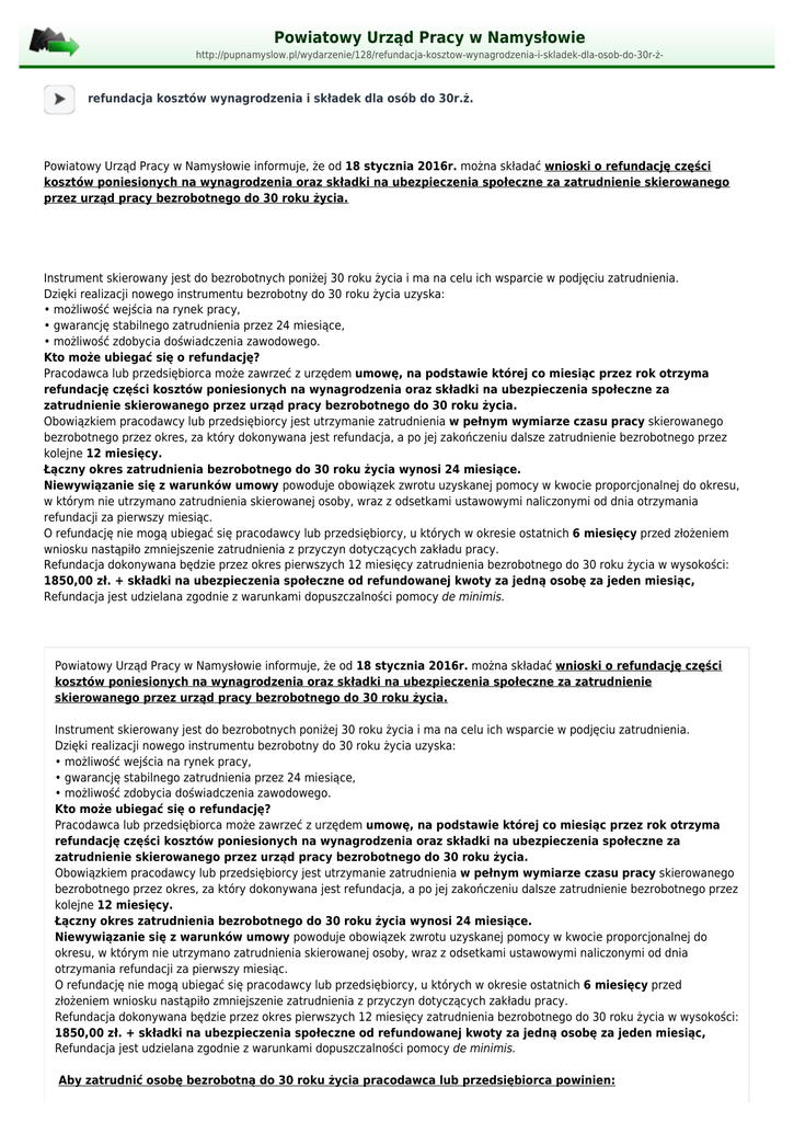 Powiatowy Urząd Pracy w Namysłowie http://pupnamyslow.pl/wydarzenie/128/refundacja-kosztow-wynagrodzenia-i-skladek-dla-osob-do-30r-ż- refundacja kosztów wynagrodzenia i składek dla osób do 30r.ż. Powiatowy Urząd Pracy w Namysłowie informuje, że od 18 stycznia 2016r. można składać wnioski o refundację części kosztów poniesionych na wynagrodzenia oraz składki na ubezpieczenia społeczne za zatrudnienie skierowanego przez urząd pracy bezrobotnego do 30 roku życia. Instrument skierowany jest do bezrobotnych poniżej 30 roku życia i ma na celu ich wsparcie w podjęciu zatrudnienia. Dzięki realizacji nowego instrumentu bezrobotny do 30 roku życia uzyska: • możliwość wejścia na rynek pracy, • gwarancję stabilnego zatrudnienia przez 24 miesiące, • możliwość zdobycia doświadczenia zawodowego. Kto może ubiegać się o refundację? Pracodawca lub przedsiębiorca może zawrzeć z urzędem umowę, na podstawie której co miesiąc przez rok otrzyma refundację części kosztów poniesionych na wynagrodzenia oraz składki na ubezpieczenia społeczne za zatrudnienie skierowanego przez urząd pracy bezrobotnego do 30 roku życia. Obowiązkiem pracodawcy lub przedsiębiorcy jest utrzymanie zatrudnienia w pełnym wymiarze czasu pracy skierowanego bezrobotnego przez okres, za który dokonywana jest refundacja, a po jej zakończeniu dalsze zatrudnienie bezrobotnego przez kolejne 12 miesięcy. Łączny okres zatrudnienia bezrobotnego do 30 roku życia wynosi 24 miesiące. Niewywiązanie się z warunków umowy powoduje obowiązek zwrotu uzyskanej pomocy w kwocie proporcjonalnej do okresu, w którym nie utrzymano zatrudnienia skierowanej osoby, wraz z odsetkami ustawowymi naliczonymi od dnia otrzymania refundacji za pierwszy miesiąc. O refundację nie mogą ubiegać się pracodawcy lub przedsiębiorcy, u których w okresie ostatnich 6 miesięcy przed złożeniem wniosku nastąpiło zmniejszenie zatrudnienia z przyczyn dotyczących zakładu pracy. Refundacja dokonywana będzie przez okres pierwszych 12 miesięcy zatrudnienia bezrobotnego do 30 roku życia w wysokości: 1850,00 zł. + składki na ubezpieczenia społeczne od refundowanej kwoty za jedną osobę za jeden miesiąc, Refundacja jest udzielana zgodnie z warunkami dopuszczalności pomocy de minimis. Powiatowy Urząd Pracy w Namysłowie informuje, że od 18 stycznia 2016r. można składać wnioski o refundację części kosztów poniesionych na wynagrodzenia oraz składki na ubezpieczenia społeczne za zatrudnienie skierowanego przez urząd pracy bezrobotnego do 30 roku życia. Instrument skierowany jest do bezrobotnych poniżej 30 roku życia i ma na celu ich wsparcie w podjęciu zatrudnienia. Dzięki realizacji nowego instrumentu bezrobotny do 30 roku życia uzyska: • możliwość wejścia na rynek pracy, • gwarancję stabilnego zatrudnienia przez 24 miesiące, • możliwość zdobycia doświadczenia zawodowego. Kto może ubiegać się o refundację? Pracodawca lub przedsiębiorca może zawrzeć z urzędem umowę, na podstawie której co miesiąc przez rok otrzyma refundację części kosztów poniesionych na wynagrodzenia oraz składki na ubezpieczenia społeczne za zatrudnienie skierowanego przez urząd pracy bezrobotnego do 30 roku życia. Obowiązkiem pracodawcy lub przedsiębiorcy jest utrzymanie zatrudnienia w pełnym wymiarze czasu pracy skierowanego bezrobotnego przez okres, za który dokonywana jest refundacja, a po jej zakończeniu dalsze zatrudnienie bezrobotnego przez kolejne 12 miesięcy. Łączny okres zatrudnienia bezrobotnego do 30 roku życia wynosi 24 miesiące. Niewywiązanie się z warunków umowy powoduje obowiązek zwrotu uzyskanej pomocy w kwocie proporcjonalnej do okresu, w którym nie utrzymano zatrudnienia skierowanej osoby, wraz z odsetkami ustawowymi naliczonymi od dnia otrzymania refundacji za pierwszy miesiąc. O refundację nie mogą ubiegać się pracodawcy lub przedsiębiorcy, u których w okresie ostatnich 6 miesięcy przed złożeniem wniosku nastąpiło zmniejszenie zatrudnienia z przyczyn dotyczących zakładu pracy. Refundacja dokonywana będzie przez okres pierwszych 12 miesięcy zatrudnienia bezrobotnego do 30 roku życia w wysokości: 1850,00 zł. + składki na ubezpieczenia społeczne od refundowanej kwoty za jedną osobę za jeden miesiąc, Refundacja jest udzielana zgodnie z warunkami dopuszczalności pomocy de minimis. Aby zatrudnić osobę bezrobotną do 30 roku życia pracodawca lub przedsiębiorca powinien: 1. Złożyć w Powiatowym Urzędzie Pracy w Namysłowie (PUP) Wniosek o zawarcie umowy dotyczącej refundacji pracodawcy lub przedsiębiorcy przez okres 12 miesięcy części kosztów poniesionych na wynagrodzenia, nagrody oraz składki na ubezpieczenia społeczne skierowanych bezrobotnych do 30 roku życia wraz z Formularzem informacji przedstawianych przy ubieganiu się o pomoc de minimis, stanowiącym załącznik do rozporządzenia Rady Ministrów z dnia 24 listopada 2014 r. zmieniającego rozporządzenie w sprawie zakresu informacji przedstawianych przez podmiot ubiegający się o pomoc de minimis (Dz. U. z 2014r., poz. 1543). 2. W przypadku pozytywnego rozpatrzenia wniosku podpisać umowę z PUP. 3. Zatrudnić osobę bezrobotną skierowaną przez PUP na podstawie umowy o pracę na okres co najmniej 24 miesięcy. Dodatkoweinformacje można uzyskać : tel. 774190931