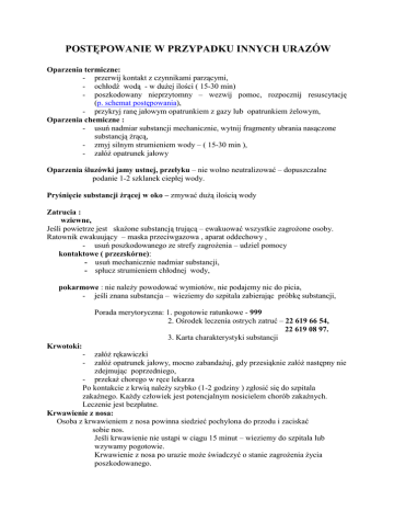 POSTĘPOWANIE W PRZYPADKU INNYCH URAZÓW Oparzenia termiczne: - przerwij kontakt z czynnikami parzącymi, - ochłodź wodą - w dużej ilości ( 15-30 min) - poszkodowany nieprzytomny – wezwij pomoc, rozpocznij resuscytację (p. schemat postępowania), - przykryj ranę jałowym opatrunkiem z gazy lub opatrunkiem żelowym, Oparzenia chemiczne : - usuń nadmiar substancji mechanicznie, wytnij fragmenty ubrania nasączone substancją żrącą, - zmyj silnym strumieniem wody – ( 15-30 min ), - załóż opatrunek jałowy Oparzenia śluzówki jamy ustnej, przełyku – nie wolno neutralizować – dopuszczalne podanie 1-2 szklanek ciepłej wody. Pryśnięcie substancji żrącej w oko – zmywać dużą ilością wody Zatrucia : wziewne, Jeśli powietrze jest skażone substancją trującą – ewakuować wszystkie zagrożone osoby. Ratownik ewakuujący – maska przeciwgazowa , aparat oddechowy , - usuń poszkodowanego ze strefy zagrożenia – udziel pomocy kontaktowe ( przezskórne): - usuń mechanicznie nadmiar substancji, - spłucz strumieniem chłodnej wody, pokarmowe : nie należy powodować wymiotów, nie podajemy nic do picia, - jeśli znana substancja – wieziemy do szpitala zabierając próbkę substancji, Porada merytoryczna: 1. pogotowie ratunkowe - 999 2. Ośrodek leczenia ostrych zatruć – 22 619 66 54, 22 619 08 97. 3. Karta charakterystyki substancji Krwotoki: załóż rękawiczki załóż opatrunek jałowy, mocno zabandażuj, gdy przesiąknie załóż następny nie zdejmując poprzedniego, - przekaż chorego w ręce lekarza Po kontakcie z krwią należy szybko (1-2 godziny ) zgłosić się do szpitala zakaźnego. Każdy człowiek jest potencjalnym nosicielem chorób zakaźnych. Leczenie jest bezpłatne. Krwawienie z nosa: Osoba z krwawieniem z nosa powinna siedzieć pochylona do przodu i zaciskać sobie nos. Jeśli krwawienie nie ustąpi w ciągu 15 minut – wieziemy do szpitala lub wzywamy pogotowie. Krwawienie z nosa po urazie może świadczyć o stanie zagrożenia życia poszkodowanego. - Złamania: - złamanie otwarte – załóż opatrunek jałowy, unieruchom złamaną kończynę, zapewnij transport do lekarza Ból w klatce piersiowej: zawał serca: - Objawy: ucisk w obrębie klatki piersiowej, trudności z oddychaniem, potliwość, - Dzwoń po pogotowie , - Jeśli zechce wziąć swoją własną nitroglicerynę - może wziąć 1 tabletkę lub jedno „ psiknięcie” pod język – można powtórzyć 1 raz po 5 minutach, ale nie więcej. Chory musi znaleźć się w szpitalu. Udar : - Objawy: paraliż połowy ciała – lewa lub prawa, problemy z mówieniem, wykrzywienie twarzy, ból głowy, - Wieziemy do szpitala, gdzie jest tomograf - do diagnozy, Padaczka : - asekurujemy głowę – gdy upada lub gdy już leży, - wzywamy pogotowie Porażenie prądem elektrycznym: - uwolnij poszkodowanego spod działania prądu elektrycznego – wyłączając napięcie lub przerwij drogę prądu np. podkładając element izolacyjny, - zadzwoń po pomoc, - jeśli konieczne – sztuczne oddychanie. Wszyscy poszkodowani porażeni prądem – muszą zostać zbadani przez lekarza i być na 24godzinnej obserwacji – np. do zaburzeń pracy serca może dojść w następnej dobie po porażeniu. W celu zapobiegnięcia porażeniu prądem – nigdy nie lekceważ zauważonych uszkodzonych przewodów elektrycznych – naprawę wykonują specjaliści ( elektrycy – tel. 3344).