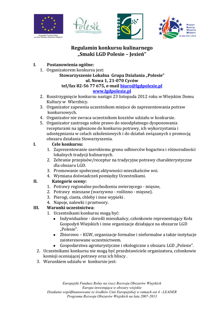 Europejski Fundusz Rolny na rzecz Rozwoju Obszarów Wiejskich Regulamin konkursu kulinarnego „Smaki LGD Polesie – Jesień” I. Postanowienia ogólne: 1. Organizatorem konkursu jest: Stowarzyszenie Lokalna Grupa Działania „Polesie” ul. Nowa 1, 21-070 Cyców tel/fax 82-56 77 675, e-mail [email protected] www.lgdpolesie.pl 2. Rozstrzygnięcie konkursu nastąpi 23 listopada 2012 roku w Wiejskim Domu Kultury w Wierzbicy. 3. Organizator zapewnia uczestnikom miejsce do zaprezentowania potraw konkursowych. 4. Organizator nie zwraca uczestnikom kosztów udziału w konkursie. 5. Organizator zastrzega sobie prawo do nieodpłatnego dysponowania recepturami na zgłoszone do konkursu potrawy, ich wykorzystania i udostępniania w celach szkoleniowych i do działań związanych z promocją obszaru działania Stowarzyszenia. I. Cele konkursu: 1. Zaprezentowanie szerokiemu gronu odbiorców bogactwa i różnorodności lokalnych tradycji kulinarnych. 2. Zebranie przepisów/receptur na tradycyjne potrawy charakterystyczne dla obszaru LGD. 3. Promowanie społecznej aktywności mieszkańców wsi. 4. Wymiana doświadczeń pomiędzy Uczestnikami. II. Kategorie oceny: 1. Potrawy regionalne pochodzenia zwierzęcego - mięsne, 2. Potrawy mieszane (warzywno - roślinno - mięsne). 3. Pierogi, ciasta, chleby i inne wypieki . 4. Napoje, nalewki i przetwory. III. Warunki uczestnictwa: 1. Uczestnikami konkursu mogą być: Indywidualnie - dorośli mieszkańcy, członkowie reprezentujący Koła Gospodyń Wiejskich i inne organizacje działające na obszarze LGD „Polesie”. Zbiorowo – KGW, organizacje formalne i nieformalne a także instytucje zainteresowane uczestnictwem. Gospodarstwa agroturystyczne i ekologiczne z obszaru LGD „Polesie”. 2. Uczestnikami konkursu nie mogą być przedstawiciele organizatora, członkowie komisji oceniającej potrawy oraz ich bliscy . 3. Warunkiem udziału w konkursie jest: Europejski Fundusz Rolny na rzecz Rozwoju Obszarów Wiejskich Europa inwestująca w obszary wiejskie Działanie współfinansowane ze środków Unii Europejskiej w ramach osi 4 –LEADER Programu Rozwoju Obszarów Wiejskich na lata 2007-2013 Europejski Fundusz Rolny na rzecz Rozwoju Obszarów Wiejskich a) kompletne wypełnienie i terminowe złożenie karty zgłoszenia u osoby odpowiedzialnej za przebieg konkursu, b) akceptacja zasad określonych w regulaminie, c) zorganizowanie, według własnego uznania, we własnym zakresie i na własny koszt niezbędnych do prezentacji i degustacji naczyń i sprzętu (np. tacek lub serwetek papierowych), d) zaprezentowanie konkursowej potrawy publiczności uczestniczącej w finale konkursu kulinarnego w dniu 23 listopada 2012 roku w Wiejskim Domu Kultury w Wierzbicy. 4. Do konkursu można zgłosić każdy rodzaj potrawy, określając jej rodzaj wg kategorii wskazanej przez Organizatora. 5. Jeden uczestnik/organizacja/podmiot - może zgłosić do konkursu tylko jedną potrawę IV. V. Harmonogram konkursu: 1. Do 20 listopada 2012 r. - przyjmowanie pisemnych zgłoszeń (kart zgłoszeniowych) uczestnictwa w konkursie. 2. Wypełnioną kartę zgłoszenia można złożyć osobiście lub przesłać pocztą do koordynatora konkursu na adres: Stowarzyszenie Lokalna Grupa Działania „Polesie”, ul. Nowa 1, 21-070 Cyców z dopiskiem „Konkurs Kulinarny Smaki LGD Polesie – Jesień”. UWAGA - o terminie przyjęcia zgłoszenia - decyduje data wpływu do Organizatora! 3. Prezentacja konkursowa odbędzie się 23 listopada 2012 roku w Wiejskim Domu Kultury w Wierzbicy. Ocena wyrobów konkursowych i nagrody: 1. Oceny potraw i przyznania nagród dokonuje komisja konkursowa złożona przynajmniej z 3 osób, powołana przez Organizatora. 2. Przewodniczący komisji zostanie powołany z poza etatowych pracowników Organizatora. 3. Skład komisji zostanie przedstawiony przed konkursem. 4. Komisja ocenia wyroby w zakresie: zgodności z tematem konkursu i wymaganiami regulaminu, cech nawiązujących do polskiej tradycji kulinarnej, prezentacji i estetyki, smakowitości potrawy, atrakcyjności, oryginalności receptury. 5. Przewiduje się następujące nagrody: nagrody rzeczowe - po trzy nagrody główne w każdej przewidzianej kategorii konkursowej. pamiątkowe podziękowania i drobne upominki – wszyscy (zgłoszeni) Uczestnicy Konkursu. Europejski Fundusz Rolny na rzecz Rozwoju Obszarów Wiejskich Europa inwestująca w obszary wiejskie Działanie współfinansowane ze środków Unii Europejskiej w ramach osi 4 –LEADER Programu Rozwoju Obszarów Wiejskich na lata 2007-2013 Europejski Fundusz Rolny na rzecz Rozwoju Obszarów Wiejskich 6. Od podjętej przez Komisję decyzji o przyznaniu nagród nie przysługuje odwołanie. VI. Postanowienia końcowe: 1. Organizator zastrzega sobie prawo do opublikowania imion, nazwisk, zdjęć i informacji o zwycięzcach i uczestnikach Konkursu. 2. Poprzez przystąpienie do konkursu uczestnicy wyrażają zgodę na warunki zawarte w regulaminie. 3. Regulamin konkursu jest udostępniony do wglądu w siedzibie Organizatora, a także na stronie internetowej www.lgdpolesie.pl 4. Wszystkie kwestie, których nie obejmuje regulamin - ustala Organizator. Dodatkowe informacje udzielane są przez koordynatora Konkursu: Małgorzatę Leszczyńską pod numerem tel/fax 82- 56 77 675, kom: 605 080 699 oraz adresem mailowym: [email protected] lub [email protected] Zapraszamy do udziału i życzymy wielu ciekawych pomysłów!!!! Europejski Fundusz Rolny na rzecz Rozwoju Obszarów Wiejskich Europa inwestująca w obszary wiejskie Działanie współfinansowane ze środków Unii Europejskiej w ramach osi 4 –LEADER Programu Rozwoju Obszarów Wiejskich na lata 2007-2013