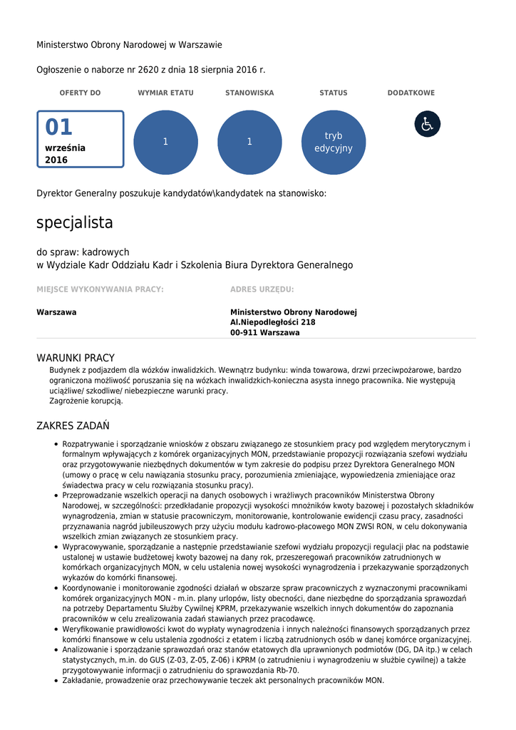 Ministerstwo Obrony Narodowej w Warszawie Ogłoszenie o naborze nr 2620 z dnia 18 sierpnia 2016 r. OFERTY DO 01 września 2016 WYMIAR ETATU STANOWISKA STATUS 1 1 tryb edycyjny DODATKOWE Dyrektor Generalny poszukuje kandydatów\kandydatek na stanowisko: specjalista do spraw: kadrowych w Wydziale Kadr Oddziału Kadr i Szkolenia Biura Dyrektora Generalnego MIEJSCE WYKONYWANIA PRACY: ADRES URZĘDU: Warszawa Ministerstwo Obrony Narodowej Al.Niepodległości 218 00-911 Warszawa WARUNKI PRACY Budynek z podjazdem dla wózków inwalidzkich. Wewnątrz budynku: winda towarowa, drzwi przeciwpożarowe, bardzo ograniczona możliwość poruszania się na wózkach inwalidzkich-konieczna asysta innego pracownika. Nie występują uciążliwe/ szkodliwe/ niebezpieczne warunki pracy. Zagrożenie korupcją. ZAKRES ZADAŃ Rozpatrywanie i sporządzanie wniosków z obszaru związanego ze stosunkiem pracy pod względem merytorycznym i formalnym wpływających z komórek organizacyjnych MON, przedstawianie propozycji rozwiązania szefowi wydziału oraz przygotowywanie niezbędnych dokumentów w tym zakresie do podpisu przez Dyrektora Generalnego MON (umowy o pracę w celu nawiązania stosunku pracy, porozumienia zmieniające, wypowiedzenia zmieniające oraz świadectwa pracy w celu rozwiązania stosunku pracy). Przeprowadzanie wszelkich operacji na danych osobowych i wrażliwych pracowników Ministerstwa Obrony Narodowej, w szczególności: przedkładanie propozycji wysokości mnożników kwoty bazowej i pozostałych składników wynagrodzenia, zmian w statusie pracowniczym, monitorowanie, kontrolowanie ewidencji czasu pracy, zasadności przyznawania nagród jubileuszowych przy użyciu modułu kadrowo-płacowego MON ZWSI RON, w celu dokonywania wszelkich zmian związanych ze stosunkiem pracy. Wypracowywanie, sporządzanie a następnie przedstawianie szefowi wydziału propozycji regulacji płac na podstawie ustalonej w ustawie budżetowej kwoty bazowej na dany rok, przeszeregowań pracowników zatrudnionych w komórkach organizacyjnych MON, w celu ustalenia nowej wysokości wynagrodzenia i przekazywanie sporządzonych wykazów do komórki finansowej. Koordynowanie i monitorowanie zgodności działań w obszarze spraw pracowniczych z wyznaczonymi pracownikami komórek organizacyjnych MON - m.in. plany urlopów, listy obecności, dane niezbędne do sporządzania sprawozdań na potrzeby Departamentu Służby Cywilnej KPRM, przekazywanie wszelkich innych dokumentów do zapoznania pracowników w celu zrealizowania zadań stawianych przez pracodawcę. Weryfikowanie prawidłowości kwot do wypłaty wynagrodzenia i innych należności finansowych sporządzanych przez komórki finansowe w celu ustalenia zgodności z etatem i liczbą zatrudnionych osób w danej komórce organizacyjnej. Analizowanie i sporządzanie sprawozdań oraz stanów etatowych dla uprawnionych podmiotów (DG, DA itp.) w celach statystycznych, m.in. do GUS (Z-03, Z-05, Z-06) i KPRM (o zatrudnieniu i wynagrodzeniu w służbie cywilnej) a także przygotowywanie informacji o zatrudnieniu do sprawozdania Rb-70. Zakładanie, prowadzenie oraz przechowywanie teczek akt personalnych pracowników MON. WYMAGANIA NIEZBĘDNE Wykształcenie: wyższe Powyżej 1 roku doświadczenia w obszarze spraw kadrowych. Poświadczenie bezpieczeństwa o klauzuli „poufne” lub zgoda na przeprowadzenie postępowania sprawdzającego w celu uzyskania poświadczenia bezpieczeństwa do klauzuli „poufne”. Znajomość: kodeksu pracy, ustawy o służbie cywilnej, ustawy o pracownikach urzędów państwowych i aktów wykonawczych, ustawy o wynagrodzeniu osób zajmujących kierownicze stanowiska państwowe, rozporządzenia RM w sprawie zasad wynagradzania i innych świadczeń przysługujących pracownikom urzędów państwowych zatrudnionym w gabinetach politycznych oraz doradcom lub pełniącym funkcje doradców osób zajmujących kierownicze stanowiska państwowe, ustawy o emeryturach i rentach z funduszu ubezpieczeń społecznych, ustawy o ochronie danych osobowych, struktury organizacyjnej MON. Umiejętność: organizacji pracy własnej, współpracy z innymi, dążenia do rezultatu, poszukiwania rozwiązań, komunikacji, w tym komunikacji pisemnej. Posiadanie obywatelstwa polskiego Korzystanie z pełni praw publicznych Nieskazanie prawomocnym wyrokiem za umyślne przestępstwo lub umyśle przestępstwo skarbowe DOKUMENTY I OŚWIADCZENIA NIEZBĘDNE Życiorys/CV i list motywacyjny Kopie dokumentów potwierdzających spełnienie wymagania niezbędnego w zakresie wykształcenia Kopie dokumentów potwierdzających powyżej 1 roku doświadczenia w obszarze spraw kadrowych (np. kopie świadectw pracy, zaświadczenie o zatrudnieniu) Kopia poświadczenia bezpieczeństwa uprawniającego do dostępu do informacji niejawnych oznaczonych klauzulą "poufne" lub oświadczenie o wyrażeniu zgody na przeprowadzenie postępowania sprawdzającego zgodnie z ustawą z dnia 5 sierpnia 2010 r. o ochronie informacji niejawnych (Dz. U. Nr 182, poz. 1228 ze zm.) Oświadczenie o posiadaniu obywatelstwa polskiego albo kopia dokumentu potwierdzającego posiadanie polskiego obywatelstwa Oświadczenie o wyrażeniu zgody na przetwarzanie danych osobowych do celów naboru Oświadczenie o korzystaniu z pełni praw publicznych Oświadczenie o nieskazaniu prawomocnym wyrokiem za umyślne przestępstwo lub umyślne przestępstwo skarbowe DOKUMENTY I OŚWIADCZENIA DODATKOWE kopia dokumentu potwierdzającego niepełnosprawność - w przypadku kandydatek/kandydatów, zamierzających skorzystać z pierwszeństwa w zatrudnieniu w przypadku, gdy znajdą się w gronie najlepszych kandydatek/kandydatów TERMINY I MIEJSCE SKŁADANIA DOKUMENTÓW Dokumenty należy złożyć do: 01 września 2016 r. Decyduje data: wpływu oferty do urzędu Miejsce składania dokumentów: Ministerstwo Obrony Narodowej Al. Niepodległości 218 00-911 Warszawa Dokumenty można składać osobiście - Punkt podawczy MON, Al. Niepodległości 218 - 