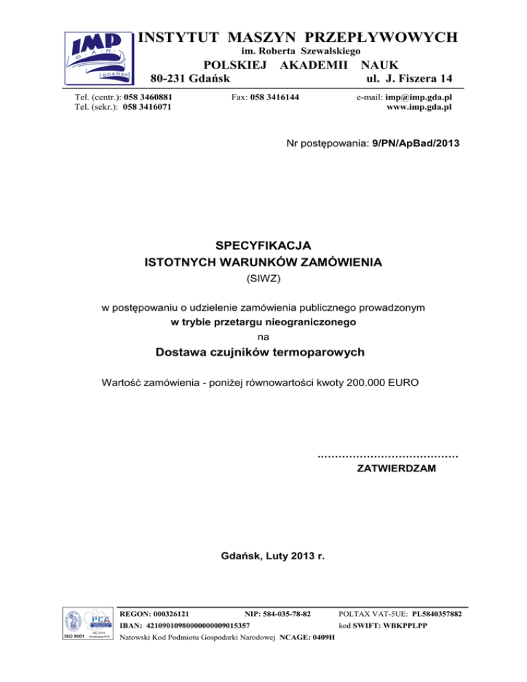 INSTYTUT MASZYN PRZEPŁYWOWYCH im. Roberta Szewalskiego POLSKIEJ AKADEMII NAUK 80-231 Gdańsk ul. J. Fiszera 14 Tel. (centr.): 058 3460881 Tel. (sekr.): 058 3416071 Fax: 058 3416144 e-mail: [email protected] www.imp.gda.pl Nr postępowania: 9/PN/ApBad/2013 SPECYFIKACJA ISTOTNYCH WARUNKÓW ZAMÓWIENIA (SIWZ) w postępowaniu o udzielenie zamówienia publicznego prowadzonym w trybie przetargu nieograniczonego na Dostawa czujników termoparowych Wartość zamówienia - poniżej równowartości kwoty 200.000 EURO .………………………………… ZATWIERDZAM Gdańsk, Luty 2013 r. REGON: 000326121 NIP: 584-035-78-82 IBAN: 42109010980000000009015357 Natowski Kod Podmiotu Gospodarki Narodowej NCAGE: 0409H POLTAX VAT-5UE: PL5840357882 kod SWIFT: WBKPPLPP I. ZAMAWIAJĄCY Instytut Maszyn Przepływowych im. Roberta Szewalskiego Polskiej Akademii Nauk ul. Fiszera 14 80-231, Gdańsk II. TRYB POSTĘPOWANIA Postępowanie o udzielenie zamówienia publicznego prowadzone jest w trybie przetargu nieograniczonego na podstawie przepisów ustawy z dnia 29 stycznia 2004 roku Prawo zamówień publicznych (Dz. U. z 2007 r. Nr 223, poz. 1655 z późn. zm.), zwanej dalej „ustawą Pzp”. III. PRZEDMIOT ZAMÓWIENIA 1. Przedmiotem zamówienia jest : Dostawa 35 czujników termoparowych 2. Przedmiot zamówienia wg Wspólnego Słownika Zamówień CPV: 38417000-1 3. Opis przedmiotu zamówienia: 35 x czujnik temperatury – termoelement płaszczowy typu „T” ; - zakres pomiarowy: (-100 ÷ 400) oC; - Klasa dokładności: 1; - Typ wkładu: pojedynczy; - Długość: 150 mm; - Średnica płaszcza w [mm]: 0,5 ; - Budowa: wtyczka, gniazdo ; - Typ spoiny: odizolowana ; - Materiał płaszcza: 1H18N9T ; - Złącze: mini ; - Długość przewodu kompensacyjnego: 2500 mm ; (powyższe wymagania spełnia przykładowo czujnik CZAH: TTP-1-150-0,5-4-1-1-321-2-2500; lub inny równoważny) 4. Inne wymagania: 1) Zamawiający wymaga by przedmiot zamówienia był fabrycznie nowy, pozbawiony wad oraz by został dostarczony na koszt i ryzyko Wykonawcy. Zamawiający potwierdzi odbiór zamówionego towaru protokołem odbioru, którego wzór Wykonawca ustali z Zamawiającym. Z chwilą podpisania protokołu odbioru przedmiot zamówienia staje się własnością Zamawiającego. 2) Zamawiający wymaga by gwarancja na przedmiot zamówienia wynosiła min. 12 miesięcy od dnia podpisania protokołu odbioru. Zamawiający nie dopuszcza składania ofert wariantowych. Zamawiający nie dopuszcza składania ofert częściowych. IV. TERMIN I MIEJSCE REALIZACJI ZAMÓWIENIA 1) Zamawiający wymaga, by dostawa nastąpiła w terminie do 3 tygodni od dnia podpisania umowy. 2) Zamawiający wymaga, by dostawa nastąpiła do siedziby Zamawiającego. Koszt dostawy pokrywa Wykonawca. V. WARUNKI UDZIAŁU W POSTĘPOWANIU ORAZ SPOSÓB OCENY ICH SPEŁNIENIA 1. O udzielenie zamówienia mogą ubiegać się wykonawcy, którzy spełniają warunki, dotyczące: a) posiadania uprawnień do wykonywania określonej działalności lub czynności, jeżeli przepisy prawa nakładają obowiązek ich posiadania; b) posiadania wiedzy i doświadczenia; c) dysponowania odpowiednim potencjałem technicznym oraz osobami zdolnymi do wykonania zamówienia; d) sytuacji ekonomicznej i finansowej. 2. Zamawiający dokona oceny spełnienia powyższych warunków na podstawie złożonych przez Wykonawców oświadczeń i dokumentów, zgodnie z formułą: spełnia / nie spełnia. 3. W sytuacjach opisanych w art. 24 Ustawy Pzp, Wykonawca zostanie wykluczony z postępowania a jego oferta odrzucona. VI. WYMAGANE OŚWIADCZENIA I DOKUMENTY 1. Dla potwierdzenia spełnienia warunków określonych w rozdz. V niniejszej SIWZ, Wykonawcy winni złożyć niżej wymienione oświadczenia i dokumenty: 1) oświadczenie o spełnieniu warunków określonych w art. 22 ust. 1 Ustawy Pzp (załącznik nr 2 do SIWZ). Oświadczenie musi być podpisane przez Wykonawcę. 2) Oświadczenie o braku podstaw do wykluczenia z postępowania z art. 24 ust. 1 Ustawy Pzp (załącznik nr 3 do SIWZ). Oświadczenie musi być podpisane przez Wykonawcę. 2. Jeżeli Wykonawca ma siedzibę lub miejsce zamieszkania poza terytorium Rzeczypospolitej Polskiej składa dokumenty zgodnie z Rozporządzeniem Prezesa Rady Ministrów z dnia 30.12.2009 r. w sprawie rodzajów dokumentów, jakich może żądać zamawiający od wykonawcy oraz form, w jakich te dokumenty mogą być składane (Dz. U. z 2009 r. Nr 226, poz. 1817). 3. Zamawiający nie dopuszcza elektronicznej formy dokumentów i oświadczeń. 4. Złożone wraz z ofertą dokumenty, po otwarciu ofert nie podlegają zwrotowi. 5. Dokumenty nie wymagane przez Zamawiającego, a załączone do oferty nie będą brane pod uwagę podczas oceny ofert. VII. ZASADY SKŁADANIA OFERT WSPÓLNYCH PRZEZ WYKONAWCÓW 1. Zgodnie z art. 23 ustawy Pzp Wykonawcy mogą wspólnie ubiegać się o udzielenie zamówienia publicznego. 2. Wykonawcy wspólnie ubiegający się o udzielenie zamówienia muszą ustanowić pełnomocnika do reprezentowania ich w postępowaniu o udzielenie zamówienia publicznego albo reprezentowania w postępowaniu i zawarcia umowy w sprawie zamówienia publicznego. 3. Pełnomocnictwo musi wskazywać pełnomocnika i określić zakres pełnomocnictwa. W dokumencie tym powinni być wymienieni wszyscy Wykonawcy wspólnie ubiegający się o zamówienie. Upoważnieni przedstawiciele tych Wykonawców muszą się pod nim podpisać. 4. Oferta winna być podpisana przez każdego z Wykonawców występujących wspólnie lub upoważnionego przedstawiciela – pełnomocnika. 5. Podmioty występujące wspólnie ponoszą solidarną za niewykonanie lub nienależyte wykonanie zobowiązań. 6. W przypadku dokonania wyboru oferty Wykonawców występujących wspólnie, przed zawarciem umowy w sprawie zamówienia publicznego, Zamawiający może zażądać przedłożenia umowy regulującej współpracę Wykonawców występujących wspólnie. Termin, na jaki została zawarta umowa nie może być krótszy od termin