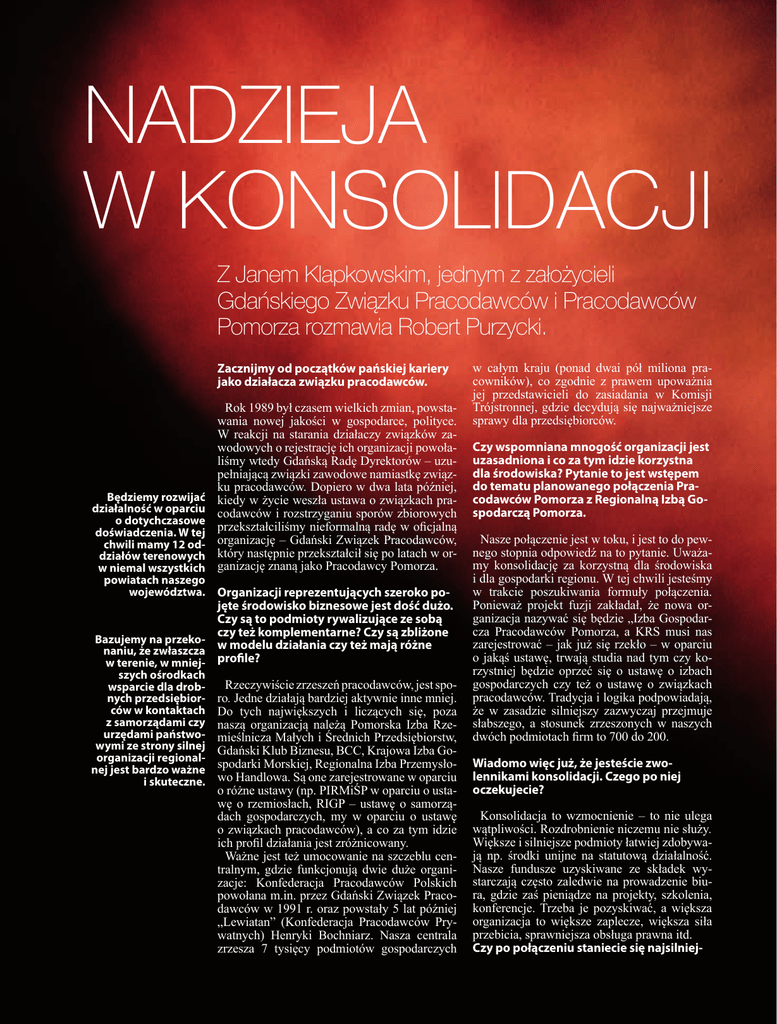 Nadzieja w konsolidacji Z Janem Klapkowskim, jednym z założycieli Gdańskiego Związku Pracodawców i Pracodawców Pomorza rozmawia Robert Purzycki. Zacznijmy od początków pańskiej kariery jako działacza związku pracodawców. Będziemy rozwijać działalność w oparciu o dotychczasowe doświadczenia. W tej chwili mamy 12 oddziałów terenowych w niemal wszystkich powiatach naszego województwa. Rok 1989 był czasem wielkich zmian, powstawania nowej jakości w gospodarce, polityce. W reakcji na starania działaczy związków zawodowych o rejestrację ich organizacji powołaliśmy wtedy Gdańską Radę Dyrektorów – uzupełniającą związki zawodowe namiastkę związku pracodawców. Dopiero w dwa lata później, kiedy w życie weszła ustawa o związkach pracodawców i rozstrzyganiu sporów zbiorowych przekształciliśmy nieformalną radę w oficjalną organizację – Gdański Związek Pracodawców, który następnie przekształcił się po latach w organizację znaną jako Pracodawcy Pomorza. Organizacji reprezentujących szeroko pojęte środowisko biznesowe jest dość dużo. Czy są to podmioty rywalizujące ze sobą czy też komplementarne? Czy są zbliżone Bazujemy na przekonaniu, że zwłaszcza w modelu działania czy też mają różne w terenie, w mniej- profile? szych ośrodkach wsparcie dla drobnych przedsiębiorców w kontaktach z samorządami czy urzędami państwowymi ze strony silnej organizacji regionalnej jest bardzo ważne i skuteczne. 28 | EXPRESS BIZNESU Rzeczywiście zrzeszeń pracodawców, jest sporo. Jedne działają bardziej aktywnie inne mniej. Do tych największych i liczących się, poza naszą organizacją należą Pomorska Izba Rzemieślnicza Małych i Średnich Przedsiębiorstw, Gdański Klub Biznesu, BCC, Krajowa Izba Gospodarki Morskiej, Regionalna Izba Przemysłowo Handlowa. Są one zarejestrowane w oparciu o różne ustawy (np. PIRMiŚP w oparciu o ustawę o rzemiosłach, RIGP – ustawę o samorządach gospodarczych, my w oparciu o ustawę o związkach pracodawców), a co za tym idzie ich profil działania jest zróżnicowany. Ważne jest też umocowanie na szczeblu centralnym, gdzie funkcjonują dwie duże organizacje: Konfederacja Pracodawców Polskich powołana m.in. przez Gdański Związek Pracodawców w 1991 r. oraz powstały 5 lat później „Lewiatan” (Konfederacja Pracodawców Prywatnych) Henryki Bochniarz. Nasza centrala zrzesza 7 tysięcy podmiotów gospodarczych w całym kraju (ponad dwai pół miliona pracowników), co zgodnie z prawem upoważnia jej przedstawicieli do zasiadania w Komisji Trójstronnej, gdzie decydują się najważniejsze sprawy dla przedsiębiorców. Czy wspomniana mnogość organizacji jest uzasadniona i co za tym idzie korzystna dla środowiska? Pytanie to jest wstępem do tematu planowanego połączenia Pracodawców Pomorza z Regionalną Izbą Gospodarczą Pomorza. Nasze połączenie jest w toku, i jest to do pewnego stopnia odpowiedź na to pytanie. Uważamy konsolidację za korzystną dla środowiska i dla gospodarki regionu. W tej chwili jesteśmy w trakcie poszukiwania formuły połączenia. Ponieważ projekt fuzji zakładał, że nowa organizacja nazywać się będzie „Izba Gospodarcza Pracodawców Pomorza, a KRS musi nas zarejestrować – jak już się rzekło – w oparciu o jakąś ustawę, trwają studia nad tym czy korzystniej będzie oprzeć się o ustawę o izbach gospodarczych czy też o ustawę o związkach pracodawców. Tradycja i logika podpowiadają, że w zasadzie silniejszy zazwyczaj przejmuje słabszego, a stosunek zrzeszonych w naszych dwóch podmiotach firm to 700 do 200. Wiadomo więc już, że jesteście zwolennikami konsolidacji. Czego po niej oczekujecie? Konsolidacja to wzmocnienie – to nie ulega wątpliwości. Rozdrobnienie niczemu nie służy. Większe i silniejsze podmioty łatwiej zdobywają np. środki unijne na statutową działalność. Nasze fundusze uzyskiwane ze składek wystarczają często zaledwie na prowadzenie biura, gdzie zaś pieniądze na projekty, szkolenia, konferencje. Trzeba je pozyskiwać, a większa organizacja to większe zaplecze, większa siła przebicia, sprawniejsza obsługa prawna itd. Czy po połączeniu staniecie się najsilniej- szą organizacją na Pomorzu i czy planujecie w związku z tym rozszerzenie swojej działalności? Tak, po połączeniu staniemy się zdecydowanie najsilniejszym tego rodzaju podmiotem w regionie. Będziemy rozwijać działalność w oparciu o dotychczasowe doświadczenia. W tej chwili mamy 12 oddziałów terenowych w niemal wszystkich powiatach naszego województwa. Bazujemy na przekonaniu, że zwłaszcza w terenie, w mniejszych ośrodkach wsparcie dla drobnych przedsiębiorców w kontaktach z samorządami czy urzędami państwowymi ze strony silnej organizacji regionalnej jest bardzo ważne i skuteczne. Drobnego przedsiębiorcę z jego problemami urzędy -jak mówi doświadczenie – mogą traktować różnie, z organizacją muszą się liczyć. Jakie warunki trzeba spełnić żeby zostać przyjętym do PP? Trzeba zatrudniać minimum jedną osobę – to wstępny statutowy warunek. Poza tym zgłaszające się podmioty sprawdzamy w KRS. Chcemy w ten sposób uchronić się przed błędem przyjęcia takich, które mają – nazwijmy to - niechlubną przeszłość. Korzystamy z formy rekomendacji firmy będącej już członkiem. Branża jest nieistotna. Są u nas potentaci tacy jak Lotos czy Porty Gdański, i Gdyński, ale też małe firmy rodzinne, handlowe, zatrudniające po 2-3 osoby. Pracujemy w sekcjach branżowych, i na co dzień działamy organizując spotkania, szkolenia itd. w branżach. Odchodząc na chwilę od tematyki związanej z działalnością PP do tematów bardziej ogólnych - czy dostrzega Pan jako osoba „siedząca” w tej problematyce zwiększającą się atrakcyjność gospodarczą Pomorza wraz z poprawiającą się infrastrukturą (mamy na myśli zwłaszcza powstającą autostradę A1, której b