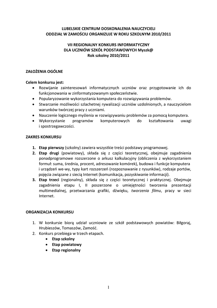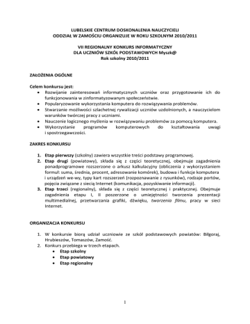 LUBELSKIE CENTRUM DOSKONALENIA NAUCZYCIELI ODDZIAŁ W ZAMOŚCIU ORGANIZUJE W ROKU SZKOLNYM 2010/2011 VII REGIONALNY KONKURS INFORMATYCZNY DLA UCZNIÓW SZKÓŁ PODSTAWOWYCH Myszk@ Rok szkolny 2010/2011 ZAŁOŻENIA OGÓLNE Celem konkursu jest: Rozwijanie zainteresowań informatycznych uczniów oraz przygotowanie ich do funkcjonowania w zinformatyzowanym społeczeństwie. Popularyzowanie wykorzystania komputera do rozwiązywania problemów. Stwarzanie możliwości szlachetnej rywalizacji uczniów uzdolnionych, a nauczycielom warunków twórczej pracy z uczniami. Nauczenie logicznego myślenia w rozwiązywaniu problemów za pomocą komputera. Wykorzystanie programów komputerowych do kształtowania uwagi i spostrzegawczości. ZAKRES KONKURSU 1. Etap pierwszy (szkolny) zawiera wszystkie treści podstawy programowej. 2. Etap drugi (powiatowy), składa się z części teoretycznej, obejmuje zagadnienia ponadprogramowe rozszerzone o arkusz kalkulacyjny (obliczenia z wykorzystaniem formuł: suma, średnia, procent, adresowanie komórek), budowa i funkcje komputera i urządzeń we-wy, typy kart rozszerzeń (rozpoznawanie z rysunków), rodzaje portów, pojęcia związane z siecią Internet (komunikacja, pozyskiwanie informacji). 3. Etap trzeci (regionalny), składa się z części teoretycznej i praktycznej. Obejmuje zagadnienia etapu I, II poszerzone o umiejętności tworzenia prezentacji multimedialnej, przetwarzania grafiki, dźwięku, tworzenia filmu, pracy w sieci Internet. ORGANIZACJA KONKURSU 1. W konkursie biorą udział uczniowie ze szkół podstawowych powiatów: Biłgoraj, Hrubieszów, Tomaszów, Zamość. 2. Konkurs przebiega w trzech etapach. Etap szkolny Etap powiatowy Etap regionalny 1 ZASADY KONKURSU 1. Eliminacje szkolne do etapu powiatowego przeprowadzają nauczyciele informatyki wybierając maksymalnie 4 uczniów ze szkoły. Nauczyciele zgłaszający uczniów powinni zaznaczyć na jakim oprogramowaniu pracują w szkole. 2. Eliminacje powiatowe i regionalne przeprowadza komisja powołana przez kierownika LSCDN - Oddział w Zamościu.. 3. Do etapu regionalnego przechodzą uczniowie, którzy zdobyli co najmniej 80% punktów możliwych do uzyskania. 4. Laureatami konkursu zostają uczniowie, którzy w konkursie regionalnym zdobyli łącznie z części teoretycznej i praktycznej 80% punktów. 5. Finaliści konkursu otrzymują dyplomy, laureaci – dyplomy i nagrody. 6. Komisja konkursowa zastrzega sobie prawo do weryfikacji prac konkursowych w przypadku nie uzyskania przez żadnego z uczestników II i III etapu wymaganej ilości punktów. 7. Protokoły konkursu wraz z pracami uczniów, którzy zakwalifikowali się do III etapu zostają przesłane do Komisji Regionalnej w LSCDN Oddział w Zamościu. TERMINY KONKURSU 1. Eliminacje szkolne - zgłoszenia uczestników do 28 lutego 2011 r. na karcie zgłoszenia, drogą elektroniczną do Przewodniczącej Komisji ([email protected]). 2. Eliminacje powiatowe (45-minutowy test) – 30 marca 2011 r (środa) . godz. 12.00. 3. Etap regionalny (45-minutowy test oraz 60-miutowe zadania praktyczne) – 11 maja 2011 r. (środa) godz. 10.00. 4. Miejsca konkursów zostaną podane na stronie internetowej LSCDN O/Zamość w stosownym terminie. Uwaga! W przypadku (nieplanowanej) zmiany dat konkursu w stosownym terminie zostaną podane szczegółowe informacje na stronie internetowej konkursu. PRZEBIEG KONKURSU ETAP POWIATOWY (część teoretyczna): Test Czas- 45 minut ETAP REGIONALNY (część praktyczna i teoretyczna) Uczeń wykonuje zadania praktyczne na komputerze typu IBM PC przy użyciu oprogramowania MS OFFICE 2003/2007, Paint, przeglądarki internetowej (Internet Explorer, Mozilla Firefox), rejestratora dźwięku, programu Audacity (edytor dźwięku), Picture Manager, Movie Maker. W etapie II uczeń powinien przygotować filmik w oparciu o program Movie Maker (+ nagrywanie dźwięku w rejestratorze). Czas - 60 minut (część teoretyczna – 45 minut, część praktyczna – 60 minut) 2 OCENA: Prace oceniane będą przez Komisję Konkursową. Ocenie podlegać będą: poprawność rozwiązań pomysłowość Do zadań komisji należy: przygotowanie zadań konkursowych, czuwanie nad prawidłowym przebiegiem konkursu, ustalenie listy finalistów, osób wyróżnionych oraz dokonanie rozdziału nagród i dyplomów, podsumowanie konkursu. UWAGA! Za prawidłowy przebieg konkursu, prace komisji oraz stronę merytoryczną zadań konkursowych odpowiedzialny jest koordynator konkursu z ramienia Lubelskiego Samorządowego Centrum Doskonalenia Nauczycieli – Agata Waszek - konsultant edukacji informatycznej. Wszelkie sugestie i uwagi proszę kierować do p. Agata Waszek Kontakt: [email protected] tel. 661798478 Literatura: 1. Podstawowa: • Podręczniki do nauczania informatyki na poziomie szkoły podstawowej • Praca zbiorowa, Konkursy informatyczne 2005-2006, 2007-2010, WODN/LSCDN, Zamość, 2006 i 2010. • Strony internetowe, opracowania poświęcone cytowanemu oprogramowaniu – wg uznania nauczyciela. 2. Uzupełniająca: • B. Bogucka - Zbiór zadań z informatyki, MIKOM. • M. Luliński - Zadania konkursowe z informatyki, MIKOM. Oraz inna dostępna i preferowana przez nauczyciela, a dotycząca treści konkursu oraz specyfiki pracy w wybranych aplikacjach! Serdecznie zapraszamy wszystkich chętnych do uczestnictwa w konkursie! Organizatorzy 3