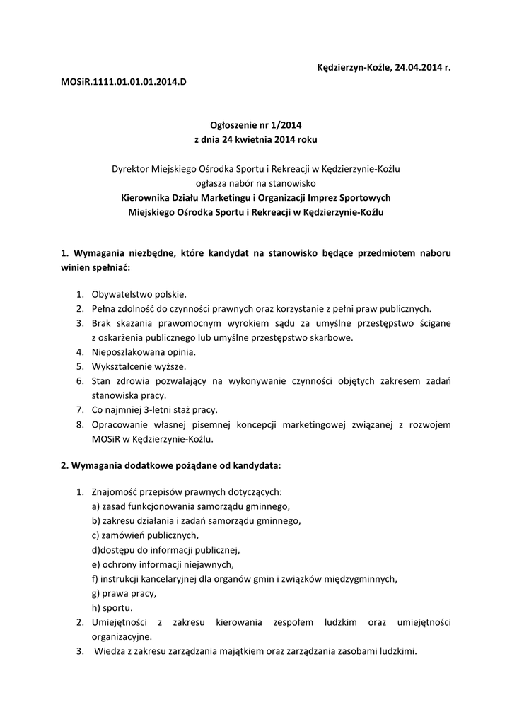 Kędzierzyn-Koźle, 24.04.2014 r. MOSiR.1111.01.01.01.2014.D Ogłoszenie nr 1/2014 z dnia 24 kwietnia 2014 roku Dyrektor Miejskiego Ośrodka Sportu i Rekreacji w Kędzierzynie-Koźlu ogłasza nabór na stanowisko Kierownika Działu Marketingu i Organizacji Imprez Sportowych Miejskiego Ośrodka Sportu i Rekreacji w Kędzierzynie-Koźlu 1. Wymagania niezbędne, które kandydat na stanowisko będące przedmiotem naboru winien spełniać: 1. Obywatelstwo polskie. 2. Pełna zdolność do czynności prawnych oraz korzystanie z pełni praw publicznych. 3. Brak skazania prawomocnym wyrokiem sądu za umyślne przestępstwo ścigane z oskarżenia publicznego lub umyślne przestępstwo skarbowe. 4. Nieposzlakowana opinia. 5. Wykształcenie wyższe. 6. Stan zdrowia pozwalający na wykonywanie czynności objętych zakresem zadań stanowiska pracy. 7. Co najmniej 3-letni staż pracy. 8. Opracowanie własnej pisemnej koncepcji marketingowej związanej z rozwojem MOSiR w Kędzierzynie-Koźlu. 2. Wymagania dodatkowe pożądane od kandydata: 1. Znajomość przepisów prawnych dotyczących: a) zasad funkcjonowania samorządu gminnego, b) zakresu działania i zadań samorządu gminnego, c) zamówień publicznych, d)dostępu do informacji publicznej, e) ochrony informacji niejawnych, f) instrukcji kancelaryjnej dla organów gmin i związków międzygminnych, g) prawa pracy, h) sportu. 2. Umiejętności z zakresu kierowania zespołem ludzkim oraz umiejętności organizacyjne. 3. Wiedza z zakresu zarządzania majątkiem oraz zarządzania zasobami ludzkimi. 4. Biegła umiejętność obsługi komputera i znajomość komputerowego programowania narzędziowego – Microsoft Office (Word, Excel), poczty elektronicznej, Internetu, systemu informacji prawnej. 5. Znajomość zagadnień sportu lokalnego. 6. Prawo jazdy kategorii B. 3. Zakres podstawowych zadań wykonywanych na stanowisku będącym przedmiotem naboru: 1. Projektowanie i przedkładanie Dyrektorowi harmonogramu oraz budżetu imprez na dany rok. 2. Opracowywanie, zgodnie z obowiązującym wzorem, projektów cenników korzystania z obiektów zarządzanych przez MOSiR, w oparciu o sporządzone przez Zastępcę Dyrektora, Głównego Księgowego i Kierowników dane wyjściowe. 3. Inicjowanie organizacji nowych imprez o charakterze sportowo-rekreacyjnym. 4. Nadzór nad organizacją i przeprowadzeniem imprez. 5. Planowanie i realizowanie działań marketingowych tworzących atrakcyjny wizerunek MOSiR oraz oferowanych przez niego usług. 6. Pozyskiwanie pozabudżetowych środków finansowych na realizację zadań statutowych MOSiR. 7. Opracowywanie i przekazywanie Radcy Prawnemu MOSiR, za pośrednictwem Sekretariatu, danych wyjściowych do sporządzania przez niego umów sponsorskich i reklamowych oraz przestrzeganie realizacji tych umów. 8. Opracowywanie i realizowanie programów sportowo-rekreacyjnych adresowanych do mieszkańców Gminy Kędzierzyn-Koźle. 9. Współpraca z mediami. 10. Organizowanie imprez własnych i zleconych. 11. Nadzór nad obszarem rekreacji ruchowej i instruktorów fitness. 12. Inicjowanie projektów profilaktycznych z zakresu rekreacji ruchowej dla mieszkańców miasta i nadzór nad nimi. 4. Dokumenty wymagane w ofertach pracy składanych przez kandydatów: 1. Życiorys zawodowy zawierający wykaz wszystkich dotychczasowych miejsc pracy kandydata z wyszczególnieniem stażu pracy w tych miejscach oraz przebieg nauki z wyszczególnieniem wszystkich ukończonych szkół i uczelni. 2. List motywacyjny. 3. Kopia lub odpis dokumentów potwierdzających: a. wykształcenie (dyplomu ukończenia studiów wyższych), b. staż pracy (np. świadectw pracy), c. posiadane kwalifikacje i umiejętności (dyplomów, zaświadczeń itp.), 4. Oświadczenie o niekaralności za umyślne przestępstwa ścigane z oskarżenia publicznego lub umyślne przestępstwa skarbowe (wybrany kandydat zobowiązany będzie do przedłożenia zaświadczenia o niekaralności wydanego przez Krajowy Rejestr Karny). 5. Oświadczenie o posiadaniu przez kandydata pełni praw publicznych. 6. Oświadczenie o stanie zdrowia pozwalającym na wykonywanie czynności objętych zakresem zadań stanowiska pracy. …………………………………………………………………………….. Załączone: list motywacyjny i życiorys powinny być opatrzone następującą klauzulą: „Wyrażam zgodę na: ………………………………………………………………………………………………….. 1) przetwarzanie moich danych osobowych zawartych w ofercie pracy, 2) przeprowadzenie wywiadu środowiskowego w dotychczasowych miejscach mojej pracy i nauki, w celu potwierdzenia spełniania warunku posiadania przeze mnie nieposzlakowanej opinii, dla potrzeb procesu naboru na stanowisko kierownika Działu Marketingu i Organizacji Imprez Sportowych Miejskiego Ośrodka Sportu i Rekreacji w Kędzierzynie-Koźlu prowadzonego zgodnie z przepisami ustawy z dnia 21 listopada 2008 r. o pracownikach samorządowych (Dz.U. Nr 223, poz. 1458 z późn. zm);" 7. Komisja powołana do zaopiniowania kandydatów na stanowisko kierownika Działu Marketingu i Organizacji Imprez Sportowych Miejskiego Ośrodka Sportu i Rekreacji w Kędzierzynie-Koźlu uprawniona będzie do ewentualnego żądania dostarczenia brakujących lub uzupełnienia dokumentów złożonych w ofercie pracy w trakcie trwania procesu naboru. 5. Informacja o warunkach pracy na stanowisku będącym przedmiotem naboru: 1. Miejsce pracy: Miejski Ośrodek Sportu i Rekreacji w Kędzierzynie-Koźlu. 2. Zastrzega się wolę zatrudnienia wybranego kandydata na czas określony nie przekraczający 6 miesięcy w celu praktycznego sprawdzenia umiejętności i doświadczenia zawodowego pracownika. 6. Przebieg postępowania w sprawie naboru: Etap pierwszy: 1. Ofertę pracy zawierającą wymagane dokumenty należy składać w kopercie z dopiskiem „Oferta pracy - nabór na stanowisko Kierownika Działu Marketingu i Organizacji Imprez 