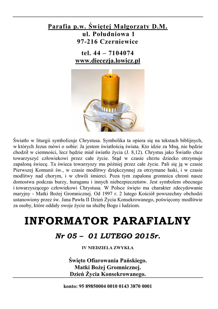 Parafia p.w. Świętej Małgorzaty D.M. ul. Południowa 1 97-216 Czerniewice tel. 44 – 7104074 www.diecezja.lowicz.pl Światło w liturgii symbolizuje Chrystusa. Symbolika ta opiera się na tekstach biblijnych, w których Jezus mówi o sobie: Ja jestem światłością świata. Kto idzie za Mną, nie będzie chodził w ciemności, lecz będzie miał światło życia (J. 8,12). Chrystus jako Światło chce towarzyszyć człowiekowi przez całe życie. Stąd w czasie chrztu dziecko otrzymuje zapaloną świecę. Ta świeca towarzyszy mu później przez całe życie. Pali się ją w czasie Pierwszej Komunii św., w czasie modlitwy dziękczynnej za otrzymane łaski, i w czasie modlitwy nad chorym, i w chwili śmierci. Poza tym zapalona gromnica chroni nasze domostwa podczas burzy, huraganu i innych niebezpieczeństw. Jest symbolem obecnego i towarzyszącego człowiekowi Chrystusa. W Polsce święto ma charakter zdecydowanie maryjny - Matki Bożej Gromnicznej. Od 1997 r. 2 lutego Kościół powszechny obchodzi ustanowiony przez św. Jana Pawła II Dzień Życia Konsekrowanego, poświęcony modlitwie za osoby, które oddały swoje życie na służbę Bogu i ludziom. INFORMATOR PARAFIALNY Nr 05 – 01 LUTEGO 2015r. IV NIEDZIELA ZWYKŁA Święto Ofiarowania Pańskiego. Matki Bożej Gromnicznej. Dzień Życia Konsekrowanego. konto: 95 89850004 0010 0143 3870 0001 EWANGELIA NA IV NIEDZIELĘ ZWYKŁĄ Mk 1, 21-28 Nawracajcie się i wierzcie w Ewangelię W mieście Kafarnaum Jezus w szabat wszedł do synagogi i nauczał. Zdumiewali się Jego nauką: uczył ich bowiem jak ten, który ma władzę, a nie jak uczeni w Piśmie. Był właśnie w synagodze człowiek opętany przez ducha nieczystego. Zaczął on wołać: "Czego chcesz od nas, Jezusie Nazarejczyku? Przyszedłeś nas zgubić. Wiem, kto jesteś: Święty Boży ". Lecz Jezus rozkazał mu surowo: "Milcz i wyjdź z niego!". Wtedy duch nieczysty zaczął go targać i z głośnym krzykiem wyszedł z niego. A wszyscy się zdumieli, tak że jeden drugiego pytał: "Co to jest? Nowa jakaś nauka z mocą. Nawet duchom nieczystym rozkazuje i są Mu posłuszne". I wnet rozeszła się wieść o Nim wszędzie po całej okolicznej krainie galilejskiej. Czym jest prorokowanie? To charyzmat niezwykle odpowiedzialny, a nawet niebezpieczny, jak dowiadujemy się z pierwszej lekcji. Prorok jest kimś, kto wygłasza słowa nie swoje, lecz Boga. Słowa Boga są włożone w jego usta niczym perły do wnętrza muszli. Szum muszli to prorokowanie, dowodzenie o istnieniu perły. Nie są to krzykliwe ludzkie racje, lecz opiekuńcze prawdy Boga. Po drugie prorok jest osobą o nikogo tak się nietroszczącą jak właśnie o Boga i to bardziej niż kochający mąż o żonę. Troska o Boga jest efektem odkrycia troski Boga o człowieka. Dwa pierwsze czytania uwypuklają dwie istotne cechy proroka. Ale jest jeszcze trzecia, uwidoczniona w ewangelicznym fragmencie: prorok sam jest spełnionym proroctwem. Gdy się prorokuje, powinno się być samemu wiernym temu, co się głosi. Opętany prorokował, twierdząc, że Jezus jest Świętym Boga, ale jego życie stało w jawnej sprzeczności z tym, co głosił. Poza tym on KRZYCZAŁ, a nie NAUCZAŁ jak Jezus. Krzycząc, możemy robić wielkie wrażenie. Dążenie do nieustannego wywierania wrażenia na innych to cecha socjopatów. Proroctwo jest wyrazem troski Boga o człowieka, który pragnie obudzić taką samą troskę człowieka o Boga. Jego celem jest miłość, bo Jego początkiem jest miłość. Bóg odsłania się w proroctwach taki, jaki jest naprawdę – jako Bóg troskliwy. Jeśli więc i ty odsłaniasz Boga jako troskliwego Ojca i masz o Niego troskę najczulszą, jesteś prorokiem, choć może o tym nie wiesz! Tylko zadaj sobie pytanie: nauczasz czy krzyczysz? Straszysz Bogiem czy rozbudzasz zaufanie w innych do Niego? Ukazujesz Boga, który chce zgubić człowieka, czy też takiego, który pragnie człowieka odnaleźć? Nikt nie jest prorokiem, kto nie ujrzał w sobie spełnionych obietnic Boga. Najpiękniej jest troszczyć się o Niego. Domyślać się Jego pragnień, współczuć Mu, boleć razem z Nim i cieszyć się Jego radością. Pytać się o Jego zmartwienia, pocieszać Go i poświęcać Mu czas. Wynagradzać Mu obelgi, pertraktować z Jego gniewem, być kimś tak zaufanym, że odważy się zwierzyć i ujawniać swe tajemnice. Tylko między przyjaciółmi tajemnice nie są tajemnicami. Prorok jest przyjacielem Boga. OGŁOSZENIA 1. Na liturgię dnia Ofiarowania Pańskiego prosimy o przyniesienie gromnic. 2. Spotkanie młodzieży przygotowującej się do bierzmowania w niedzielę, 8 lutego br. o godz. 17.00 (nie będzie spotkania w piątek, 6 lutego). 3. W piątek, 6 lutego br. wyjazd na Jasną Górę na dekanalne czuwanie nocne przed Obrazem Matki Bożej o godzinie 17:30. Powrót w sobotę ok. godz. 6:00. Koszt 30 zł. Prosimy o wpłacanie należności za udział w pielgrzymce. 4. Dziękujemy za ofiary złożone do radnych oraz na tacę w ubiegłą niedzielę w wysokości 1046,27 zł i 2€. Bóg zapłać! ZE WSPÓLNOTY PARAFIALNEJ ODESZLI DO WIECZNOŚCI: ś.p. Henryk Grzelka, ś.p. Lidia Wójciak, ś.p. Zofia Skoneczna – polecamy ich dusze modlitwom Parafian. Agata Sycylijska DM Święta Agata (235-251) pochodziła ze znamienitego rodu, z Katanii na Sycylii. Jej imię z greckiego oznacza "dobra". Hagiografowie podają, że była niezwykle piękna. Po przyjęciu chrztu św. złożyła ślub dziewictwa, pragnąc całkowicie poświęcić się Chrystusowi. Dlatego też odrzuciła propozycję małżeństwa złożoną przez Kwincjana, rzymskiego namiestnika Sycylii. Owładnięty żądzą zemsty, po rozpoczęciu prześladowań chrześcijan przez cesarza Decjusza jako jedną z pierwszych nakazał uwięzić Agatę. Gdy nie powiodła mu się perfidna próba odebrania jej dobrego imienia, skazał ją na ciężkie tortury, podczas których kleszczami wyrwano jej piersi. W końcu niezłomną w wierze polecił rzucić na