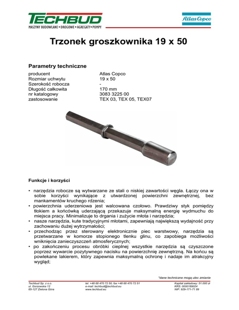 Trzonek groszkownika 19 x 50 Parametry techniczne producent Rozmiar uchwytu Szerokość robocza Długość całkowita nr katalogowy zastosowanie Atlas Copco 19 x 50 170 mm 3083 3225 00 TEX 03, TEX 05, TEX07 Funkcje i korzyści • narzędzia robocze są wytwarzane ze stali o niskiej zawartości węgla. Łączy ona w sobie korzyści wynikające z utwardzonej powierzchni zewnętrznej, bez mankamentów kruchego rdzenia; • powierzchnia uderzeniowa jest walcowana czołowo. Prawdziwy styk pomiędzy tłokiem a końcówką uderzającą przekazuje maksymalną energię wydmuchu do miejsca pracy. Minimalizuje to drgania i zużycie młota i narzędzia; • nasze narzędzia, kute tradycyjnymi młotami, zapewniają największą wydajność przy zachowaniu dużej wytrzymałości; • przechodząc przez sterowany elektronicznie piec warstwowy, narzędzia są przetwarzane w komorze stopionego tlenku glinu, co zapobiega możliwości wniknięcia zanieczyszczeń atmosferycznych; • po zakończeniu procesu obróbki cieplnej wszystkie narzędzia są czyszczone poprzez wywarcie pozytywnego nacisku na powierzchnię zewnętrzną. Na końcu są powlekane lakierem, który zapewnia maksymalną ochronę i nadaje im atrakcyjny wygląd; *dane techniczne mogą ulec zmianie Techbud Sp. z o.o. ul. Gorzowska 12 65-127 Zielona Góra tel. +48 68 470 72 50, fax +48 68 470 72 51 e-mail: [email protected] www.techbud.eu Kapitał zakładowy: 51.000 zł KRS: 0000189024 NIP: 929-171-71 89