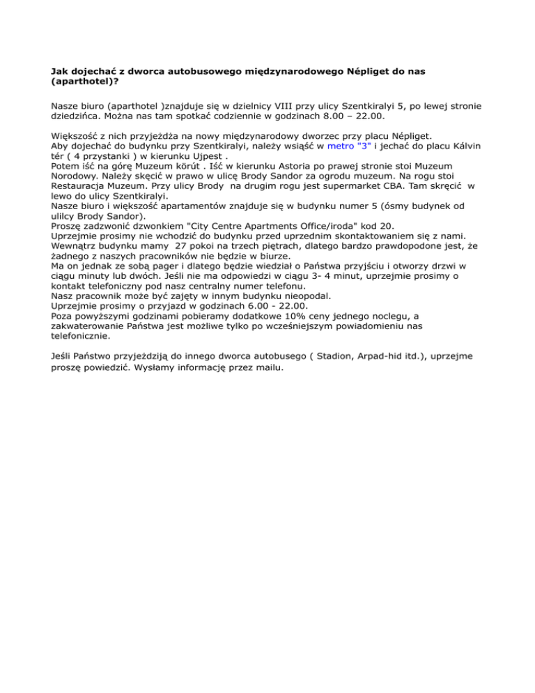 Jak dojechać z dworca autobusowego międzynarodowego Népliget do nas (aparthotel)? Nasze biuro (aparthotel )znajduje się w dzielnicy VIII przy ulicy Szentkiralyi 5, po lewej stronie dziedzińca. Można nas tam spotkać codziennie w godzinach 8.00 – 22.00. Większość z nich przyjeżdża na nowy międzynarodowy dworzec przy placu Népliget. Aby dojechać do budynku przy Szentkiralyi, należy wsiąść w metro "3" i jechać do placu Kálvin tér ( 4 przystanki ) w kierunku Ujpest . Potem iść na górę Muzeum körút . Iść w kierunku Astoria po prawej stronie stoi Muzeum Norodowy. Należy skęcić w prawo w ulicę Brody Sandor za ogrodu muzeum. Na rogu stoi Restauracja Muzeum. Przy ulicy Brody na drugim rogu jest supermarket CBA. Tam skręcić w lewo do ulicy Szentkiralyi. Nasze biuro i większość apartamentów znajduje się w budynku numer 5 (ósmy budynek od ulilcy Brody Sandor). Proszę zadzwonić dzwonkiem "City Centre Apartments Office/iroda" kod 20. Uprzejmie prosimy nie wchodzić do budynku przed uprzednim skontaktowaniem się z nami. Wewnątrz budynku mamy 27 pokoi na trzech piętrach, dlatego bardzo prawdopodone jest, że żadnego z naszych pracowników nie będzie w biurze. Ma on jednak ze sobą pager i dlatego będzie wiedział o Państwa przyjściu i otworzy drzwi w ciągu minuty lub dwóch. Jeśli nie ma odpowiedzi w ciągu 3- 4 minut, uprzejmie prosimy o kontakt telefoniczny pod nasz centralny numer telefonu. Nasz pracownik może być zajęty w innym budynku nieopodal. Uprzejmie prosimy o przyjazd w godzinach 6.00 - 22.00. Poza powyższymi godzinami pobieramy dodatkowe 10% ceny jednego noclegu, a zakwaterowanie Państwa jest możliwe tylko po wcześniejszym powiadomieniu nas telefonicznie. Jeśli Państwo przyjeżdziją do innego dworca autobusego ( Stadion, Arpad-hid itd.), uprzejme proszę powiedzić. Wysłamy informację przez mailu.