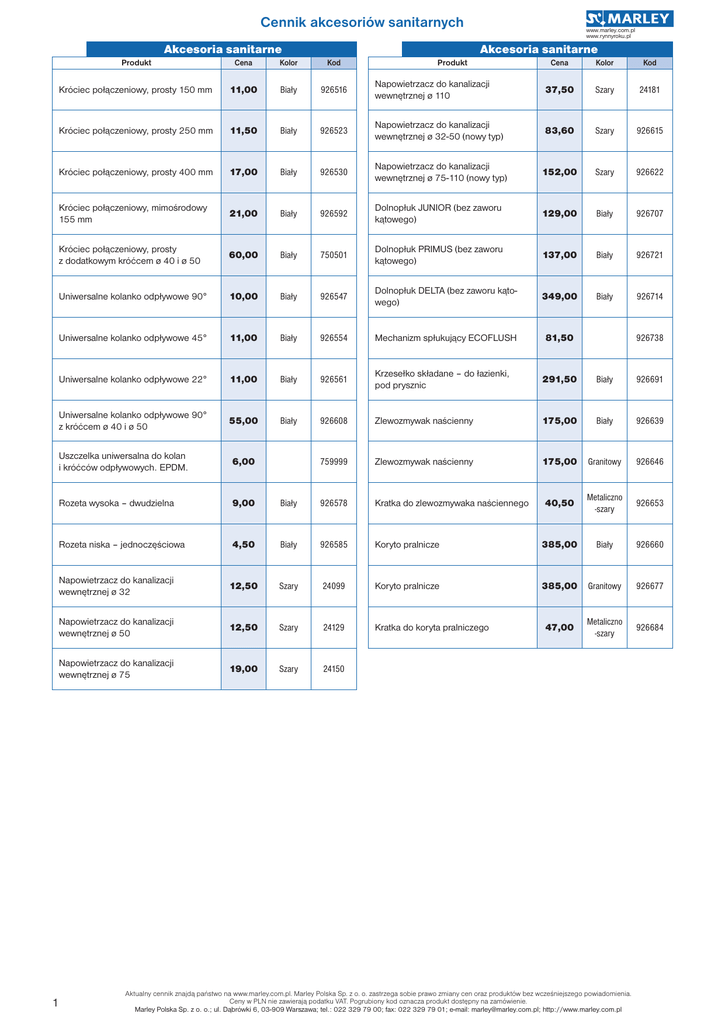Cennik akcesoriów sanitarnych Akcesoria sanitarne www.marley.com.pl www.rynnyroku.pl Akcesoria sanitarne Produkt Cena Kolor Kod Króciec połączeniowy, prosty 150 mm 11,00 Biały 926516 Króciec połączeniowy, prosty 250 mm 11,50 Biały Króciec połączeniowy, prosty 400 mm 17,00 Króciec połączeniowy, mimośrodowy 155 mm Produkt Cena Kolor Kod Napowietrzacz do kanalizacji wewnętrznej ø 110 37,50 Szary 24181 926523 Napowietrzacz do kanalizacji wewnętrznej ø 32-50 (nowy typ) 83,60 Szary 926615 Biały 926530 Napowietrzacz do kanalizacji wewnętrznej ø 75-110 (nowy typ) 152,00 Szary 926622 21,00 Biały 926592 Dolnopłuk JUNIOR (bez zaworu kątowego) 129,00 Biały 926707 Króciec połączeniowy, prosty z dodatkowym króćcem ø 40 i ø 50 60,00 Biały 750501 Dolnopłuk PRIMUS (bez zaworu kątowego) 137,00 Biały 926721 Uniwersalne kolanko odpływowe 90° 10,00 Biały 926547 Dolnopłuk DELTA (bez zaworu kątowego) 349,00 Biały 926714 Uniwersalne kolanko odpływowe 45° 11,00 Biały 926554 Mechanizm spłukujący ECOFLUSH 81,50 Uniwersalne kolanko odpływowe 22° 11,00 Biały 926561 Krzesełko składane – do łazienki, pod prysznic 291,50 Biały 926691 Uniwersalne kolanko odpływowe 90° z króćcem ø 40 i ø 50 55,00 Biały 926608 Zlewozmywak naścienny 175,00 Biały 926639 759999 Zlewozmywak naścienny 175,00 Granitowy 926646 40,50 Metaliczno -szary 926653 926738 Uszczelka uniwersalna do kolan i króćców odpływowych. EPDM. 6,00 Rozeta wysoka – dwudzielna 9,00 Biały 926578 Kratka do zlewozmywaka naściennego Rozeta niska – jednoczęściowa 4,50 Biały 926585 Koryto pralnicze 385,00 Biały 926660 Napowietrzacz do kanalizacji wewnętrznej ø 32 12,50 Szary 24099 Koryto pralnicze 385,00 Granitowy 926677 Napowietrzacz do kanalizacji wewnętrznej ø 50 12,50 Szary 24129 Kratka do koryta pralniczego 47,00 Metaliczno -szary 926684 Napowietrzacz do kanalizacji wewnętrznej ø 75 19,00 Szary 24150 1 Aktualny cennik znajdą państwo na www.marley.com.pl. Marley Polska Sp. z o. o. zastrzega sobie prawo zmiany cen oraz produktów bez wcześniejszego powiadomienia. Ceny w PLN nie zawierają podatku VAT. Pogrubiony kod oznacza produkt dostępny na zamówienie. Marley Polska Sp. z o. o.; ul. Dąbrówki 6, 03-909 Warszawa; tel.: 022 329 79 00; fax: 022 329 79 01; e-mail: [email protected]; http://www.marley.com.pl