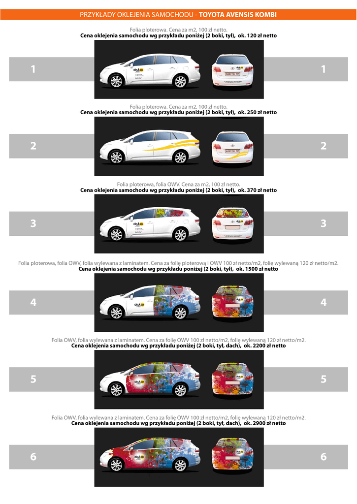 PRZYKŁADY OKLEJENIA SAMOCHODU - TOYOTA AVENSIS KOMBI Folia ploterowa. Cena za m2, 100 zł netto. Cena oklejenia samochodu wg przykładu poniżej (2 boki, tył), ok. 120 zł netto 1 1 Folia ploterowa. Cena za m2, 100 zł netto. Cena oklejenia samochodu wg przykładu poniżej (2 boki, tył), ok. 250 zł netto 2 2 Folia ploterowa, folia OWV. Cena za m2, 100 zł netto. Cena oklejenia samochodu wg przykładu poniżej (2 boki, tył), ok. 370 zł netto 3 3 Folia ploterowa, folia OWV, folia wylewana z laminatem. Cena za folię ploterową i OWV 100 zł netto/m2, folię wylewaną 120 zł netto/m2. Cena oklejenia samochodu wg przykładu poniżej (2 boki, tył), ok. 1500 zł netto 4 4 Folia OWV, folia wylewana z laminatem. Cena za folię OWV 100 zł netto/m2, folię wylewaną 120 zł netto/m2. Cena oklejenia samochodu wg przykładu poniżej (2 boki, tył, dach), ok. 2200 zł netto 5 5 Folia OWV, folia wylewana z laminatem. Cena za folię OWV 100 zł netto/m2, folię wylewaną 120 zł netto/m2. Cena oklejenia samochodu wg przykładu poniżej (2 boki, tył, dach), ok. 2900 zł netto 6 6