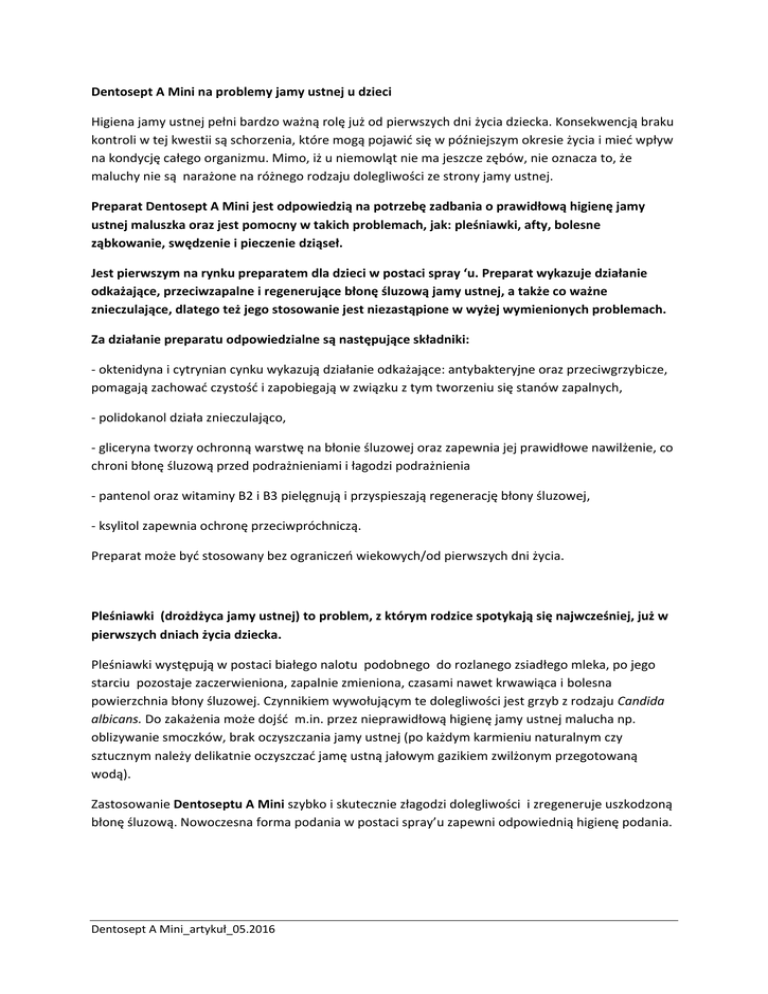 Dentosept A Mini na problemy jamy ustnej u dzieci Higiena jamy ustnej pełni bardzo ważną rolę już od pierwszych dni życia dziecka. Konsekwencją braku kontroli w tej kwestii są schorzenia, które mogą pojawić się w późniejszym okresie życia i mieć wpływ na kondycję całego organizmu. Mimo, iż u niemowląt nie ma jeszcze zębów, nie oznacza to, że maluchy nie są narażone na różnego rodzaju dolegliwości ze strony jamy ustnej. Preparat Dentosept A Mini jest odpowiedzią na potrzebę zadbania o prawidłową higienę jamy ustnej maluszka oraz jest pomocny w takich problemach, jak: pleśniawki, afty, bolesne ząbkowanie, swędzenie i pieczenie dziąseł. Jest pierwszym na rynku preparatem dla dzieci w postaci spray ‘u. Preparat wykazuje działanie odkażające, przeciwzapalne i regenerujące błonę śluzową jamy ustnej, a także co ważne znieczulające, dlatego też jego stosowanie jest niezastąpione w wyżej wymienionych problemach. Za działanie preparatu odpowiedzialne są następujące składniki: - oktenidyna i cytrynian cynku wykazują działanie odkażające: antybakteryjne oraz przeciwgrzybicze, pomagają zachować czystość i zapobiegają w związku z tym tworzeniu się stanów zapalnych, - polidokanol działa znieczulająco, - gliceryna tworzy ochronną warstwę na błonie śluzowej oraz zapewnia jej prawidłowe nawilżenie, co chroni błonę śluzową przed podrażnieniami i łagodzi podrażnienia - pantenol oraz witaminy B2 i B3 pielęgnują i przyspieszają regenerację błony śluzowej, - ksylitol zapewnia ochronę przeciwpróchniczą. Preparat może być stosowany bez ograniczeń wiekowych/od pierwszych dni życia. Pleśniawki (drożdżyca jamy ustnej) to problem, z którym rodzice spotykają się najwcześniej, już w pierwszych dniach życia dziecka. Pleśniawki występują w postaci białego nalotu podobnego do rozlanego zsiadłego mleka, po jego starciu pozostaje zaczerwieniona, zapalnie zmieniona, czasami nawet krwawiąca i bolesna powierzchnia błony śluzowej. Czynnikiem wywołującym te dolegliwości jest grzyb z rodzaju Candida albicans. Do zakażenia może dojść m.in. przez nieprawidłową higienę jamy ustnej malucha np. oblizywanie smoczków, brak oczyszczania jamy ustnej (po każdym karmieniu naturalnym czy sztucznym należy delikatnie oczyszczać jamę ustną jałowym gazikiem zwilżonym przegotowaną wodą). Zastosowanie Dentoseptu A Mini szybko i skutecznie złagodzi dolegliwości i zregeneruje uszkodzoną błonę śluzową. Nowoczesna forma podania w postaci spray’u zapewni odpowiednią higienę podania. Dentosept A Mini_artykuł_05.2016 Kolejny częsty problem u maluchów to zmiany aftowe, tzw. afty. Afty to nadżerki lub owrzodzenia błony śluzowej jamy ustnej otoczone rąbkiem zapalnym oraz pokryte tzw. włóknikiem. Ich przyczyna nie jest dokładnie znana, najczęściej wymienia się zaburzenia immunologiczne. Zazwyczaj obserwuje się małe afty. Leczenie miejscowe ma na celu zmniejszenie bólu oraz zagojenie się nadżerki. Dentosept A Mini dzięki swojemu bogatemu składowi również zniweluje przykre odczucia związane z pojawieniem się aft. Problem spędzający wielu rodzicom sen z powiek, to bolesne ząbkowanie swoich milusińskich. Ząbkowanie nie jest chorobą i powinno przebiegać bez powikłań miejscowych. Jednak często zdarza się, że towarzyszy mu silny ból, swędzenie oraz obrzęk dziąseł. Podczas ząbkowania można dziecku pomóc poprzez: - stosowanie masażu dziąseł, - podawanie schłodzonego gryzaka dla niemowląt, - miejscowe zastosowanie preparatów (głównie w postaci żelu) o działaniu znieczulającym , w co doskonale wpisuje się Dentosept A Mini w nowoczesnej formie spray’u, który oprócz działania znieczulającego działa również przeciwzapalnie na podrażnione dziąsło i zarazem regenerująco. Kolejna dolegliwość , która przybiera rozmiary choroby cywilizacyjnej to próchnica. W Polsce już u ponad 50 % dzieci w wieku trzech lat występują ubytki próchnicowe. Rozmiary próchnicy postępują wraz z wiekiem dzieci i u osiemnastoletniej młodzieży sięgają 96% wymienionej populacji. Na rozwój próchnicy mają wpływ cztery współdziałające czynniki: podatność, czyli zła jakość i słabe uwapnienie tkanek zęba, płytka bakteryjna odkładająca się na zębach i zawierająca bakterie kwasotwórcze inicjujące rozwój próchnicy, pożywka węglowodanowa (cukry) niezbędna dla bakterii do produkcji kwasów częste w ciągu dnia spożywanie sprzyjających próchnicy przekąsek i słodyczy. Powyższe czynniki najpierw demineralizują, czyli odwapniają szkliwo zębów, a następnie odsłonięta zostaje znajdująca się pod szkliwem mniej uwapniona zębina i rozpoczyna się powstawanie „dziury w zębie”, czyli ubytku próchnicowego w zębie wskutek bakteryjnego rozpadu zębiny. Próchnica wczesnego dzieciństwa, nazywana również próchnicą butelkową jest podstawową jednostką chorobową występującą jamie ustnej u dzieci. Dentosept A Mini_artykuł_05.2016 Podstawą zapobiegania próchnicy u najmłodszych jest ograniczenie przekazywania bakterii próchnicotwórczych nowo narodzonemu dziecku, a następnie staranna pielęgnacja kolejno wyrzynających się zębów mlecznych. Dentosept A Mini wpisuje się również w profilaktykę przeciwpróchnicową, zawiera ksylitol, który skutecznie obniża pH jamy ustnej i zapobiega namnażaniu się bakterii próchnicotwórczych oraz oktenidynę, która skutecznie unicestwia drobnoustroje. Zapobieganie powyższym problemom w jamie ustnej dziecka Najważniejszym elementem jest prawidłowa higiena jamy ustnej niemowląt i dzieci: - ograniczenie przekazywania nowo narodzonemu dziecku bakterii próchnicotwórczych tzn. nie należy: całować dziecka w usta, oblizywać smoczków, łyżeczek, nie jeść tymi samymi sztućcami co dziecko, - wykonywanie codziennych zabiegów higienicznych: przecieranie dziąseł gazikiem nasączonym wodą 