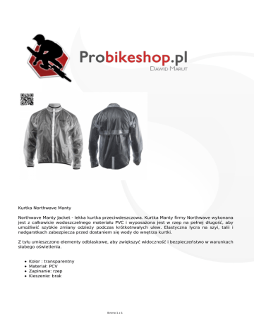 Kurtka Northwave Manty Northwave Manty Jacket - lekka kurtka przeciwdeszczowa. Kurtka Manty firmy Northwave wykonana jest z całkowicie wodoszczelnego materiału PVC i wyposażona jest w rzep na pełnej długość, aby umożliwić szybkie zmiany odzieży podczas krótkotrwałych ulew. Elastyczna lycra na szyi, talii i nadgarstkach zabezpiecza przed dostaniem się wody do wnętrza kurtki. Z tyłu umieszczono elementy odblaskowe, aby zwiększyć widoczność i bezpieczeństwo w warunkach słabego oświetlenia. Kolor : transparentny Materiał: PCV Zapinanie: rzep Kieszenie: brak Strona 1 z 1