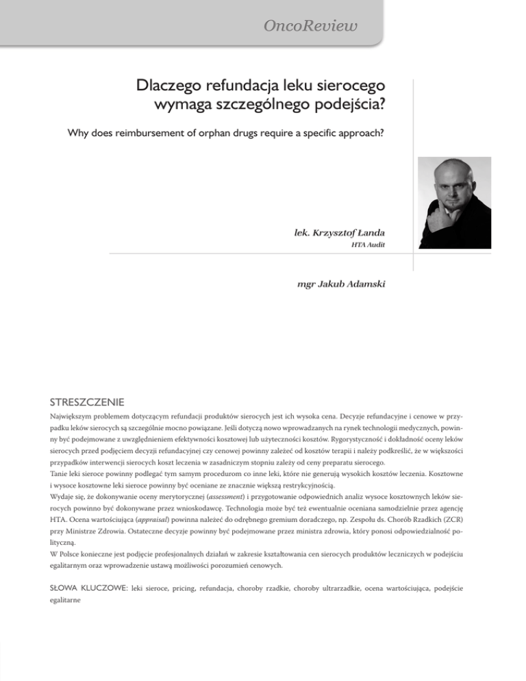 Dlaczego refundacja leku sierocego wymaga szczególnego podejścia? Why does reimbursement of orphan drugs require a specific approach? lek. Krzysztof Łanda HTA Audit mgr Jakub Adamski STRESZCZENIE Największym problemem dotyczącym refundacji produktów sierocych jest ich wysoka cena. Decyzje refundacyjne i cenowe w przypadku leków sierocych są szczególnie mocno powiązane. Jeśli dotyczą nowo wprowadzanych na rynek technologii medycznych, powinny być podejmowane z uwzględnieniem efektywności kosztowej lub użyteczności kosztów. Rygorystyczność i dokładność oceny leków sierocych przed podjęciem decyzji refundacyjnej czy cenowej powinny zależeć od kosztów terapii i należy podkreślić, że w większości przypadków interwencji sierocych koszt leczenia w zasadniczym stopniu zależy od ceny preparatu sierocego. Tanie leki sieroce powinny podlegać tym samym procedurom co inne leki, które nie generują wysokich kosztów leczenia. Kosztowne i wysoce kosztowne leki sieroce powinny być oceniane ze znacznie większą restrykcyjnością. Wydaje się, że dokonywanie oceny merytorycznej (assessment) i przygotowanie odpowiednich analiz wysoce kosztownych leków sierocych powinno być dokonywane przez wnioskodawcę. Technologia może być też ewentualnie oceniana samodzielnie przez agencję HTA. Ocena wartościująca (appraisal) powinna należeć do odrębnego gremium doradczego, np. Zespołu ds. Chorób Rzadkich (ZCR) przy Ministrze Zdrowia. Ostateczne decyzje powinny być podejmowane przez ministra zdrowia, który ponosi odpowiedzialność polityczną. W Polsce konieczne jest podjęcie profesjonalnych działań w zakresie kształtowania cen sierocych produktów leczniczych w podejściu egalitarnym oraz wprowadzenie ustawą możliwości porozumień cenowych. SŁOWA KLUCZOWE: leki sieroce, pricing, refundacja, choroby rzadkie, choroby ultrarzadkie, ocena wartościująca, podejście egalitarne Dlaczego refundacja leku sierocego wymaga szczególnego podejścia? K. Łanda, J. Adamski ABSTRACT The greatest problem concerning the reimbursement of orphan products is their high price. In the case of orphan drugs, reimbursement and pricing decisions are highly interrelated. In decisions concerning reimbursement of newly marketed health technologies, their cost-effectiveness or cost-utility should be taken into account. Rigorousness and thoroughness of evaluating an orphan drug prior to a reimbursement or pricing decision should depend on the cost of treatment and it should be stressed that for most orphan interventions costs of treatment depends mainly on the price of the orphan product. Low cost orphan drugs should be managed as all other drugs which do not generate high treatment costs. In the case of high and very high cost orphan drugs much more restrictive procedures should be applied in its assessment. Apparently, assessment of a very high cost orphan drug should be performed and appropriate analyses should be prepared by the applicant. Alternatively, the technology may be assessed by the HTA Agency itself. Appraisal should be performed by a separate advisory body, e.g. The Rare Diseases Team to the Minister of Health. The final decision should be made by the Minister of Health, who will bear political responsibility. In Poland appropriate state authorities have to undertake specific professional pricing activities with respect to orphan products in egalitarian approach and introduce risk sharing agreements by Law. KEY WORDS: orphan drugs, pricing, reimbursement, rare diseases, ultrarare diseases, appraisal, egalitarian approach Określenie sierocy odnosi się do interwencji medycznej. Okre- mów terapeutycznych, określono, że choroba ultrarzadka dotyka ślenia rzadki i ultrarzadki odnoszą się do choroby lub scho- nie więcej niż 750 osób w polskiej populacji. rzenia. Można przyjąć, że interwencja sieroca to jedyna interwencja o udowodnionej skuteczności w schorzeniu rzadkim SIEROCE PRODUKTY LECZNICZE lub ultrarzadkim (interwencja sieroca z klinicznego punktu Leki sieroce (orphan drugs) to zwyczajowa nazwa produk- widzenia). Jednak sieroce produkty lecznicze podlegają regu- tów leczniczych stosowanych w terapii rzadkich, przewlekłych lacjom prawnym, stąd obowiązujące definicje mają charakter i zagrażających życiu chorób. Leki te zostały nazwane sierocymi, systemowy, a nazwa sierocy produkt leczniczy jest dziś poję- gdyż bardzo mała liczba pacjentów nie stanowiła dla firm farma- ciem złożonym. ceutycznych atrakcyjnego inwestycyjnie obszaru. CHOROBY RZADKIE I ULTRARZADKIE 22 W UE przepisy dotyczące leczenia chorób rzadkich i zasad wprowadzania leków sierocych na rynek zostały uchwalone w 2000 r. Nie istnieje jedna, wspólna, ogólnoświatowa definicja chorób [4, 5]. Od listopada 2005 r. rejestracja centralna w przypadku rzadkich. W USA The Orphan Drug Act (1983) [1] definiuje, że leków sierocych jest obowiązkowa. Jednak w ramach centralnej choroba rzadka dotyczy mniej niż 200 000 mieszkańców USA procedury rejestracyjnej podmiot odpowiedzialny nie ustala ceny (czyli nie więcej niż 7 przypadków na 10 000 pacjentów); w Ja- leku, która miałaby obowiązywać na terenie całej Unii. ponii 2,5 na 10 000. Kryterium stosowane w UE przyjmuje, że Produkt leczniczy uzyskuje status sierocego produktu lecznicze- choroba rzadka występuje nie częściej niż u 5 osób na 10 000, go, jeśli spełnione są dwa kryteria: co odpowiada 246 000 mieszkańców UE. W Unii Europejskiej 1) jest przeznaczony do diagnostyki, profilaktyki lub leczenia cierpi na choroby rzadkie od 27 milionów do 36 milionów ludzi, zagrażającego życiu lub przewlekle upośledzającego schorze- a w USA blisko 25 milionów. nia, dotyczącego, w chwili składania wniosku o przyznanie Nie ma powszechnie przyjętych międzynarodowych czy unij- statusu, nie więcej niż pięciu na 10 000 osób w Unii Europej- nych definicji chorób ultrarzadkich. W Wielkiej Brytanii termin skiej