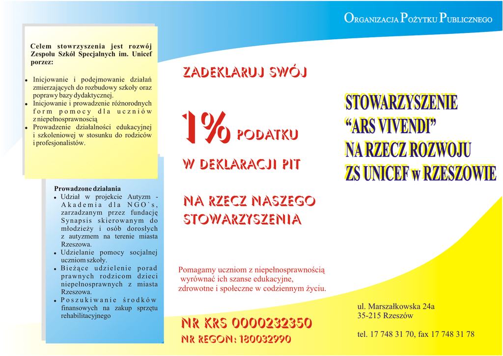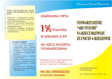 ORGANIZACJA PO¯YTKU PUBLICZNEGO Celem stowrzyszenia jest rozwój Zespo³u Szkó³ Specjalnych im. Unicef porzez: ! Inicjowanie i podejmowanie dzia³añ zmierzaj¹cych do rozbudowy szko³y oraz poprawy bazy dydaktycznej. ! Inicjowanie i prowadzenie ró¿norodnych form pomocy dla uczniów z niepe³nosprawnosci¹ ! Prowadzenie dzia³alnoœci edukacyjnej i szkoleniowej w stosunku do rodziców i profesjonalistów. Zadeklaruj swój 1% podatku w deklaracji PIT Prowadzone dzia³ania ! Udzia³ w projekcie Autyzm Akademia dla NGO`s, zarzadzanym przez fundacjê Synapsis skierowanym do m³odzie¿y i osób doros³ych z autyzmem na terenie miasta Rzeszowa. ! Udzielanie pomocy socjalnej uczniom szko³y. ! Bie¿¹ce udzielenie porad prawnych rodzicom dzieci niepe³nosprawnych z miasta Rzeszowa. ! Poszukiwanie œrodków finansowych na zakup sprzêtu rehabilitacyjnego STOWARZYSZENIE “ARS VIVENDI” NA RZECZ ROZWOJU ZS UNICEF w RZESZOWIE na rzecz naszego stowarzyszenia Pomagamy uczniom z niepe³nosprawnoœci¹ wyrównaæ ich szanse edukacyjne, zdrowotne i spo³eczne w codziennym ¿yciu. nr KRS 0000232350 nr REGON: 180032990 ul. Marsza³kowska 24a 35-215 Rzeszów tel. 17 748 31 70, fax 17 748 31 78 DZIA£ANIA PODJÊTE PRZEZ STOWARZYSZENIE “ARS VIVENDI” NA RZECZ UCZNIÓW ZSS im. UNICEF ! Zakup dwóch tablic interaktywnych na wyposa¿enie klas lekcyjnych. ! Zalety wykorzystania interaktywnych tablic w edukacji: ! ! Co to jest tablica interaktywna? Skuteczna, interaktywna i wzbogacona prezentacja uczniowie s¹ bardziej zainteresowani lekcj¹, skupiaj¹ uwagê na zagadnieniu Mo¿liwoœæ prowadzenia na ¿ywo pokazów i eksperymentów na lekcjach biologii, przyrody, chemii, fizyki oraz omawiania wyników w oparciu o widoczne na tablicy wykresy, tabele, zestawienia, do których na bie¿¹co mo¿na wprowadzaæ dane To urz¹dzenie o wygl¹dzie du¿ej tablicy, wspó³dzia³aj¹cej z komputerem i projektorem multimedialnym. Tablica pe³ni rolê wielkiego monitora, który reaguje na dotyk specjalnego pióra. Dziêki temu osoba stoj¹ca przy tablicy mo¿e obs³ugiwaæ dowolny program uruchomiony w komputerze. Tablica ma ponadto w³asne oprogramowanie u³atwiaj¹ce prace nauczycielowi oraz pozwalaj¹ce na robienie notatek I zapisywanie ich w pamiêci komputera. Pozyskanie œrodków finansowych z Telewizji Polskiej w ramach akcji “Reklama Dzieciom” na zakup pomocy dydaktycznych. Stworzono bazê specjalistycznych pomocy dydaktycznych, potrzebnych do prowadzenia efektywnych zajêæ rewalidacyjnych, pomagaj¹cych poprawiæ sprawnoœæ i samodzielnoœæ uczniów uczêszczaj¹cych do budynku szko³y przy ul. Ofiar Katynia 1. ! Uzyskanie dotacji na organizowanie cylkicznych imprez sportoworekreacyjnych i artystycznych dla uczniów. Podczas Wojewódzkiego Przegl¹du Zespo³ów Artystycznych czy Dnia Dziecka, uczniowie wygrywaj¹ nagrody, maj¹ mo¿liwoœæ prezentacji swoich talentów, rywalizuj¹ w zawodach sportowych.