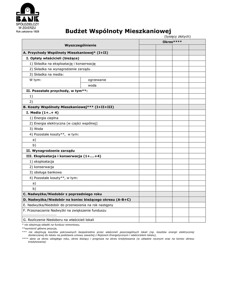 Budżet Wspólnoty Mieszkaniowej (tysięcy złotych) Okres**** Wyszczególnienie A. Przychody Wspólnoty Mieszkaniowej* (I+II) I. Opłaty właścicieli (bieżące) 1) Składka na eksploatację i konserwację 2) Składka na wynagrodzenie zarządu 3) Składka na media: W tym: ogrzewanie woda II. Pozostałe przychody, w tym**: 1) 2) B. Koszty Wspólnoty Mieszkaniowej*** (I+II+III) I. Media (1+..+ 4) 1) Energia cieplna 2) Energia elektryczna (w części wspólnej) 3) Woda 4) Pozostałe koszty**, w tym: a) b) II. Wynagrodzenie zarządu III. Eksploatacja i konserwacja (1+....+4) 1) eksploatacja 2) konserwacja 3) obsługa bankowa 4) Pozostałe koszty**, w tym: a) b) C. Nadwyżka/Niedobór z poprzedniego roku D. Nadwyżka/Niedobór na koniec bieżącego okresu (A-B+C) E. Nadwyżka/Niedobór do przeniesienia na rok następny F. Przeznaczenie Nadwyżki na zwiększenie funduszu ............................. G. Rozliczenie Niedoboru na właścicieli lokali * nie obejmują składki na fundusz remontowy, **wymienić główne pozycje, *** nie obejmują kosztów pokrywanych bezpośrednio przez właścicieli poszczególnych lokali (np. kosztów energii elektrycznej dostarczanej do lokalu na podstawie umowy zawartej z Rejonem Energetycznym i właścicielem lokalu), **** dane za okres ubiegłego roku, okres bieżący i prognoza na okres kredytowania (w układzie rocznym oraz na koniec okresu kredytowania) Informacje uzupełniające * Wyszczególnienie Okres** I Należności i roszczenia a) z tytułu opłat za zarządzanie nieruchomością wspólną od właścicieli lokali wchodzących w skład wspólnoty - w tym należności przeterminowane ogółem - w tym należności przeterminowane powyżej 3 m-cy b) z tytułu najmu lokali użytkowych - w tym należności przeterminowane - w tym należności przeterminowane powyżej 3 m-cy c) Pozostałe należności - w tym należności przeterminowane - w tym należności przeterminowane powyżej 3 m-cy II Środki pieniężne - w tym środki na rachunku funduszu remontowego III Fundusz remontowy IV Fundusze specjalne V Kredyty i pożyczki długoterminowe - w tym kredyty i pożyczki przeterminowane VI Kredyty i pożyczki krótkoterminowe - w tym kredyty i pożyczki przeterminowane VII Zobowiązania wobec właścicieli , w tym: a) krótkoterminowe b) zobowiązania przeterminowane VIII Zobowiązania wobec dostawców, w tym: a) krótkoterminowe b) zobowiązania przeterminowane IX Pozostałe zobowiązania , w tym: a) krótkoterminowe b) zobowiązania przeterminowane X Kwota występujących zaległości z tytułu opłat czynszowych (bez wpłat na Fundusz Remontowy) XI. Kwota występujących zaległości z tytułu funduszu remontowego XII Należności (kwota zadłużenia) od właścicieli lokali z tytułu opłat za zarządzanie nieruchomością wspólną na koniec danego okresu (bez zadłużenia z tytułu wpłat na Fundusz Remontowy) XII Kwota ściągniętych w danym okresie zaległości * dopuszczalna jest możliwość przyjęcia wzoru druku budżetu przedstawionego wg formatu Wspólnoty Mieszkaniowej ** dane za okres dwóch ubiegłych lat, okres bieżący i prognoza na okres kredytowania (w układzie rocznym oraz na koniec okresu kredytowania) MIEJSCOWOŚĆ, DATA PODPIS I PIECZĘĆ FIRMOWA WNIOSKODAWCY