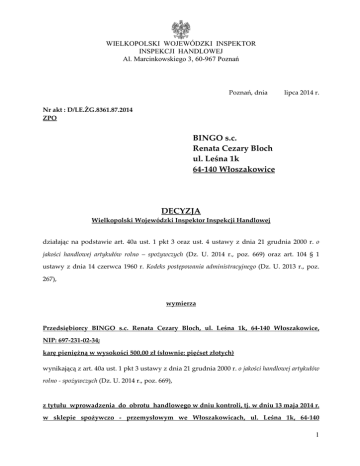 WIELKOPOLSKI WOJEWÓDZKI INSPEKTOR INSPEKCJI HANDLOWEJ Al. Marcinkowskiego 3, 60-967 Poznań Poznań, dnia lipca 2014 r. Nr akt : D/LE.ŻG.8361.87.2014 ZPO BINGO s.c. Renata Cezary Bloch ul. Leśna 1k 64-140 Włoszakowice DECYZJA Wielkopolski Wojewódzki Inspektor Inspekcji Handlowej działając na podstawie art. 40a ust. 1 pkt 3 oraz ust. 4 ustawy z dnia 21 grudnia 2000 r. o jakości handlowej artykułów rolno – spożywczych (Dz. U. 2014 r., poz. 669) oraz art. 104 § 1 ustawy z dnia 14 czerwca 1960 r. Kodeks postępowania administracyjnego (Dz. U. 2013 r., poz. 267), wymierza Przedsiębiorcy BINGO s.c. Renata Cezary Bloch, ul. Leśna 1k, 64-140 Włoszakowice, NIP: 697-231-02-34; karę pieniężną w wysokości 500,00 zł (słownie: pięćset złotych) wynikającą z art. 40a ust. 1 pkt 3 ustawy z dnia 21 grudnia 2000 r. o jakości handlowej artykułów rolno - spożywczych (Dz. U. 2014 r., poz. 669), z tytułu wprowadzenia do obrotu handlowego w dniu kontroli, tj. w dniu 13 maja 2014 r. w sklepie spożywczo - przemysłowym we Włoszakowicach, ul. Leśna 1k, 64-140 1 Włoszakowice, przedsiębiorca: BINGO s.c. Renata Cezary Bloch, ul. Leśna 1k, 64-140 Włoszakowice, artykułów rolno - spożywczych nieodpowiadających jakości handlowej określonej w przepisach o jakości handlowej, tj.: partia 2 kg kiełbasy morlińskiej, wieprzowej, średnio rozdrobnionej, wędzonej, parzonej, w cenie: 13,99 zł/kg, producent: ANIMEX FOODS Sp. z o.o. Sp. k-a., Morliny 15, 14-100 Ostróda, wartości: 27,98 zł; z uwagi na: brak w miejscu sprzedaży, na wywieszce lub w miejscu bezpośrednio dostępnym konsumentom wykazu składników, co stanowi naruszenie § 17 ust. 1 pkt 2 rozporządzenia Ministra Rolnictwa i Rozwoju Wsi z dnia 10 lipca 2007 r. w sprawie znakowania środków spożywczych (Dz. U., nr 137, poz. 966 z p. zm.). Oznakowanie zastosowane w zakwestionowanych artykułach było niezgodne (brak wykazu składników) z wymaganiami określonymi w w/w rozporządzeniu. Zastosowanie niepełnego oznakowania wprowadzało konsumentów w błąd co do składu nabywanego środka spożywczego, a tym samym w istotny sposób naruszało interesy konsumentów, czyniąc niemożliwym dokonanie właściwego wyboru. partia 1,5 kg kiełbasy poznańskiej, wieprzowej z dodatkiem surowców drobiowych, średnio rozdrobnionej, wędzonej, parzonej, w cenie: 14,60 zł/kg, producent: MRÓZ S.A., ul. Koźmińska 5a, 63-810 Borek Wlkp., wartości: 21,90 zł; z uwagi na: brak w miejscu sprzedaży, na wywieszce lub w miejscu bezpośrednio dostępnym konsumentom nazwy producenta oraz wykazu składników, co stanowi naruszenie § 17 ust. 1 pkt 1 i 2 rozporządzenia Ministra Rolnictwa i Rozwoju Wsi z dnia 10 lipca 2007 r. w sprawie znakowania środków spożywczych (Dz. U., nr 137, poz. 966 z p. zm.). Brak wymaganych elementów oznakowania w przypadku zakwestionowanych artykułów uniemożliwiał konsumentom uzyskanie informacji o składzie nabywanego środka spożywczego, a także uniemożliwiał identyfikację producenta zakwestionowanego artykułu. Tym samym w istotny sposób naruszał interesy konsumentów i uniemożliwiał dokonanie zgodnego z oczekiwaniami wyboru. 2 partia 5 szt. mięsa garmażeryjnego wieprzowego, łączna waga brutto: 2,545 kg, w cenie: 10,50 zł/kg, producent: P.P.H.U. JOHN, Grotniki, ul. Źródlana 5, 64-140 Włoszakowice, wartości: 26,72 zł; z uwagi na: z uwagi na: zastosowanie nazwy wyrobu wprowadzającej konsumentów w błąd, co do zawartości składnika występującego w nazwie artykułu spożywczego, poprzez zastosowanie nazwy „mięso garmażeryjne wieprzowe”, podczas gdy w składzie produktu znajdowało się 42 % mięsa wieprzowego oraz 42 % mięsa wołowego, co stanowi naruszenie art. 16 rozporządzenia Parlamentu i Rady (WE) nr 178/2002 z dnia 28 czerwca 2002 r. ustanawiającego ogólne zasady i wymagania prawa żywnościowego, powołującego Europejski Urząd ds. Bezpieczeństwa Żywności oraz ustanawiającego procedury w zakresie bezpieczeństwa żywności (Dz. Urz. UE L 31 z 1.02.2002 r. z p. zm.) oraz art. 6 ust. 3 ustawy z dnia 21 grudnia 2000 r. o jakości artykułów rolno-spożywczych (Dz. U. 2014 r., poz. 669); ponadto z uwagi na: brak w miejscu sprzedaży, na wywieszce lub w miejscu bezpośrednio dostępnym konsumentom informacji o masie netto, co stanowi naruszenie § 2 ust. 1 pkt 6 rozporządzenia Ministra Rolnictwa i Rozwoju Wsi z dnia 10 lipca 2007 r. w sprawie znakowania środków spożywczych (Dz. U., nr 137, poz. 966 z p. zm.). Zastosowanie niepełnego, wymaganego przepisami w/w rozporządzenia oznakowania powyższych środków spożywczych uniemożliwiało konsumentom uzyskanie informacji o rzeczywistej ilości oferowanego do sprzedaży artykułu. Natomiast zastosowanie nazwy wyrobu nie odpowiadającej jego składowi stanowi praktykę wprowadzającą konsumentów w błąd co do składu danego środka spożywczego, a przez to uniemożliwiającą dokonanie przez konsumenta wyboru zgodnego z jego zamiarami. Kontrolowany wprowadził zatem do obrotu artykuły rolno-spożywcze nieodpowiadające jakości handlowej określonej w przepisach o jakości handlowej, co skutkuje zastosowaniem art. 40a ust. 1 pkt 3 ustawy o jakości handlowej artykułów rolno-spożywczych (Dz. U. 2014 r., poz. 669). „Kto wprowadza do obrotu artykuły rolno - spożywcze nieodpowiadające jakości handlowej określonej w przepisach o jakości handlowej lub deklarowanej przez producenta w oznakowaniu tych artykułów, podlega karze pieniężnej w wysokości do 3 pięciokrotnej wartości korzyści majątkowej uzyskanej lub która mogłaby zostać uzyskana przez wprowadzenie tych artykułów rolno - spożywczych do obrotu, nie niższej jednak niż 500 zł”. Uzasadnienie Podczas kontroli przeprowadzonej przez Wojewódzki Inspektorat Inspekcji Handlowej w Poznaniu Delegaturę w Lesznie, w dniach od 13 do 20 maja 2014 r. w sklepie spożywczo przemysłowym we Włoszakowicach, ul. Leśna 1k, 64-140 Włosza