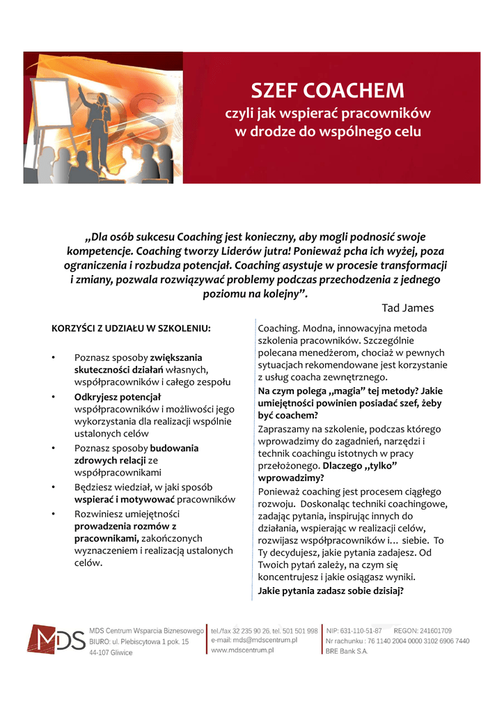 SZEF COACHEM czyli jak wspierać pracowników w drodze do wspólnego celu „Dla osób sukcesu Coaching jest konieczny, aby mogli podnosić swoje kompetencje. Coaching tworzy Liderów jutra! Ponieważ pcha ich wyżej, poza ograniczenia i rozbudza potencjał. Coaching asystuje w procesie transformacji i zmiany, pozwala rozwiązywać problemy podczas przechodzenia z jednego poziomu na kolejny”. Tad James KORZYŚCI Z UDZIAŁU W SZKOLENIU: • • • • • Poznasz sposoby zwiększania skuteczności działań własnych, współpracowników i całego zespołu Odkryjesz potencjał współpracowników i możliwości jego wykorzystania dla realizacji wspólnie ustalonych celów Poznasz sposoby budowania zdrowych relacji ze współpracownikami Będziesz wiedział, w jaki sposób wspierać i motywować pracowników Rozwiniesz umiejętności prowadzenia rozmów z pracownikami, zakończonych wyznaczeniem i realizacją ustalonych celów. Coaching. Modna, innowacyjna metoda szkolenia pracowników. Szczególnie polecana menedżerom, chociaż w pewnych sytuacjach rekomendowane jest korzystanie z usług coacha zewnętrznego. Na czym polega „magia” tej metody? Jakie umiejętności powinien posiadać szef, żeby być coachem? Zapraszamy na szkolenie, podczas którego wprowadzimy do zagadnień, narzędzi i technik coachingu istotnych w pracy przełożonego. Dlaczego „tylko” wprowadzimy? Ponieważ coaching jest procesem ciągłego rozwoju. Doskonaląc techniki coachingowe, zadając pytania, inspirując innych do działania, wspierając w realizacji celów, rozwijasz współpracowników i… siebie. To Ty decydujesz, jakie pytania zadajesz. Od Twoich pytań zależy, na czym się koncentrujesz i jakie osiągasz wyniki. Jakie pytania zadasz sobie dzisiaj? SZEF COACHEM czyli jak wspierać pracowników w drodze do wspólnego celu PROGRAM SZKOLENIA • • • • Czym jest coaching? – Definicja i zasady coachingu – Coaching a mentoring i inne formy rozwoju – Rola coachingu w pracy menedżera – Kiedy i dla kogo jest coaching? Kompetencje menedżera-coacha – Identyfikacja kompetencji szefacoacha – Budowanie relacji opartej na zaufaniu – Pułapki komunikacji – Aktywne słuchanie – Empatia – Techniki zadawania pytań Gdzie obecnie „znajduje się” pracownik? – narzędzia oceny sytuacji – Poziomy neurologiczne Roberta Diltsa – Pytania o motywy i wartości – Autobiografia – Praktyczny schemat – Okno Johari – Ocena 360 stopni – Ankiety – Wywiady telefoniczne Informacja zwrotna – Udzielanie informacji zwrotnej – Przyjmowanie informacji zwrotnej od pracownika – Błędy i pułapki, których należy unikać • • • • • • • Sesja coachingowa – Teorie uczenia się dorosłych – Przygotowanie sesji – Jak dobierać narzędzia do potrzeb rozwoju pracownika? – Struktura sesji – Przewidywanie trudności podczas sesji – Sposoby prowadzenia rozmów Ustalanie celów – Hierarchia celów – Cele dotyczące wykonania zadania – Cele dotyczące uczenia się – Cele firmy i cele biznesowe – Połączenie celów osobistych z celami firmy – Definiowanie korzyści ze zmiany Ustalenie planu działania – coach, coachee i reguła SMART Wsparcie pracownika w procesie zmiany: – Cykl zmiany: smutek, zaprzeczenie, gniew, targowanie się, depresja, akceptacja – Samoograniczające przekonania – Schematy błędnego myślenia Monitorowanie postępów i rozliczanie z podjętych zobowiązań Działania po zakończeniu sesji Trening prowadzenia sesji coachingowej SZEF COACHEM czyli jak wspierać pracowników w drodze do wspólnego celu Czas trwania szkolenia: 2 dni, 16 godzin zajęć, Godziny zajęć: 9:00-17:00 Termin: do ustalenia. Miejsce: Do ustalenia. Cena szkolenia: do ustalenia. Cena obejmuje: • analizę potrzeb szkoleniowych • materiały szkoleniowe dla uczestnika • przerwy kawowe, lunch • zaświadczenie o ukończeniu szkolenia Dlaczego warto przyjść na szkolenie? • Program szkolenia jest przygotowany z uwzględnieniem Twoich potrzeb i oczekiwań – poznajemy je dzięki ankiecie potrzeb szkoleniowych • Poznajesz swoje słabe i mocne strony w komunikacji z pracownikami • Wzbogacasz swoją wiedzę o skuteczne i sprawdzone narzędzia i techniki coachingowe • Uczysz się na przykładach i doświadczeniach Trenera/Coacha • Otrzymujesz od Trenera/Coacha informację zwrotną na temat obszarów wymagających doskonalenia. Prowadzący: Szef, Trener i Coach z ponad 10-letnim doświadczeniem w zarządzaniu m.in. sprzedażą i zespołami, dzięki czemu masz gwarancję poznania przykładów odnoszących się do praktyki i wypracowania rozwiązań najbardziej dostosowanych do realiów z życia szefa. W trakcie warsztatów prowadzący łączy swoje doświadczenie menedżerskie z kompetencjami trenera i coacha, dzięki którym panuje nad przebiegiem procesu szkoleniowego i zapewnia Ci efektywne wykorzystanie czasu trwania zajęć. Uwaga: Minimalna ilość uczestników wynosi 10 osób. W przypadku mniejszej liczby zgłoszonych osób, organizator podejmie decyzję o realizacji szkolenia lub przeniesieniu na inny termin.