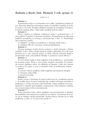 Zadania z fizyki (Inż. Biomed. I rok, grupa 1) zestaw nr 2 Zadanie 1 Zawodniczka stojąca na trampolinie rzuca piłkę z prędkością poziomą 15 m/s. Rzucając piłkę traci równowagę i spada z trampoliny wpadając do wody po czasie 1 s do wody. W jakiej odłeglości znajduje się trampolina od miejsca, w którym upadnie piłka ? Jaka będzie prędkość końcowa piłki ? Zadanie 2 Zbocze wzgórza na poligonie wojskowym tworzy z poziomem kąt α. U stóp wzgórza w punkcie A ustawiono moździerz. Wystrzeliwane pociski mają prędkość początkową v0 tworzącą z poziomem kąt β (Rys. 1). Zaniedbując opór powietrza znaleźć: a) odległość r pocisku od moździerza w dowolnej chwili czasu t, b) odległość AB=R i otrzymany wynik przedyskutować. Zadanie 3 Pionowo spadająca kropla deszczu posiada w chwili uderzenia o Ziemię szybkość 15 m/s. Jedna z kropli wpada do studni o głebokości 10 m. Ile czasu potrzeba na to, aby człowiek stojący na Ziemi usłyszał uderzenie kropli o powierzchnie wody, jesli predkość dźwięku w powietrzu wynosi 340 m/s ? Zadanie 4 Po rzece płynie łódka ze stałą względem wody prędkością v1 , prostopadłą do kierunku prądu. Woda w rzece płynie wszędzie równolegle do brzegów, ale wartość prędkości zależy od odległości od brzegów i dana jest wzorem v2 =v0 sin(πy/L), gdzie v0 oraz L (szerokość rzeki) są wielkościami stałymi. Znaleźć: a) wartość wektora prędkości łódki względem nieruchomych brzegów, b) równania ruchu łódki, c) kształt toru łódki. Zadanie 6 Kolista tarcza o promieniu R wiruje wokół swej osi z prędkością kątową ω. Ze środka tarczy wyrusza biedronka idąc wzdłuż wybranego promienia z prędkoącią v0 . Podaj równania ruchu biedronki, wektor prędkości oraz przyspieszenia w układzie kartezjańskim i biegunowym. Policz składowe radialną oraz transwersalną wektora przyspieszenia. Zadanie* 7 Podaj równiania ruchu, wektor prędkości oraz przyspieszenia w układzie kartezjańskim oraz biegunowym punktu P na obręczy o promieniu R toczącej się po idealnie równej powierzchni. Środek obręczy porusza się ze stałą prędkością v0 (Rys. 2). Co jest torem punkt P ? 1 B. vo β α A Rysunek 1: P R vo Rysunek 2: Zadanie* 8 Wiedząc, że podczas ruchu punktu P kąt pomiędzy kierunkiem wektora wodzącego r a kierunkiem prędkości v jest stały, znaleźś we współrzędnych biegunowych równanie toru. Przyjąc warunki początkowe Θ(0) = 0, r(0) = r0 . Wynik przedyskutowac w zależnosci od kąta Θ (HR, I/10). Literatura Hennel et al., Zadania i problemy z fizyki, tom 1. Resnick, Halliday, Fizyka 1 2