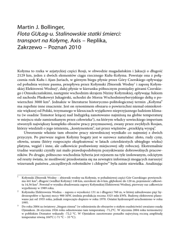 Martin J. Bollinger, Flota GUŁag-u. Stalinowskie statki śmierci: transport na Kołymę, Axis – Replika, Zakrzewo – Poznań 2010 Kołyma to rzeka w azjatyckiej części Rosji, w obwodzie magadańskim i Jakucji o długość 2129 km, jeden z dwóch elementów ciągu rzecznego Kułu-Kołyma. Powstaje ona z połączenia rzek Kułu i Ajan-Juriach, w górnym biegu płynie przez Góry Czerskiego opływając od południa wyższe pasma, przepływa przez Kołymski Zbiornik Wodny1 i zaporę Kołymskiej Elektrowni Wodnej2, dalej płynie w kierunku północnym pomiędzy górami Czerskiego i Omsukczańskimi, następnie wschodnim skrajem Niziny Kołymskiej, opływając łukiem od zachodu Płaskowyż Jukagirski, uchodzi do Morza Wschodniosyberyjskiego deltą o powierzchni 3000 km². Jednakże w literaturze historyczno-politologicznej termin „Kołyma” ma zupełnie inne znaczenie. Jest on synonimem obszaru o powierzchni niemal ośmiokrotnie większej od Polski, trzymanego w kleszczach wyjątkowo nieprzyjaznego ludziom klimatu (w osadzie Tomotor leżącej nad Indygirką zanotowano najniższą na globie temperaturę w miejscu stale zamieszkanym przez człowieka3), na którym władcy sowieckiego imperium stworzyli największy kompleks obozów pracy przymusowej, zwany przez zwykłych Rosjan, którzy wiedzieli o jego istnieniu, „kontynentem”, zaś przez więźniów „przeklętą wyspą”. Utworzenie właśnie tam obozów pracy niewolniczej wynikało co najmniej z dwóch przyczyn. Po pierwsze region Kołymy bogaty jest w surowce naturalne: złoto, rudy cyny, ołowiu, uranu (który rozpoczęto eksploatować w latach czterdziestych ubiegłego wieku) platyna, węgiel i inne, ale całkowicie pozbawiony miejscowej siły roboczej. Ekstremalnie trudne warunki czyniły zaś mało prawdopodobnym pozyskiwanie dobrowolnych pracowników. Po drugie, północno-wschodnia Syberia jest rejonem na tyle izolowanym, odciętym od reszty świata, że możliwość przedostania się na zewnątrz informacji mogących naruszyć wizerunek państwa „szczęśliwych robotników i chłopów” była zaiste niewielka. Analizując 1 2 3 Kołymski Zbiornik Wodny – zbiornik wodny na Kołymie, w południowej części Gór Czerskiego: powierzchnia 441 km², długość (wzdłuż Kołymy) 148 km, szerokość do 6 km, głębokość do 120 m, pojemność całkowita 14,56 km³. Powstał w wyniku zbudowania zapory Kołymskiej Elektrowni Wodnej, pierwszy raz całkowicie wypełniony w 1989 roku. Kołymska Elektrownia Wodna – zapora o wysokości 131 m i długości 760 m, w której zabudowano pięć hydrozespołów o łącznej mocy 900 MW, średnia produkcja roczna 3325 mln kWh. Budowę elektrowni planowano już od 1935 roku, jednak rozpoczęto dopiero w roku 1970. Ostatni hydrozespół uruchomiono w roku 1995. Do roku 2004 za światowy „biegun zimna” (w odniesieniu do obszarów o stałym osadnictwie) uważano osadę Ojmiakon. 26 stycznia 1926 roku odnotowano tam temperaturę -71,2°C. W styczniu 2004 roku termometry w pobliskim Domator wskazały -72,2 °C. W Ojmiakon zanotowano ponadto najwyższą roczną amplitudę temperatur równą 104°C (-71 °C – 33 °C). 258 ROCZNIK BEZPIECZEŃSTWA MIĘDZYNARODOWEGO – 2011/2012 daty ukazywania się na Zachodzie publikacji dotyczących „nieludzkiej ziemi” przyznać przy tym trzeba, że przynajmniej druga z przedstawionych przesłanek okazała się słuszna. Decyzję o utworzeniu w regionie Kołymy kompleksu obozów pracy przymusowej podjęto pod koniec 1931 r. W tym celu powołano specjalną organizację gospodarczą, znaną pod nazwą skrótowca „dalstroj”4. Jego pierwszym szefem został Eduard Pietrowicz Bierzin. Robotników dostarczać miał „dalstrojowi” Zarząd Północno-Wschodnich Poprawczych Obozów Pracy (Siewwostłag), będący częścią olbrzymiej (powołanej w 1930 r.), a zarządzanej przez NKWD struktury określanej terminem Główny Zarząd Poprawczych Obozów Pracy i Kolonii (GUŁag). Z uwagi na położenie geograficzne regionu Kołymy w opisanych powyższej przedsięwzięciach od początku rolę kluczową odgrywał transport morski, łączący wschodnie zakończenie Kolei Transsyberyjskiej, czyli Władywostok z wybrzeżami „archipelagu GUŁag”, czyli Nagajewem (Magadanem)5 nad Morzem Ochockim, Ambarczykim leżącym u ujścia Kołymy nad Morzem Wschodniosyberyjskim6 i znajdującym się w górze biegu tej rzeki Niżniekołymskiem7. Znacznie mniejszą rolę odgrywał transport prowadzony z zachodnich, arktycznych krańców Związku Sowieckiego – Murmańska i Archangielska do Ambarczyka i Niżnokołymska. Jeden z aspektów związków GUŁag-u z transportem morskim, a mianowicie przewóz więźniów (zeków), stał się przedmiotem dociekań australijskiego badacza Martina J. Bollingera. Ich rezultatem jest praca Flota GUŁagu. Stalinowskie statki śmierci: transporty na Kołymę, wydanej wspólnie sumptem wielkopolskich oficyn Replika i Axis (tytuł oryginału” Stalin’s Slave Ships. Kolyma, the Gulag Fleet, and the Role of the West, Santa Barbara 2003). Autor skoncentrował się w swoich badaniach na dwóch głównych problemach: faktografii sowieckiej arktycznej flotylli eksploatowanej jako integralna część „dalstroju” i jednostek używanych w tym celu doraźnie oraz na pytaniu, ile na temat kołymskiej „fabryki śmierci” wiedział Zachód i na ile demokracje przyczyniły się do powstania, a następnie utrzymania obsługującej ją floty. Warstwa faktograficzna recenzowanej pozycji jest zaiste imponująca. Autor dokonał gigantycznej kwerendy archiwaliów i dostępnych publikacji, nawiązał kontakt z licznymi badaczami na całym świecie zajmujących się historią Związku Sowieckiego, wielkiego terroru i GUŁag-u, zdołał przeprowadzić wywiady z niektórymi z żyjących uczestników wydarzeń. Co ważne, nie idzie on łatwymi, przetartymi ścieżkami, a w sposób wysoce krytyczny podchodzi do opisywanych wydarzeń, poddając weryfikacj