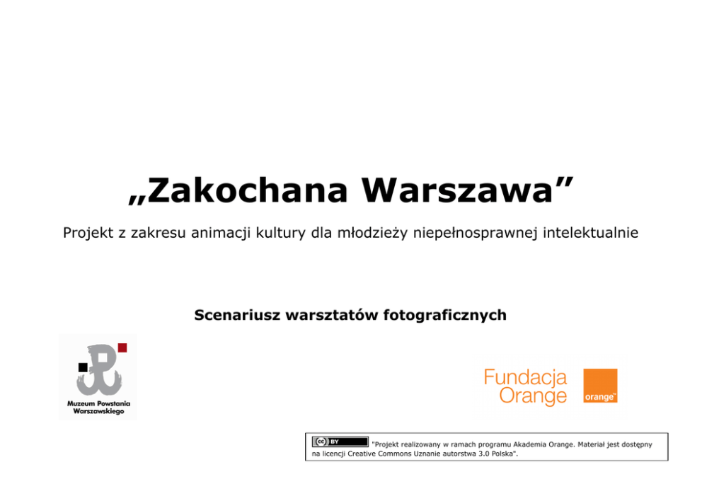 „Zakochana Warszawa” Projekt z zakresu animacji kultury dla młodzieŜy niepełnosprawnej intelektualnie Scenariusz warsztatów fotograficznych "Projekt realizowany w ramach programu Akademia Orange. Materiał jest dostępny na licencji Creative Commons Uznanie autorstwa 3.0 Polska". Warsztaty fotografowania – założenia: 1. Podstawowe zagadnienia techniczne i kompozycyjne; 2. Prosty język; 3. Dużo pytań, na które uczestnicy będą próbować odpowiadać; 4. Przykłady zdjęć wyświetlane na dużym ekranie; 5. Ćwiczenia, samodzielne fotografowanie - efekty widoczne na dużym ekranie; 6. Ćwiczenia w rozpoznawaniu tematów fotograficznych, ocenianiu zdjęć oraz układaniu fotoreportażu, wykonywane z użyciem dużych zdjęć wydrukowanych na papierze; 7. Brak tekstów w prezentacji - próby czytania będą rozpraszać. Pierwsze warsztaty fotograficzne: Na pierwsze spotkanie przygotujemy: zdjęcia i prezentacje do wyświetlania z komputera za pomocą projektora na dużym ekranie, wydruki zdjęć A4 do ćwiczeń, różne rodzaje aparatów do oglądania, aparat cyfrowy podłączony do projektora (przez komputer) do ćwiczeń fotograficznych. Wstęp Poznajemy się. Rozmawiamy o tym, kto z uczestników robi zdjęcia i jak nazywa się ktoś kto robi zdjęcia. Uczestnicy opowiadają o tym, jak oceniają swoje zdjęcia, jakich aparatów używają. 3 min / 0:03 1. Po co i jakie zdjęcia robimy? Szukamy odpowiedzi na pytanie „Po co robimy zdjęcia?”. Typowe sytuacje, w których fotografujemy. Do czego służą nam zdjęcia. Jakie są rodzaje fotografii. Oglądamy przykładowe zdjęcia na dużym ekranie i zgadujemy, jakie dziedziny fotografii reprezentują (fotografia przyrodnicza, krajobrazy, portrety, reporterskie, architektura, rodzinne, legitymacyjne, sportowe itd.) 5 min / 0:08 2. Jak działa aparat fotograficzny? Uczestnicy opowiadają, co wiedzą o tym, jak działa aparat fotograficzny. Czym różni się aparat analogowy od cyfrowego. Co się robi z filmem z aparatu analogowego. Jak się ogląda zdjęcia z aparatu cyfrowego (na ekranie aparatu, komputera, TV lub wydrukowane). 5 min / 0:13 3. Jakie są najważniejsze części aparatu? Znajdujemy ważne części, z których składa się aparat, nazywamy je i rozmawiamy o tym, do czego służą (obudowa, obiektyw, przycisk migawki, lampa błyskowa, ew. kilka trudniejszych pojęć - odwołanie do ich własnych aparatów). 4 min / 0:17 Camera obscura - uczestnicy wchodzą do wnętrza, żeby zobaczyć obraz, który powstaje w aparacie. 10 min / 0:27 4. Jakie są rodzaje aparatów? Uczestnicy opowiadają, jakie aparaty znają. Rozmawiamy o tym, czym się wyróżniają, do czego służą. Oglądamy różne aparaty (niektóre będą fizycznie dostępne do obejrzenia, inne przedstawione na zdjęciach na dużym ekranie). 4 min / 0:31 5. Analogowy aparat jednorazowy i porównanie z aparatami, które znają uczestnicy, Oglądamy aparat, z którego uczestnicy będą korzystać w czasie samodzielnego fotografowania. Wyjaśniamy, że to aparat analogowy i przypominamy, jak taki rodzaj aparatu działa i dlaczego będą musieli poczekać na obejrzenie zdjęć. 3 min / 0:34 6. Jak należy dbać o aparat? Rozmawiamy o tym, że aparat ma wiele delikatnych części i dlatego nie można nim rzucać, zostawiać na słońcu, na śniegu, w wodzie, w pyle. Jak czyścić aparat. 4 min / 0:38 7. Jak robimy zdjęcie? Uczestnicy starają się opowiedzieć o kolejnych czynnościach, które wykonujemy, robiąc zdjęcie. Tu według poradnika: • Trzymaj dobrze aparat. • Nie zasłaniaj obiektywu paskiem od aparatu albo palcem. • Pomyśl, co chcesz sfotografować. • Trzymaj aparat tak, żebyś w celowniku lub na ekranie widział to, co chcesz sfotografować. • Naciśnij przycisk, żeby zrobić zdjęcie. Postaraj się wtedy stać spokojnie i nie ruszać aparatem. • W aparacie cyfrowym możesz od razu zobaczyć zdjęcie, które zrobiłeś. Na koniec układamy we właściwej kolejności zdjęcia, które pokazują kolejne fazy robienia zdjęcia. 7 min / 0:45 Przerwa 10-15 minut. 8. Jakie zdjęcie jest dobre, a jakie nie? Oglądamy zdjęcia (wydrukowane w formacie A4). Dzielimy zdjęcia na dwie grupy: „dobre”, „złe” a następnie dyskutujemy, dlaczego są dobre lub złe. 7 min / 0:07 9. Jak robić dobre zdjęcia? Na co należy zwracać uwagę, aby zdjęcia, które robimy były dobre technicznie i ciekawe. Uczestnicy kolejno robią zdjęcia aparatem podłączonym do projektora (przez komputer) tak, aby efekt był widoczny na dużym ekranie. Najpierw robią zdjęcie „złe” np. poruszone, z daleka, z „obciętą” głową, które wspólnie oceniamy, a następnie poprawne. Według poradnika: • Dobre zdjęcie nie powinno być poruszone. Stój w miejscu i nie ruszaj aparatem. kiedy robisz zdjęcie. • Zdjęcia z daleka są mniej ciekawe. Podejdź bliżej. • Na zdjęciu powinno być tylko to, co ważne. Sprawdź, czy tło jest ładne. • Kiedy kadrujesz, sprawdzaj czy to, co ważne, będzie w całości na zdjęciu. Czy całe twarze mieszczą się na zdjęciu? • Śmiało eksperymentuj. Spróbuj patrzeć na świat jak ptak albo jak żaba. 12 min / 0:19 10. Czego fotograf nie może robić? Rozmawiamy o sytuacjach, w których nie wolno lub nie wypada robić zdjęć. O tym, że nie powinniśmy nikogo ośmieszać zdjęciem i że nie można publikować zdjęć bez zgody tego, kto jest na zdjęciu, chyba że robimy zdjęcia całym grupom ludzi na ulicy, zwiedzając albo uczestnicząc w różnych publicznych imprezach czy wydarzeniach. Opowiemy o tym, jak fotografować obcych ludzi na ulicy. 6 min / 0:25 11. Jak wybierać zdjęcia do pokazywania? Dlaczego nie należy pokazywać wszystkich zdjęć. Wybieranie zdjęć do wyrzucenia (najgorszych technicznie). Działamy wspólnie na zdjęciach wydrukowanych na papierze A4. Następnie z pozostałych zdjęć wybieramy najciekawsze, najlepsze. Na koniec porównujemy, jak ogląda się dużo zdjęć (dobryc