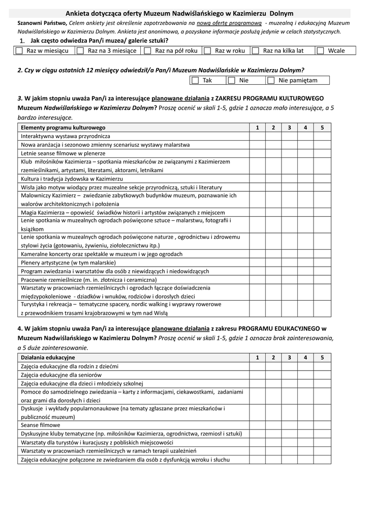 Ankieta dotycząca oferty Muzeum Nadwiślańskiego w Kazimierzu Dolnym Szanowni Państwo, Celem ankiety jest określenie zapotrzebowania na nową ofertę programową - muzealną i edukacyjną Muzeum Nadwiślańskiego w Kazimierzu Dolnym. Ankieta jest anonimowa, a pozyskane informacje posłużą jedynie w celach statystycznych. 1. Jak często odwiedza Pan/i muzea/ galerie sztuki? Raz w miesiącu Raz na 3 miesiące Raz na pół roku Raz w roku Raz na kilka lat Wcale 2. Czy w ciągu ostatnich 12 miesięcy odwiedził/a Pan/i Muzeum Nadwiślańskie w Kazimierzu Dolnym? Tak Nie Nie pamiętam 3. W jakim stopniu uważa Pan/i za interesujące planowane działania z ZAKRESU PROGRAMU KULTUROWEGO Muzeum Nadwiślańskiego w Kazimierzu Dolnym? Proszę ocenić w skali 1-5, gdzie 1 oznacza mało interesujące, a 5 bardzo interesujące. Elementy programu kulturowego Interaktywna wystawa przyrodnicza Nowa aranżacja i sezonowo zmienny scenariusz wystawy malarstwa Letnie seanse filmowe w plenerze Klub miłośników Kazimierza – spotkania mieszkańców ze związanymi z Kazimierzem rzemieślnikami, artystami, literatami, aktorami, letnikami Kultura i tradycja żydowska w Kazimierzu Wisła jako motyw wiodący przez muzealne sekcje przyrodniczą, sztuki i literatury Malowniczy Kazimierz – zwiedzanie zabytkowych budynków muzeum, poznawanie ich walorów architektonicznych i położenia Magia Kazimierza – opowieść świadków historii i artystów związanych z miejscem Lenie spotkania w muzealnych ogrodach poświęcone sztuce – malarstwu, fotografii i książkom Lenie spotkania w muzealnych ogrodach poświęcone naturze , ogrodnictwu i zdrowemu stylowi życia (gotowaniu, żywieniu, ziołolecznictwu itp.) Kameralne koncerty oraz spektakle w muzeum i w jego ogrodach Plenery artystyczne (w tym malarskie) Program zwiedzania i warsztatów dla osób z niewidzących i niedowidzących Pracownie rzemieślnicze (m. in. złotnicza i ceramiczna) Warsztaty w pracowniach rzemieślniczych i ogrodach łączące doświadczenia międzypokoleniowe - dziadków i wnuków, rodziców i dorosłych dzieci Turystyka i rekreacja – tematyczne spacery, nordic walking i wyprawy rowerowe z przewodnikiem trasami krajobrazowymi w tym nad Wisłą 1 2 3 4 5 4. W jakim stopniu uważa Pan/i za interesujące planowane działania z zakresu PROGRAMU EDUKACYJNEGO w Muzeum Nadwiślańskiego w Kazimierzu Dolnym? Proszę ocenić w skali 1-5, gdzie 1 oznacza brak zainteresowania, a 5 duże zainteresowanie. Działania edukacyjne Zajęcia edukacyjne dla rodzin z dziećmi Zajęcia edukacyjne dla seniorów Zajęcia edukacyjne dla dzieci i młodzieży szkolnej Pomoce do samodzielnego zwiedzania – karty z informacjami, ciekawostkami, zadaniami oraz grami dla dorosłych i dzieci Dyskusje i wykłady popularnonaukowe (na tematy zgłaszane przez mieszkańców i publiczność muzeum) Seanse filmowe Dyskusyjne kluby tematyczne (np. miłośników Kazimierza, ogrodnictwa, rzemiosł i sztuki) Warsztaty dla turystów i kuracjuszy z pobliskich miejscowości Warsztaty w pracowniach rzemieślniczych w ramach terapii uzależnień Zajęcia edukacyjne połączone ze zwiedzaniem dla osób z dysfunkcją wzroku i słuchu 1 2 3 4 5 5. W jakim stopniu uważa Pan/i za potrzebne wprowadzenie następujących elementów infrastrukturalnych w Muzeum Nadwiślańskim w Kazimierzu Dolnym? Proszę ocenić w skali 1-5, gdzie 1 oznacza, że elementy są mało potrzebne, a 5 że bardzo potrzebne. Elementy infrastrukturalne Odtworzenie ogrodów – renesansowego i zielono – kwiatowych i przystosowanie ich do działań edukacyjnych i kulturalnych Nowy wystrój wnętrz Muzeum Przystosowanie ekspozycji do odbioru przez osoby niepełnosprawne ruchowo i niewidzące Wielofunkcyjna sala edukacyjna 1 2 3 4 5 6.Czy byłby/aby Pan/i zainteresowany/a odwiedzinami Muzeum Nadwiślańskiego w Kazimierzu Dolnym w przyszłości aby skorzystać z NOWEJ OFERTY KULTURALNEJ I EDUKACYJNEJ, możliwej dzięki rozwiązaniom architektonicznym? Tak Nie 7. Jakiego sposób informowania o wydarzeniach kulturalno – artystycznych uważa Pan/i za przekonujący? Proszę o zaznaczenie max. 3 odpowiedzi. ulotki, Internet (strony www) Plakaty, ogłoszenia Znajomi, rodzina foldery radio media społecznościowe (Facebook, Prasa Inne, jakie? …......... Twitter, Instagram) 8. Jaką cenę biletu normalnego za wstęp do Muzeum Nadwiślańskiego w Kazimierzu Dolnym w Krakowie byłby/aby Pan/i w stanie zapłacić, a jaką za zajęcia edukacyjne? Bilet wstępu Zajęcia edukacyjne METRYCZKA: Płeć: Kobieta Mężczyzna <10 zł 11-15 zł 16-20 zł 21-25 zł 26-30 zł >30 zł <10 zł 11-15 zł 16-20 zł 21-25 zł 26-30 zł >30 zł Wiek: <18 18-25 26-36 37-49 50-65 66< Wykształcenie: Podstawowe Zawodowe Średnie Wyższe Miejsce zamieszkania: Kazimierz Dolny Województwo Lubelskie (poza Kazimierzem Dolnym) Inne województwo, kraj, jaki/e?.................................................. Status: Uczeń Student Pracujący Senior Osoby z niepełnosprawnością Rodzic Pasjonat sztuki i rzemiosła Pasjonat natury Wypoczywający na urlopie lub kuracjusz Dziękujemy za wypełnienie ankiety