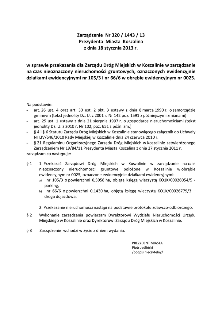 Zarządzenie Nr 320 / 1443 / 13 Prezydenta Miasta Koszalina z dnia 18 stycznia 2013 r. w sprawie przekazania dla Zarządu Dróg Miejskich w Koszalinie w zarządzanie na czas nieoznaczony nieruchomości gruntowych, oznaczonych ewidencyjnie działkami ewidencyjnymi nr 105/3 i nr 66/6 w obrębie ewidencyjnym nr 0025. Na podstawie: - art. 26 ust. 4 oraz art. 30 ust. 2 pkt. 3 ustawy z dnia 8 marca 1990 r. o samorządzie gminnym (tekst jednolity Dz. U. z 2001 r. Nr 142 poz. 1591 z późniejszymi zmianami) - art. 25 ust. 1 ustawy z dnia 21 sierpnia 1997 r. o gospodarce nieruchomościami (tekst jednolity Dz. U. z 2010 r. Nr 102, poz. 651 z późn. zm.) - § 4 i § 6 Statutu Zarządu Dróg Miejskich w Koszalinie stanowiącego załącznik do Uchwały Nr LIV/646/2010 Rady Miejskiej w Koszalinie dnia 24 czerwca 2010 r. - § 21 Regulaminu Organizacyjnego Zarządu Dróg Miejskich w Koszalinie zatwierdzonego Zarządzeniem Nr 19/84/11 Prezydenta Miasta Koszalina z dnia 27 stycznia 2011 r. zarządzam co następuje: §1 1. Przekazać Zarządowi Dróg Miejskich w Koszalinie w zarządzanie na czas nieoznaczony nieruchomości gruntowe położone w Koszalinie w obrębie ewidencyjnym nr 0025, oznaczone ewidencyjnie działkami ewidencyjnymi: a) nr 105/3 o powierzchni 0,5058 ha, objętą księgą wieczystą KO1K/00026054/5 parking, b) nr 66/6 o powierzchni 0,1430 ha, objętą księgą wieczystą KO1K/00026779/3 – droga dojazdowa. 2. Przekazanie nieruchomości nastąpi na podstawie protokołu zdawczo-odbiorczego. §2 Wykonanie zarządzenia powierzam Dyrektorowi Wydziału Nieruchomości Urzędu Miejskiego w Koszalinie oraz Dyrektorowi Zarządu Dróg Miejskich w Koszalinie. §3 Zarządzenie wchodzi w życie z dniem wydania. PREZYDENT MIASTA Piotr Jedliński /podpis nieczytelny/ Uzasadnienie do Zarządzenia Nr ........ / ……./ 13 Prezydenta Miasta Koszalina z dnia .......................... 2013 r. w sprawie przekazania dla Zarządu Dróg Miejskich w Koszalinie w zarządzanie na czas nieoznaczony nieruchomości gruntowych, oznaczonych ewidencyjnie działkami nr 105/3 i nr 66/6 w obrębie ewidencyjnym nr 0025. Przedmiotowe nieruchomości stanowią własność Gminy Miasto Koszalin na podstawie decyzji Wojewody Koszalińskiego: – znak G.VI.7224/2/170/1/93 z dnia 18.05.1993 r. – działka 105/3, – znak G.VI.8222/2/11/299/91 – działka 66/6. Zgodnie z miejscowym planem zagospodarowania przestrzennego dla obszaru położonego w Koszalinie pomiędzy ulicami: Powstańców Wielkopolskich, Krakusa i Wandy, Gnieźnieńską, Sarzyńską, Działkową oraz terenem linii kolejowej relacji Koszalin – Białogard zatwierdzonym uchwałą nr XV/152/2007 Rady Miejskiej w Koszalinie z dnia 25 października 2007 r. przedmiotowe nieruchomości znajdują się na terenie oznaczonym symbolem 101 U – zabudowa usług komercyjnych. Zgodnie § 4 i § 6 statutu Zarządu Dróg Miejskich przedmiotem działania Zarządu jest zarządzanie drogami na nieruchomościach w granicach administracyjnych Miasta Koszalina przekazanymi przez organ w zarządzanie. Wobec powyższego zasadnym jest przekazać w zarządzanie na czas nieoznaczony Zarządowi Dróg Miejskich w Koszalinie nieruchomości gruntowych w obrębie ewidencyjnym nr 0025 oznaczonej ewidencyjnie działkami ewidencyjnymi: a) nr 105/3 stanowiącą w części parking b) nr 66/6 stanowiącą w części drogę dojazdową. Integralną częścią niniejszego zarządzenia jest załącznik, który stanowi mapa ewidencyjna. N-V.6870.5.2013.MR[255603_10, 255603_11]
