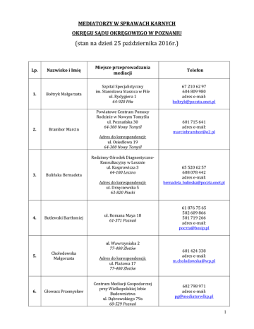 MEDIATORZY W SPRAWACH KARNYCH OKRĘGU SĄDU OKRĘGOWEGO W POZNANIU (stan na dzień 25 października 2016r.) Lp. 1. 2. Nazwisko i Imię Miejsce przeprowadzania mediacji Telefon Bołtryk Małgorzata Szpital Specjalistyczny im. Stanisława Staszica w Pile ul. Rydygiera 1 64-920 Piła 67 210 62 97 604 809 980 adres e-mail: , [email protected] b Brambor Marcin Powiatowe Centrum Pomocy Rodzinie w Nowym Tomyślu ul. Poznańska 30 64-300 Nowy Tomyśl 601 715 641 adres e-mail: [email protected] Adres do korespondencji: ul. Osiedlowa 19 64-300 Nowy Tomyśl 3. Bulińska Bernadeta Rodzinny Ośrodek DiagnostycznoKonsultacyjny w Lesznie ul. Kasprowicza 3 64-100 Leszno Adres do korespondencji: ul. Drzęczewska 5 63-820 Piaski 4. Butlewski Bartłomiej ul. Romana Maya 18 61-371 Poznań ul. Wawrzyniaka 2 77-400 Złotów 5. 6. Chołodowska Małgorzata Głowacz Przemysław Adres do korespondencji: ul. Plażowa 17 77-400 Złotów Centrum Mediacji Gospodarczej przy Wielkopolskiej Izbie Budownictwa ul. Dąbrowskiego 79a 60-529 Poznań 65 520 62 57 608 078 442 adres e-mail: , [email protected] b 61 876 75 65 502 609 866 501 719 266 adres e-mail: [email protected] 601 424 338 adres e-mail: [email protected] 602 798 971 adres e-mail: [email protected] 1 Adres do korespondencji: ul. Sokolnicza 3 62-330 Nekla 7. 8. 9. 10. Gojżewska Barbara Centrum Psychoterapii i Szkoleń Psychologicznych os. Tysiąclecia 71, piętro A 61-255 Poznań Gojżewski Witold Centrum Psychoterapii i Szkoleń Psychologicznych os. Tysiąclecia 71, piętro A 61-255 Poznań Grenda Barbara Wielkopolski Ośrodek Adopcyjny Filia w Pile ul. Drygasa 29 64-920 Piła Grubińska – Jaskuła Jolanta Spółdzielnia Inwalidów POWSTANIEC ul. Podgórna 16 64 – 200 Karpicko tel. 507 635 512 Adres do korespondencji: ul. Lipowa 22 A 64-200 Karpicko 11. 12. Guss Alicja Poradnia Zdrowia Psychicznego dla Dzieci Młodzieży i Dorosłych ul. Wojska Polskiego 49b 64-920 Piła Hinc Przemysław Jakub PJH Doradztwo Gosp. Sp. z o.o. spółka doradztwa podatkowego ul. Fabryczna 13/2 61-524 Poznań Pensjonat „Park” ul. Chopina 1 64-920 Piła 13. Iracka Magdalena Adres do korespondencji: ul. Olsztyńska 8a 64-920 Piła 61 870 14 64 600 259 519 adres e-mail: [email protected] 696 029 824 adres e-mail: [email protected] 606 594 060 adres e-mail: [email protected] 507 635 512 adres e-mail: [email protected] 693 408 948 adres e-mail: [email protected] 61 670 63 19 601 377 432 adres e-mail: [email protected] 67 213 84 11 608 592 952 adres e-mail: [email protected] 2 14. Jackowiak Agnieszka Powiatowe Centrum Pomocy Rodzinie ul. Nowe Wrota 7 63-800 Gostyń Adres do korespondencji: Bodzewo 59h 63-820 Piaski Szkoła Podstawowa nr 3 ul. Dąbrowskiego 2A 62-030 Luboń 15. Janicka Beata Adres do korespondencji: ul. Podgórna 40 62-030 Luboń 695 331 501 adres e-mail: [email protected] 61 810 53 17 501 034 665 adres e-mail: [email protected] ul. 17 Stycznia 90 64-100 Leszno 16. 17. Jasiak Karol Jaśkowiak – Maciejewska Monika Adres do korespondencji: ul. Powstańców Wlkp. 7 64 – 111 Lipno Fundacja Wspierania Rodziny „ADAMS” ul. Piękna 44 60-859 Poznań Adres do korespondencji: os. Jana III Sobieskiego 2/58 60-688 Poznań TEB Edukacja ul. Chrobrego 26 62-200 Gniezno 18. Karwowska Anna Adres do korespondencji Pawłowo 1 62-250 Czerniejewo 19. Kubiński Wojciech 20. Kuśnierz Zdzisław 21. Kwiatek Hanna Spółdzielnia Mieszkaniowa „Grunwald” Rada Osiedla Grunwald ul. Rynarzewska 9 61-133 Poznań ul. Roosevelta 7/12 64-920 Piła 603 944 380 adres e-mail: [email protected] 502 643 297 668 838 087 61 823 75 70 adres e-mail: [email protected] [email protected] 609 156 984 Adres e-mail: [email protected] 602 122 030 adres e-mail [email protected] 67 212 75 05 505 872 836 3 Poradnia PsychologicznoPedagogiczna ul. Zbąszyńska 11 62-065 Grodzisk Wlkp. Szkoła Podstawowa nr 3 ul. Dąbrowskiego 2a 62-030 Luboń 22. Leciej Grażyna Adres do korespondencji: ul. Spadzista 12a 62-030 Luboń Polskie Centrum Mediacji Oddział w Poznaniu ul. Szamotulska 40/1 60-366 Poznań 23. ,Łukaszewicz Anna Adres do korespondencji: ul. Międzychodzka 10/6 60-371 Poznań 24. 25. Łukasik Janusz ,Majorczyk Bożena - Powiatowe Centrum Pomocy Rodzinie ul. Dutkiewicza 5 63-100 Śrem Adres do korespondencji: ul. Jasna 17 63-100 Śrem 26. Matyaszczyk Maria 27. Michalski Jakub 61 44 45 037 609 130 558 adres e-mail: [email protected] 501 556 255 adres e-mail: [email protected] 535 353 354 adres e-mail: [email protected] 607 355 111 adres e-mail: [email protected] 790 244 211 adres e-mail: [email protected] Al. Krasińskiego 7 64-100 Leszno 65 529 63 60 adres e-mail: [email protected] Kancelaria Adwokacka ul. Śniadeckich 28/4 60-774 Poznań 500 084 194 adres e-mail: [email protected] 4 1. Zakład Doskonalenia Zawodowego ul. Jeleniogórska 4/6 60-179 Poznań 28. Mikołajczak Bartosz 2. Zakład Doskonalenia Zawodowego ul. Sikorskiego 21 63-100 Śrem 29. Młodak Anna ---------- 600 248 543 adres e-mail: [email protected] ---------- ul. Konińska 1a/2 61-045 Poznań 30. 31. ,Mnichowska-Galarda Aleksandra ,Monczakowski Michał Adres do korespondencji: ul. Pilska 11a 61-045 Poznań Klub Garnizonowy ul. Sikorskiego 4 63-100 Śrem Adres do korespondencji: ul. Wojska Polskiego 10b/5 63-100 Śrem 607 043 604 666 012 214 adres e-mail: [email protected] ul. Skarbowa 3 64-100 Leszno 32. Peda Krystyna 33. Raźniewska – Półkoszek Marzena 34. Ryfa Jakub Adres do korespondencji: ul. Drzymały 12 64-100 Leszno BOMIS ul. Wojskowa 6/E 5 60-792 Poznań ul. Przemysłowa 46A/18 61-541 Poznań „SPOT” ul. Dolna Wilda 87 61-501 Poznań 35. Sadowska Krystyna Adres do korespondencji: ul. Wagrowska 11/3 61-369 Poznań 65 520 15 61 500 147 725 601 629 929 (61) 671 29 24 adres e-mail: [email protected] 501 969 070 adres e-mail: [email protected] 61 667 50 02 604 289 191 adres e-mail: [email protected] 5 36. Szatkowska Danuta Złotowskie Centrum Aktywności Społecznej (Dom Kultury) Al. Piasta 26 77-400 Złotów 67 263 54 74