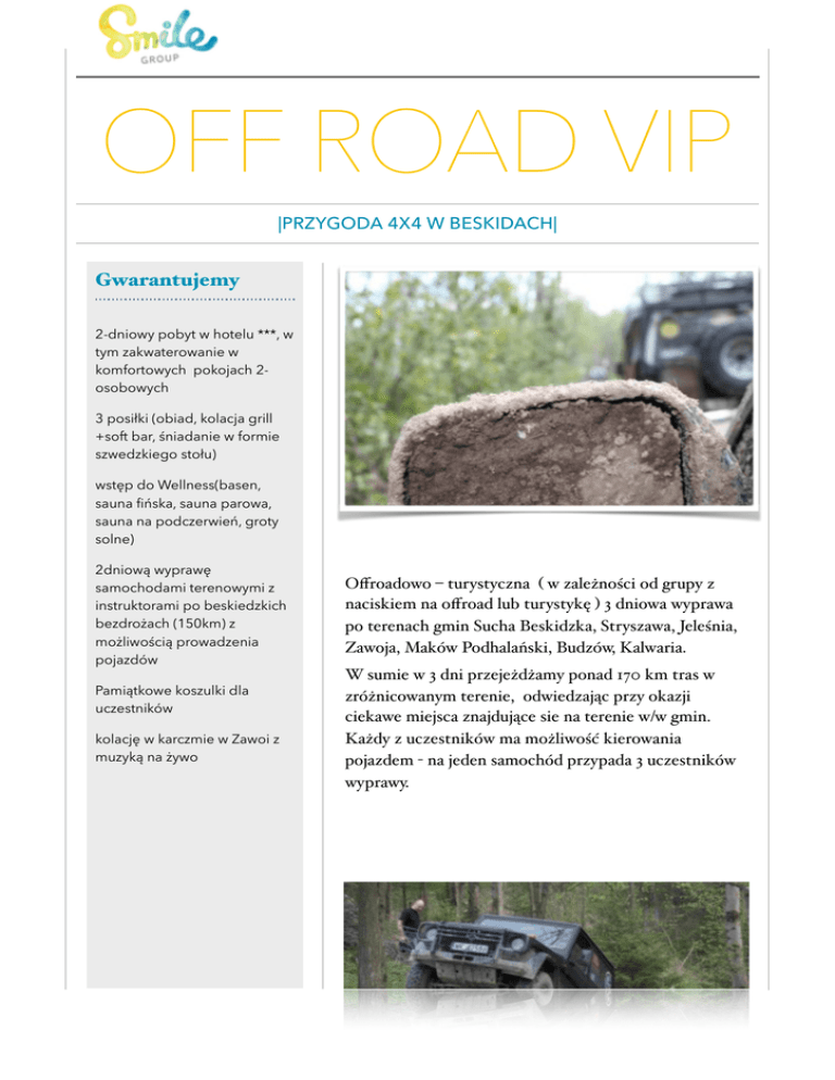 OFF ROAD VIP |PRZYGODA 4X4 W BESKIDACH| Gwarantujemy 2-dniowy pobyt w hotelu ***, w tym zakwaterowanie w komfortowych pokojach 2osobowych 3 posiłki (obiad, kolacja grill +soft bar, śniadanie w formie szwedzkiego stołu) wstęp do Wellness(basen, sauna fińska, sauna parowa, sauna na podczerwień, groty solne) 2dniową wyprawę samochodami terenowymi z instruktorami po beskiedzkich bezdrożach (150km) z możliwością prowadzenia pojazdów Pamiątkowe koszulki dla uczestników kolację w karczmie w Zawoi z muzyką na żywo Offroadowo – turystyczna ( w zależności od grupy z naciskiem na offroad lub turystykę ) 3 dniowa wyprawa po terenach gmin Sucha Beskidzka, Stryszawa, Jeleśnia, Zawoja, Maków Podhalański, Budzów, Kalwaria. W sumie w 3 dni przejeżdżamy ponad 170 km tras w zróżnicowanym terenie, odwiedzając przy okazji ciekawe miejsca znajdujące sie na terenie w/w gmin. Każdy z uczestników ma możliwość kierowania pojazdem - na jeden samochód przypada 3 uczestników wyprawy. PROPOZYCJA ZAKWATEROWANIA: