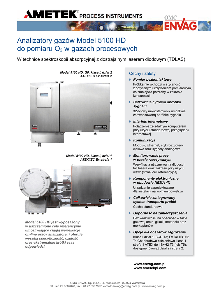 Analizatory gazów Model 5100 HD do pomiaru O2 w gazach procesowych W technice spektroskopii absorpcyjnej z dostrajalnym laserem diodowym (TDLAS) Model 5100 HD, GP, klasa I, dział 2 ATEX/IEC Ex strefa 2 Cechy i zalety Pomiar bezkontaktowy Próbka nie wchodzi w styczność z optycznym urządzeniem pomiarowym, co zmniejsza potrzeby w zakresie konserwacji Całkowicie cyfrowa obróbka sygnału 32-bitowy mikrosterownik umożliwia zaawansowaną obróbkę sygnału Interfejs internetowy Połączenie ze zdalnym komputerem przy użyciu standardowej przeglądarki internetowej Komunikacja Modbus, Ethernet, styki bezpotencjałowe oraz sygnały analogowe Model 5100 HD, klasa I, dział 1 ATEX/IEC Ex strefa 1 Monitorowanie pracy w czasie rzeczywistym Weryfikacja utrzymywania długości fali lasera oraz zakresu przy użyciu wewnętrznej celi referencyjnej Komponenty elektroniczne w obudowie NEMA 4X Urządzenie zaprojektowane dla instalacji na wolnym powietrzu Całkowicie zintegrowany system transportu próbki Cecha standardowa Odporność na zanieczyszczenia Model 5100 HD jest wyposażony w uszczelnione cele referencyjne umożliwiające ciągłą weryfikację on-line pracy analizatora, i oferuje wysoką specyficzność, czułość oraz ekstremalnie krótki czas odpowiedzi. Bez wrażliwości na obecność w fazie gazowej amin, glikoli, metanolu oraz merkaptanów Opcje dla obszarów zagrożenia Klasa I dział 1, BCD T3; Ex De IIB+H2 Ts Gb; obudowa ciśnieniowa klasa 1 strefa 1 ATEX de IIB+H2 T3 (lub T5); dostępne również dział 2 i strefa 2. www.envag.com.pl www.ametekpi.com OMC ENVAG Sp. z o.o., ul. Iwonicka 21, 02-924 Warszawa tel. +48 22 8587878, fax +48 22 8587897, e-mail: [email protected] www.envag.com.pl Analizator gazów Model 5100 HD Dane techniczne Typowy zakres roboczy: 0-1 % oraz 0-25 % Dokładność: 0,1 % (obj.) lub 2 % odczytu, większa z tych wartości Środowisko: Temperatura otoczenia: Od -20 °C do + 50 °C (od -4 °F do 122 °F) Klasyfikacja elektryczna: Klasa I dział 1, BCD T3; Ex De IIB+H2 T3 Gb; obudowa ciśnieniowa klasa 1 strefa 1 ATEX de IIB+H2 T3 (lub T5); dostępne również dział 2 i strefa 2. Wilgotność względna: Od 0 % do 90 %, bez kondensacji Natężenie przepływu próbki: Zalecane od 1 do 10 Nl/min (2 - 20 SCFH) Ciśnienie celi pomiarowej: Od 70 do 170 kPa abs. (10 - 25 psia). Odnośnie wyższych ciśnień należy skontaktować się z firmą AMETEK lub z przedstawicielem. 150 Freeport Road, Pittsburgh, PA 15238 Tel. +1-412-828-9040, fax +1-412-826-0399 www.ametekpi.com Temperatura celi pomiarowej: Zorientowana poziomo cela jest ulokowana wewnątrz pieca wraz z układem próbki i filtrem, dostępnym w różnych opcjach temperaturowych zależnie od środowiska zastosowania. Uwaga: próbka musi być doprowadzana do analizatora w fazie gazowej. Analizator może utrzymywać fazę gazową w odpowiedniej temperaturze, jednak nie powinien wykonywać funkcji odparowywania ciekłej próbki. Czas odpowiedzi: Odpowiedź fotometryczna < 1 s. Całkowita odpowiedź systemu jest uzależniona od natężenia przepływu próbki. Prezentacja odczytów: Ekran alfanumeryczny VF 4 wiersze po 20 znaków. Szybki Ethernet (IEEE802.3) RS-485 izolowany port szeregowy (obsługa Modicon Modbus RTU) (1) izolowane wyjście analogowe 4 - 20 mA z zasilaniem zewnętrznym (4) styki przekaźnikowe bezpotencjałowe. Maks. obciążenie 30 VAC, 60 VDC, 100 VA opornościowe Wymagane zasilanie elektryczne: 120 VAC (108-132 V); 47-63 Hz, lub 240 VAC (216-264 V); 47-63 Hz, lub 24 VDC (skontaktować się z firmą AMETEK lub przedstawicielem) Pobór mocy: Model 5100 HD: 450 W; bez ogrzewania 105 W Wymiary: (wys. x szer. x głęb.) Model 5100 HD: 67,4 cm x 83,0 cm x 30,5 cm (26,5 in. x 32,7 in. x 12,0 in.) Model 5100 HD ATEX strefa 1: 64,8 cm x 114,3 cm x 43,6 cm (25,5 in. x 45,0 in. x 17,1 in.) Ciężar: Model 5100 HD: 60 kg (132 lb) Model 5100 HD ATEX strefa 1: 114 kg (250 lb) Obudowa: IP-65, NEMA 4X Przedstawiciel w Polsce: OMC Envag Sp. z o.o. ul. Iwonicka 21, 02-924 Warszawa Tel. +48 (22) 858 7878 Fax +48 (22) 858 7897 E-mail: [email protected] www.envag.com.pl © 2015, by AMETEK, Inc. Wszelkie prawa zastrzeżone. F-0368, rew. 6 (0115) Element grupy innowacyjnych rozwiązań analizatorów procesowych firmy AMETEK Process Instruments. Dane techniczne mogą ulegać zmianom bez uprzedzenia. OMC ENVAG Sp. z o.o., ul. Iwonicka 21, 02-924 Warszawa tel. +48 22 8587878, fax +48 22 8587897, e-mail: [email protected] www.envag.com.pl