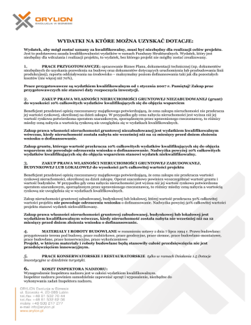WYDATKI NA KTÓRE MOŻNA UZYSKAĆ DOTACJE: Wydatek, aby mógł zostać uznany za kwalifikowalny, musi być niezbędny dla realizacji celów projektu. Jest to podstawowa zasada kwalifikowalności wydatków w ramach Funduszy Strukturalnych. Wydatek, który jest niezbędny dla wdrażania i realizacji projektu, to wydatek, bez którego projekt nie mógłby zostać zrealizowany. 1. PRACE PRZYGOTOWAWCZE: opracowanie Biznes Planu, dokumentacji technicznej (np. dokumentów niezbędnych do uzyskania pozwolenia na budowę oraz dokumentów dotyczących uruchomienia lub przebudowania linii produkcyjnej), raportu oddziaływania na środowisko – maksymalny poziom dofinansowania taki jak dla pozostałych kosztów (nie więcej niż 70%), Prace przygotowawcze są wydatkiem kwalifikowalnym od 1 stycznia 2007 r. Pamiętaj! Zakup prac przygotowawczych nie stanowi daty rozpoczęcia inwestycji. 2. ZAKUP PRAWA WŁASNOŚCI NIERUCHOMOŚCI GRUNTOWEJ NIEZABUDOWANEJ (grunt) do wysokości 10% całkowitych wydatków kwalifikujących się do objęcia wsparciem Beneficjent przedstawi opinię rzeczoznawcy majątkowego potwierdzającą, że cena zakupu nieruchomości nie przekracza jej wartości rynkowej, określonej na dzień zakupu. W przypadku gdy cena nabycia nieruchomości jest wyższa niż jej wartość rynkowa potwierdzona operatem szacunkowym, sporządzonym przez uprawnionego rzeczoznawcę, to różnicy miedzy ceną nabycia a wartością rynkową nie uwzględnia się w wydatkach kwalifikowalnych. Zakup prawa własności nieruchomości gruntowej niezabudowanej jest wydatkiem kwalifikowalnym wówczas, kiedy nieruchomość została nabyta nie wcześniej niż na 12 miesięcy przed dniem złożenia wniosku o dofinansowanie. Zakup gruntu, którego wartość przekracza 10% całkowitych wydatków kwalifikujących się do objęcia wsparciem nie powoduje odrzucenia wniosku o dofinansowanie. Nadwyżka powyżej 10% całkowitych wydatków kwalifikujących się do objęcia wsparciem stanowi wydatek niekwalifikowalny. 3. ZAKUP PRAWA WŁASNOŚCI NIERUCHOMOŚCI GRUNTOWEJ ZABUDOWANEJ, BUDYNKOWEJ LUB LOKALOWEJ do wysokości 50% całkowitej wartości projektu Beneficjent przedstawi opinię rzeczoznawcy majątkowego potwierdzającą, że cena zakupu nie przekracza wartości rynkowej nieruchomości, określonej na dzień zakupu. Operat szacunkowy powinien wyszczególniać wartość gruntu i wartość budynków. W przypadku gdy cena nabycia nieruchomości jest wyższa niż jej wartość rynkowa potwierdzona operatem szacunkowym, sporządzonym przez uprawnionego rzeczoznawcę, to różnicy miedzy ceną nabycia a wartością rynkową nie uwzględnia się w wydatkach kwalifikowalnych. Zakup nieruchomości gruntowej zabudowanej, budynkowej lub lokalowej, której wartość przekracza 50% całkowitej wartości projektu nie powoduje odrzucenia wniosku o dofinansowanie. Nadwyżka powyżej 50% całkowitej wartości projektu stanowi wydatek niekwalifikowany. Zakup prawa własności nieruchomości gruntowej zabudowanej, budynkowej lub lokalowej jest wydatkiem kwalifikowalnym wówczas, kiedy nieruchomość została nabyta nie wcześniej niż na 12 miesięcy przed dniem złożenia wniosku o dofinansowanie. 4. MATERIAŁY I ROBOTY BUDOWLANE w rozumieniu ustawy z dnia 7 lipca 1994 r. Prawo budowlane: przygotowanie terenu pod budowę, prace rozbiórkowe, prace geodezyjne, prace ziemne, prace budowlano-montażowe, prace budowlane, prace konserwacyjne, prace wykończeniowe Projekt, w którym materiały i roboty budowlane będą stanowiły całość przedsięwzięcia nie jest przedsięwzięciem innowacyjnym. 5. PRACE KONSERWATORSKIE I RESTAURATORSKIE tylko w ramach Działania 1.5 Dotacje inwestycyjne w dziedzinie turystyki. 6. KOSZT INSPEKTORA NADZORU: Wynagrodzenie Inspektora nadzoru jest w całości wydatkiem kwalifikowalnym. Inspektor nadzoru powinien samodzielnie zapewniać sprzęt i wyposażenie, niezbędne do wykonywania zadań Inspektora nadzoru. 7. ZAKUP ŚRODKÓW TRWAŁYCH: a) Zakup (cena zakupu) nowego środka trwałego -zakupiony środek trwały będzie włączony w ewidencję środków trwałych i amortyzowany. Majątek wytworzony w wyniku realizacji projektu powinien pozostać własnością Beneficjenta przez okres trwałości projektu (3 lub 5 lat). b) Zakup środka transportu jest wydatkiem kwalifikowalnym w przypadku Wnioskodawcy, którego przedmiotem działalności gospodarczej nie jest świadczenie usług transportowych. W przypadku zakupu środka transportu przez podmiot nie wykonujący działalności w zakresie usług transportowych, wydatki na zakup środka transportu mogą być kwalifikowane jedynie w wypadku gdy środek transportu wpisuje się w poniższe rodzaje Klasyfikacji Środków Trwałych: ŚRODKI TRANSPORTU: 70 KOLEJOWY TABOR SZYNOWY NAZIEMNY 700 Rodzaj 700 obejmuje kolejowy tabor przystosowany do ruchu po drogach kolejowych naziemnych. Dotyczy wyłącznie wąskotorowych kolejek turystycznych. 74 POJAZDY MECHANICZNE 742 Samochody ciężarowe Rodzaj 742 obejmuje pojazdy samochodowe przystosowane konstrukcyjnie do przewozu ładunków tj. zarówno samochody ciężarowe uniwersalne (pojazdy z nadwoziem skrzyniowym przeznaczone do przewozu różnych ładunków), jak i samochody ciężarowe o nadwoziach specjalizowanych (pojazdy samochodowe przystosowane konstrukcyjnie do przewozu jedynie określonych rodzajów ładunków). Kwalifikowalny jest zakup pojazdów o minimalnej ładowności 5 ton. 743 Samochody specjalne Rodzaj 743 obejmuje samochody sanitarne, w tym karetki reanimacyjne oraz pojazdy samochodowe, które ze względu na swą konstrukcję przeznaczone są do wykonywania innych prac niż przewóz ładunków i osób, jak np.: a) pojazdy stanowiące objazdowe punkty usługowe, warsztaty ruchome, pogotowia techniczne, b) pojazdy załadowczo-wyładowcze - dźwigi samochodowe, pompy, sprężarki, c) pojazdy mechaniczne - agregaty, do prowadzenia działalności operatywnej, np. radiostacje, wozy transmisyjne, operatorskie, film