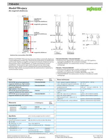 750-624 1 Moduł filtrujący dla magistrali obiektowej 335 sygnalizacja zasilania -magistrala obiektowa 13 14 A C B D magistrala systemowa + + zasilanie magistrali obiektowej 24 V — 24 V 24 V — 0V 0V 0V 750-624 magistrala obiektowa 750-624 750-624/020-000 750-624/000-001 750-624/020-001 dostawa bez oznaczników Mini-WSB WAGO-I/O-SYSTEM 750 może być stosowany także w przemyśle okrętowym i innych aplikacjach morskich (np. infrastrukturze przybrzeżnej czy platformach wiertniczych). Spełnia szczególne wymagania towarzystw okrętowych jak np. Germanischer Lloyd i Lloyds Register, co zostało potwierdzone licznymi certyfikatami. Zastosowanie tego modułu daje gwarancję właściwego funkcjonowania. Moduł zawiera zabezpieczenie przeciwprzepięciowe. Warianty High Isolation są przystosowane do zastosowania w systemach z monitorowaniem izolacji. 750-624/020-000, 750-624/020-001 • konieczny przy zastosowaniu modułów I/O z serii 750 zgodnie z wymogami certyfikatów dla przemysłu morskiego • 750-624/020-001 do zastosowania również w charakterze modułu zasilającego 750-624, 750-624/000-001 • konieczny przy zastosowaniu modułu zasilającego Ex i zgodnie z wymogami certyfikatów dla przemysłu morskiego • konieczny przy zastosowaniu modułów PROFIsafe z serii 750 • 750-624/000-001 do zastosowania również w charakterze modułu zasilającego Opis nr katalogowy szt./ opak. Dane techniczne 24V DC filtr (przeciwprzepięciowy) magistrali obiektowej, High Isolation 24V DC filtr (przeciwprzepięciowy) magistrali obiektowej, High Isolation / bez styków mocy 24V DC filtr (przeciwprzepięciowy) magistrali obiektowej /bez styków mocy 24V DC filtr (przeciwprzepięciowy) magistrali obiektowej /bez styków mocy 750-624/020-000 1 750-624/020-001 1 750-624 1 750-624/000-001 1 maks. napięcie magistrali obiektowej maks. obciążalność magistrali obiektowej technika podłączania przewodu przekrój przewodu dł. odizolowania przewodu szerokość modułu ciężar EMC: 1 - odporność na zakłócenia EMC: 1 - emisja zakłóceń EMC przemysł morski - odporność na zakłócenia EMC przemysł morski - emisja zakłóceń nr katalogowy oznaczniki Mini-WSB bez nadruku z nadrukiem 248-501 patrz str. 352 ... 353 5 Aprobaty patrz również przegląd aprobat rozdział 1 znak zgodności 1 ABS, BV, DNV, GL, KR, LR, NKK, PRS, RINA r UL 508 r ANSI/ISA 12.12.01 4 EN 60079-0, -15 EN 61241-0, -1 4 EN 60079-0, -11, -15 EN 61241-0, -1, -11 Class I Div2 ABCD T4 I M2 / II 3 GD Ex nA IIC T4 zgodnie z Germanischer Lloyd (2003) zgodnie z Germanischer Lloyd (2003) szt./ opak. Akcesoria przemysł morski (warianty na zapytanie) 24 V DC (-25 % ...+30 %) DC 10 A CAGE CLAMP® 0,08 mm² ... 2,5 mm² / AWG 28 ... 14 8 ... 9 mm / 0.33 in 12 mm 51 g zgodnie z EN 61000-6-2 (2005) zgodnie z EN 61000-6-3 (2007) 750-624/... I M2 Ex d I 750-624* II 3 G Ex nA IIC T4 750-624* II 3 D Ex tD A22 IP6X T135°C 750-624* * dopuszczalna temperatura pracy 0 °C ... +60°C :$*2.RQWDNWWHFKQLN*PE+&R.* :$*2(/:$*VS]RR =DVWU]HJDVLĊSUDZRGR]PLDQWHFKQLF]Q\FK XO3LĊNQDD:URFáDZ WHO ZZZZDJRFRP 1.8