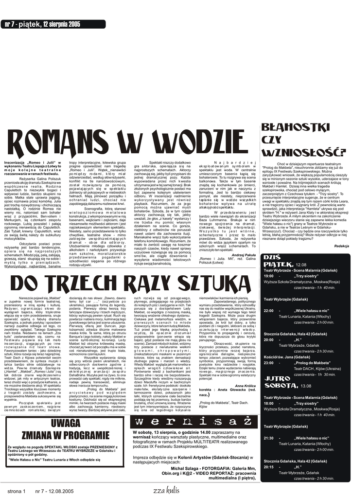 nr 7 - pi¹tek, 12 sierpnia 2005 romans w wodzie Inscenizacja „Romeo i Julii” w wykonaniu Teatru Liepaja z £otwy to moje kolejne teatralne rozczarowanie w ramach festiwalu. Re¿yserka Galina Poliszuk przenios³a akcjê dramatu Szekspira we wspó³czesne realia. Rodzina Capulettich to niezwykle bogaci i wp³ywowi ludzie, bardzo skupieni na sobie. Matka stale uprawia jogging, ojciec rozmawia przez komórkê. Julia jest trochê rozwydrzon¹ i chichocz¹c¹ nastolatk¹. O rodzinie Romea nie wiemy nic, natomiast sam bohater wraz z pr zyjació ³mi, Ben voliem i Merkucjem, s¹ c z³onkami zespo ³u rockowego. Lubi¹ poszaleæ i pa³aj¹ ogromn¹ nienawiœci¹ do Capulettich. Zaœ Tybalt, krewny Capulettich, wraz ze swoj¹ œwit¹ nale¿y do subkultury motocyklistów. Odczytanie postaci przez re¿yserkê jest bardzo tendencyjne, opiera siê na najprostszych schematach. M³odzi pij¹, pal¹, zabijaj¹, grzesz¹, starsi skupiaj¹ siê na sobie i myœl¹ tylko o pieni¹dzach. Wykorzystuj¹c najbardziej banalne tropy interpretacyjne, ³otewska grupa pragnie opowiedzieæ nam tragediê „Romeo i Julii”. W¹tek nienawiœci po mi êd zy ro da mi , k tó ry mi a³ odzwierciedlaæ, wed³ug s³ów re¿yserki, konflikt na tle narodowoœciowym, zo st a³ ro zw i¹ za ny za po mo c¹ po ja wi aj ¹c yc h si ê w sp ek ta kl u ¿o³nierzy si³ pokojowych w niebieskich he³mach. Maj¹ pilnowaæ porz¹dku i ochraniaæ ludzi, chocia¿ nie zapobiegaj¹ dalszemu rozlewowi krwi. Scenografia, któr¹ stanowi wielopoziomowa m etalowa konstrukcja, z wkomponowanymi w ni¹ basenami, wejœciami i zejœciami, daje niesamowite mo¿liwoœci aktorom i jest najciekawszym elementem spektaklu. Niestety, samo przedstawienie to tylko chwytliwe, teatralne show - mimo za bi eg ów uw sp ó³ cz eœ ni aj ¹c yc h dr am at - ob ce dl a od bi or cy . Uto¿samienie m³odego cz³owieka z alkoholem i narkotykami przywo³uje nam szkolne, moralizatorskie przedstawienia pogadanki o szkodliwoœci siêgania po ró¿nego rodzaju u¿ywki. Spektakl niszczy dodatkowo gra a ktor ska, opie raj¹ ca si ê na najprostszych schematach . Aktorzy zachowuj¹ siê, jakby byli przypisani do jednej dramat ycznej pozy. Ka¿da wypowiadana przez nich k westia utrzymana jest w tej samej tonacji. Brak z³o¿onych psychologicznie postaci ma byæ zapewne kolejnym u³atwieniem odbioru. W inscenizacji nadmiernie wykorzystywany jest równie¿ playback. Roz umiem, ¿e za je go pomoc¹ mo¿na ujawniaæ myœli bohaterów. Szkoda, ¿e w tym czasie aktorzy zachowuj¹ siê tak, jakby uwa¿ali, ¿e g³os „z kasety” wystarczy i nie trzeba mu pomóc w³asnym dzia³aniem na scenie. Co gorsza, niektórzy z odtwórców nie poruszali nawet ustami dla zachowania iluzji. Maniakalne wrêcz by³o wykorzystanie telefonu komórkowego. Rozumiem, ¿e mia³o to zwróciæ uwagê na koszmar naszych czasów, kiedy nawet sprawy uczuciowe rozwi¹zuje siê za pomoc¹ sms'ów, ale ci¹g³e dzwonienie i wysy³anie wiadomoœci tekstowych irytuje swoj¹ banalnoœci¹. N a j b a r d z i e j ek sp lo at ow an ym sy mb ol em w spektaklu jest woda. W centralnie umiesz czonym baseni e k¹pi¹ siê bohaterowie. To tu rozgrywa siê scena balkonowa. Tak¿e w tym basenie znajd¹ siê kochankowie po œmierci, zanurzeni w nim jak w naczyniu z formalin¹. Jest to bardzo ciekawy pomys³, ale niestety, nieprzerwane t ap la ni e s iê w w od zi e w sz ys tk ic h bohaterów wp³ywa na utratê atrakcyjnoœci spektaklu. W pr ze ds ta wi en iu j es t bardzo wiele nawi¹zañ do ekranizacji Baza Luhrmanna. Brakuje w nim no we go sp oj rz en ia na dr am at , ci ek aw ej , œw ie ¿e j in te rp re ta cj i. Wszystko tu jest wtórne, sc he ma ty cz ne i p rz ez to ma ³o prawdziwe. Szkoda, ¿e re¿yserka mówi do widza jêzykiem opartym na szkol nych wrêcz s chema tach. To zniszczy³o ten spektakl. Andrzej Paku³a „Romeo i Julia. Mit”, re¿. Galina Poliszuk (£otwa) b³ahostki czy wznios³oœæ? Choæ w dzisiejszym repertuarze teatralnym "Prolog do Makbeta", nieuchronnie zbli¿amy siê ju¿ do epilogu IX Festiwalu Szekspirowskiego. Mo¿na zaryzykowaæ wniosek, ¿e wiêksz¹ popularnoœci¹ cieszy³y siê w minionym sezonie sztuki wysokie, uderzajace w tony wznios³e i powa¿ne. Na trójmiejskich scenach króluj¹ Makbet i Hamlet. Dzisiaj inna wielka tragedia szekspirowska, chocia¿ pod celowo myl¹cym, zaczerpniêtym z Czechowa tytu³em - "Trzy siostry". To przesuniêcie interpretacyjne sugeruje, ¿e w centrum uwagi w spektaklu znajd¹ siê tym razem córki króla Leara, a nie tragiczny ojciec i wygnany król. Z pewnoœci¹ warto sprawdziæ, jaka interpretacja "Hamleta" ukrywa siê pod skrótem "H." w re¿yserii Jana Klaty i w aktorskiej ekspresji Teatru Wybrze¿e. A mi³ym akcentem na zakoñczenie dzisiejszego wieczoru stanie siê zapewne lekka komedia "Wiele ha³asu o nic"( grany w Teatrze Wybrze¿e w Gdañsku, a nie w Teatrze Leœnym w GdañskuWrzeszczu!). Chocia¿ - czy bêdzie ona rzeczywiœcie tylko letni¹, b³ah¹ przyjemnoœci¹? Mo¿e re¿yser odkryje w niej nieznane dot¹d pok³ady tragizmu? Redakcja dziœ Pi¹tek, 12.08 Teatr Wybrze¿e - Scena Malarnia (Gdañsk) do trzech razy sztuka Nareszcie pojawi³ siê „Makbet” w zupe³nie nowej form ie teatral nej, przeniesiony w inn¹ epokê i kulturê. Re ¿y se r, o gr an ic za j¹ c s ³o wo do wyst¹p ieñ bajarz a, który trzykr otnie w³¹cza siê w rytm przedstawienia, snuje opowi eœæ opart ¹ o fabu³ ê drama tu Szekspira, a jednak poetyk¹ i sposobem narracji zupe³nie odbiega od tego, co zwykliœmy ogl¹daæ. Takiego Szekspira nam trzeba. Niedawno na ³amach „Zza kulis” zastanawia³am siê, czemu na Fe st iw al u p oj aw ia si ê t ak ma ³o ins cen iza cji , si êga j¹c ych po i nne rozwi¹zania ni¿ teatr s³owa. Faworyzowa³am taniec - jako dziedzinê sztuki, która rozwija siê teraz najprê¿niej. Teatr Dach z Kijowa potwierdzi³ swoim przedstawieniem, ¿e synteza muzyki i tañca bardzo silnie oddzia³ywuje na wid za. Pew ne d