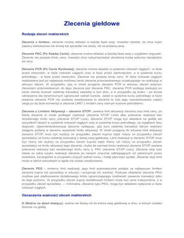 Zlecenia giełdowe Rodzaje zleceń maklerskich Zlecenie z limitem: zlecenie można składać w każdej fazie sesji. Inwestor określa, że chce kupić papiery wartościowe nie drożej lub sprzedać nie taniej, niż za podaną cenę. Zlecenie PKC (Po Każdej Cenie): zlecenie można składać w każdej fazie sesji z wyjątkiem dogrywki. Zlecenie nie posiada limitu ceny. Inwestor chce nabyć/sprzedać określoną liczbę walorów niezależnie od ceny. Zlecenie PCR (Po Cenie Rynkowej): zlecenie można składać w systemie notowań ciągłych : w fazie przed otwarciem, w fazie notowań ciągłych oraz w fazie przed zamknięciem, a w systemie kursu jednolitego - w fazie przed otwarciem. Zlecenie nie posiada limitu ceny. W fazie notowań ciągłych realizowane jest po najlepszej możliwej cenie zlecenia przeciwstawnego oczekującego na realizację w arkuszu zleceń. W przypadku, gdy w chwili przyjęcia zlecenia PCR w arkuszu zleceń jedynym zleceniem przeciwstawnym do tego zlecenia jest zlecenie PKC, zlecenie PCR podlega realizacji po cenie równej kursowi ostatniej transakcji zawartej w tym dniu, a w przypadku jej braku - po kursie odniesienia dla dynamicznych ograniczeń wahań kursów. Jeżeli w systemie kursu jednolitego w fazie otwarcia zlecenie PCR nie zostanie zrealizowane to zlecenie to (lub jego niezrealizowana część) ulega po tej fazie konwersji w zlecenie LIMIT z limitem ceny równym kursowi jednolitemu. Zlecenie z Limitem Aktywacji – zlecenia STOP: zawiera limit aktywacji zlecenia oraz limit ceny, po której zlecenie to może podlegać realizacji (zlecenie STOP Limit) albo polecenie realizacji bez określonego limitu ceny (zlecenie STOP Loss). Zlecenia STOP mogą być składane na giełdę we wszystkich fazach w systemie notowań ciągłych oraz w systemie kursu jednolitego, za wyjątkiem fazy dogrywki. Ujawnienie/aktywacja zlecenia następuje, gdy kurs ostatniej transakcji danym walorem osiągnie podaną w zleceniu wysokość limitu aktywacji. W chwili przyjęcia do arkusza limit aktywacji zlecenia STOP musi być wyższy (w przypadku zleceń kupna) bądź niższy (w przypadku zleceń sprzedaży) od kursu ostatniej transakcji z danej sesji giełdowej. Limit realizacji w zleceniu STOP musi być równy lub wyższy (w przypadku zleceń kupna) bądź równy lub niższy (w przypadku zleceń sprzedaży) od limitu aktywacji tego zlecenia, chyba że zamiast limitu realizacji zlecenie STOP zawiera polecenie realizacji bez określonego limitu ceny tj. PKC (zlecenie STOP Loss). Zlecenie stop loss niesie ze sobą ryzyko realizacji zlecenia po cenach znacznie odbiegających od założonych przez inwestora, szczególnie w przypadku dużych wahań kursu i małej płynności spółek. Zlecenie stop limit może w takich warunkach w ogóle nie zostać zrealizowane. Zlecenie PEG - zmienny limit realizacji: jego limit automatycznie podąża za najlepszym limitem zlecenia kupna lub sprzedaży w arkuszu i przyjmuje ich wartość. Podczas składania zlecenia PEG możliwe jest zdefiniowania dodatkowego limitu ograniczającego możliwość zawarcia transakcji tylko do tego poziomu. W przypadku zleceń kupna dodatkowym limitem może być cena maksymalna, a w przypadku zleceń sprzedaży — minimalna. Zlecenia typu PEG, mogą być składane wyłącznie w fazie notowań ciągłych. Oznaczenia ważności zleceń maklerskich D (Ważne na dzień bieżący): ważne nie dłużej niż do końca sesji giełdowej w dniu, w którym zostało złożone na giełdę. WDD (Ważne do oznaczonego dnia): ważne nie dłużej niż do końca dnia oznaczonego jako data ważności zlecenia, jednak nie dłużej niż 365 dni od dnia złożenia na giełdę. WDA (Ważne na czas nieoznaczony): ważne nie dłużej niż 365 dni od dnia złożenia na giełdę. WDC (Ważne do określonego czasu): ważne nie dłużej niż do godziny określonej w tym zleceniu, w dniu jego złożenia na giełdę, jednak nie dłużej niż do końca sesji giełdowej w dniu, w którym zostało złożone na giełdę. WNF (Ważne na fixing): ważne do zakończenia odpowiednio najbliższej fazy otwarcia, fazy zamknięcia albo okresu równoważenia w dniu złożenia zlecenia na giełdę. może być złożone na giełdę w każdej fazie sesji, w której mogą być składane zlecenia danego rodzaju, jednak do arkusza zleceń jest dodawane w chwili rozpoczęcia odpowiednio najbliższej fazy otwarcia, zamknięcia albo okresu równoważenia. WNZ (Ważne na zamknięcie): ważne do zakończenia fazy zamknięcia, w dniu w którym zostało złożone na giełdę. Może być złożone na giełdę w każdej fazie sesji, w której mogą być składane zlecenia danego rodzaju, jednak do arkusza zleceń jest dodawane w chwili rozpoczęcia najbliższej fazy zamknięcia. Dodatkowe rodzaje ważności zleceń maklerskich WIA (Wykonaj i Anuluj): zlecenie ważne do momentu zawarcia na jego podstawie pierwszej transakcji (lub pierwszych transakcji, jeżeli zlecenie realizowane jest jednocześnie w wielu transakcjach), przy czym niezrealizowana część zlecenia traci ważność. Może być złożone na giełdę wyłącznie w fazie notowań ciągłych oraz w fazie dogrywki. WLA (Wykonaj lub Anuluj): zlecenie ważne do momentu zawarcia na jego podstawie transakcji (jednej lub więcej, jeżeli zlecenie realizowane jest jednocześnie w wielu transakcjach), przy czym zlecenie to musi być zrealizowane w całości albo nie jest realizowane w ogóle. Może być złożone na giełdę tylko w fazie notowań ciągłych oraz w fazie dogrywki. Dodatkowe warunki realizacji zleceń maklerskich MWW (Minimalna Wielkość Wykonania): zlecenia mogą być składane na giełdę wyłącznie w fazie dogrywki oraz w fazie notowań ciągłych, z wyłączeniem okresów równoważeń rynku. Realizowane jest w całości lub częściowo, co najmniej w wielkości określonej w warunku. W przypadku, gdy układ zleceń w arkuszu zleceń nie pozwala na natychmiastową realizację zlecenia z warunkiem MWW co najmn