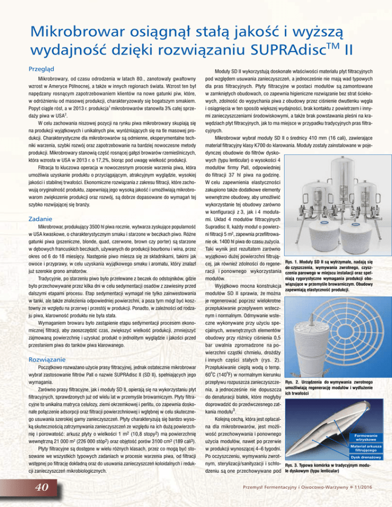 Biuletyn zastos rósł, a w 2013 roku produkcja mikrobrowarów stanowiła 3% całej sprzedaży piwa w USA2. W celu zachowania niszowej pozycji na rynku piwa mikrobrowary skupiają się na produkcji wyjątkowych i unikalnych piw, wyróżniających się na tle masowej produkcji. Charakterystyczne dla mikrobrowarów są odmienne, eksperymentalne techniki warzenia, szybki rozwój oraz zapotrzebowanie na bardziej nowoczesne metody produkcji. Mikrobrowary stanowią część rosnącej gałęzi browarów rzemieślniczych, która wzrosła w USA w 20132 roku o 17,2%, biorąc pod uwagę wielkość produkcji. na wykorzystaniu płyt filtracyjnych, sprawdzonych już o wielu lat w przemyśle browarniczym. Płyty filtracyjne to unikalna matryca celulozy, ziemi okrzemkowej i perlit co zapewnia doskonałe połączenie adsorpcji oraz filtra powierzchniowej i wgłębnej w celu skutecznego usuwania szerokiej gamy zanieczyszczeń. Płyty charakteryzują się bardzo wysoką skutecznością zatrzymywania zanieczyszczeń ze względu na ich dużą powierzchnię i porowatość: arkusz płyty o wielkości 1 m (10,8 stopy2) ma powierzchnię wewnętrzną 21 000 m2 (226 000 stóp2) oraz objętość porów 3100 cm3 (189 cal Mikrobrowar osiągnął stałą jakość i wyższą wydajność dzięki rozwiązaniu SUPRAdiscTM II Filtracja to kluczowa operacja w nowoczesnym procesie Płyty filtracyjne są dostępne w wielu różnych klasach, warzenia piwa, która umożliwia uzyskanie produktu o przez co mogą być stosowane wszystkich typowyc Moduły SD II wykorzystują doskonałe właściwości materiału płyt we filtracyjnych przyciągającym, atrakcyjnym wyglądzie, wysokiej jakości zadaniach w procesie warzenia piwa, od filtracji Mikrobrowary, od czasu odrodzenia w latach 80., zanotowały gwałtowny pod względem usuwania zanieczyszczeń, a jednocześnie mają wad zanieczysz-czeniami środowiskowymi, także brak istabilnej trwałości. Ekonomiczne rozwiązania w zakresie wstępnej po filtracjęnie dokładną oraztypowych do ausuwania powstawania na krawędziach płyt filtracyjnych, ja które produktu, zapewniają zanieczyszczeń koloidalnych i redukcji zanieczyszczeń wzrost w Ameryce Północnej, a także w innych regionach świata.filtracji, Wzrost tenzachowują był dlaoryginalność pras filtracyjnych. Płyty filtracyjne w postacipleśni modułów są zamontowane w przypadku tradycyjnych pras filtracyjnych. jego wysoką jakość i umożliwiają mikrobrowarom zwiękmikrobiologicznych. napędzany rosnącym zapotrzebowaniem klientów na nowe gatunki które,oraz w zamkniętych obudowach, co zapewnia higieniczne rozwiązanie bez strat ściekoszeniepiw, produkcji rozwój, są dobrze dopasowane Mikrobrowar modułydoskonałe SD II o średnicy 410 mm (1 Moduły SD IIwybrał wykorzystują właściwości do wymagań tej szybko rozwijającej siędo wypychania branży. w odróżnieniu od masowej produkcji, charakteryzowały się bogatszym smakiem. wych, zdolność piwa z obudowy przez ciśnieniefiltracyjny dwutlenku węgla cali), zawierające materiał klasy K700 do materiału płyt filtracyjnych w zakresie usuwania 1 klarowania. Moduły zostały zainstalowane w pojedyncz Popyt ciągle rósł, a w 2013 r. produkcja mikrobrowarów stanowiłaZadanie 3% całej sprzei osiągnięcia w ten sposób większej wydajności, brak kontaktu z powietrzem i innyzanieczyszczeń, a jednocześnie nie mają wad typowyc obudowie do filtrów dyskowych (typu lenticular) o dlaa także pras filtracyjnych. Płyty filtracyjne postaci modułó daży piwa w USA2. mi zanieczyszczeniami środowiskowymi, brak powstawania pleśni wna krawysokości 4 modułów firmy Pall, odpowiedniej do filtrac Mikrobrowar produkujący 3500 hl piwa rocznie, wytwarza są zamontowane w zamkniętych obudowach, co W celu zachowania niszowej pozycji na rynku piwa mikrobrowary skupiają się wędziach płyt filtracyjnych, jak to ma miejsce w przypadku tradycyjnych pras filtra37 hl piwa na godzinę. W celu zapewnienia zyskujące popularność w USA kwaśne, cierpkie i starzone zapewnia higieniczne rozwiązanie bez strat ściekowych elastyczności zakupiono także w masowej beczkach propiwo. Wiele gatunków piwa (pszeniczne, na produkcji wyjątkowych i unikalnych piw, wyróżniających się na tle cyjnych. zdolność do wypychania piwa dodatkowe z obudowy elementy przez wewnętrzne obudowy, aby iumożliwić wykorzystanie blonde, quad, czerwone, brown czy porter ) są starzone ciśnienie dwutlenku węgla osiągnięcia w ten sposóbte dukcji. Charakterystyczne dla mikrobrowarów są odmienne, eksperymentalne techMikrobrowar wybrał moduły SD II o średnicy 410 mm (16 cali), zawierające obudowy zarówno w brak konfiguracji z 3z oraz 4 modułami. w dębowych francuskich beczkach używanych do wyższej wydajności, kontaktu powietrzem i inny niki warzenia, szybki rozwój oraz zapotrzebowanie na bardziej nowoczesne materiał do klarowania. zostałypowierzchni zainstalowane w pojeModuł Moduły o największej filtrującej wśród produkcji metody bourbonu i wina przezfiltracyjny okres od 6klasy do 18K700 miesięcy. 2 2 (53,8 ft ) na modułów na filtry dyskowe w branży (5 m Następnie piwo miesza się ze składnikami, takimi jakdyskoprodukcji. Mikrobrowary stanowią część rosnącej gałęzi browarów rzemieślniczych, dynczej obudowie do filtrów moduł) zapewnia w konfiguracji o wysokości 4 modułó owoce i przyprawy, w celu uzyskania wyjątkowego smaku która wzrosła w USA w 2013 r. o 17,2%, biorąc pod uwagę wielkość produkcji. wych (typu lenticular) o wysokości 4 przefiltrowanie około 1400 hl piwa do czasu zużycia. i aromatu, który znalazł już szerokie grono amatorów. Taki wynik jest rezultatem zarówno wyjątkowo dużej Filtracja to kluczowa operacja w nowoczesnym procesie warzenia piwa, która modułów firmy Pall, Tradycyjnie, po starzeniu piwo było przelewaneodpowiedniej z beczek powierzchni filtrującej, jak również zdolności do do odstojników, było przechowyw