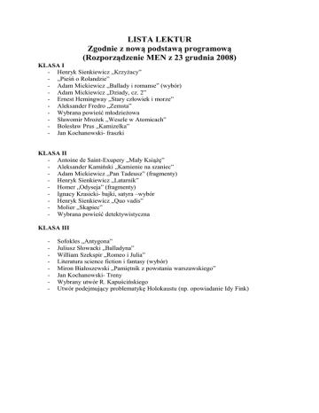 LISTA LEKTUR Zgodnie z nową podstawą programową (Rozporządzenie MEN z 23 grudnia 2008) KLASA I - Henryk Sienkiewicz „Krzyżacy” - „Pieśń o Rolandzie” - Adam Mickiewicz „Ballady i romanse” (wybór) - Adam Mickiewicz „Dziady, cz. 2” - Ernest Hemingway „Stary człowiek i morze” - Aleksander Fredro „Zemsta” - Wybrana powieść młodzieżowa - Sławomir Mrożek „Wesele w Atomicach” - Bolesław Prus „Kamizelka” - Jan Kochanowski- fraszki KLASA II - Antoine de Saint-Exupery „Mały Książę” - Aleksander Kamiński „Kamienie na szaniec” - Adam Mickiewicz „Pan Tadeusz” (fragmenty) - Henryk Sienkiewicz „Latarnik” - Homer „Odyseja” (fragmenty) - Ignacy Krasicki- bajki, satyra –wybór - Henryk Sienkiewicz „Quo vadis” - Molier „Skąpiec” - Wybrana powieść detektywistyczna KLASA III - Sofokles „Antygona” Juliusz Słowacki „Balladyna” William Szekspir „Romeo i Julia” Literatura science fiction i fantasy (wybór) Miron Białoszewski „Pamiętnik z powstania warszawskiego” Jan Kochanowski- Treny Wybrany utwór R. Kapuścińskiego Utwór podejmujący problematykę Holokaustu (np. opowiadanie Idy Fink)