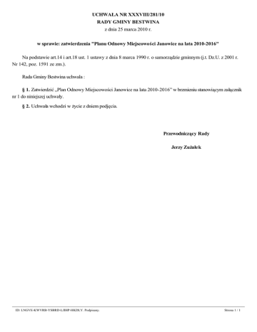 UCHWA A NR XXXVIII/281/10 RADY GMINY BESTWINA !"#$%!&'!(%)*%!&+,+!)w sprawie: zatwierdzenia "Planu Odnowy Miejscowo!ci Janowice na lata 2010-2016" .%!/0"12%3$4!%)2-,5!$!%)2-,6!712-!,!712%38! !"#$%!6!(%)*%!,99+!)-!0!1%(0) :" $4!;($##8(!<=-2-!> -?-! !&++,!)-! Nr 142, poz. 1591 ze zm.). Rada Gminy Bestwina uchwala : "#1$#Zatwierdzi@!APlan Odnowy MiejscowoBci Janowice na lata 2010-2016C!3!D) ($4#$7!12%#03$:cym zaE:cznik #)!,!"0!#$#$4=1 4=!7*F3%Ey. "#2$#UchwaE%!3*F0" $!3!G8*$4! !"#$4(!/0"=Hcia. Przewodnicz%cy Rady Jerzy Zu&a'ek ! ID: LNGVE-KWVRB-YSBRD-LJIHP-HKDLY. Podpisany. Strona 1 / 1 Plan Odnowy Miejscowości Janowice na lata 2010-2016 PLAN ODNOWY MIEJSCOWOŚCI JANOWICE NA LATA 2010-2016 Opracowanie: IR Consulting S.C. Izabela śelichowska Renata śmija 43-300 Bielsko-Biała ul. 1 Dywizji Pancernej 45 marzec 2010 1 Plan Odnowy Miejscowości Janowice na lata 2010-2016 SPIS TREŚCI WSTĘP ........................................................................................................ 4 I. CHARAKTERYSTYKA MIEJSCOWOŚCI JANOWICE .................................. 5 1. Podstawowe dane miejscowości Janowice .................................... 5 2. PołoŜenie i warunki naturalne Janowic.......................................... 5 3. Rys historyczny............................................................................. 8 II. INWENTARYZACJA ZASOBÓW SŁUśĄCYCH ODNOWIE MIEJSCOWOŚCI . 9 1. Środowisko przyrodnicze i kulturowe ................................................... 9 1.1. Zabytki.......................................................................................... 9 1.2. Uwarunkowania ochrony środowiska ............................................ 9 2. Infrastruktura techniczna .................................................................. 11 2.1. Komunikacja drogowa................................................................. 11 2.2. Sieć wodociągowa....................................................................... 12 2.3. Sieć kanalizacyjna....................................................................... 12 2.4. Sieć gazowa ................................................................................ 13 2.5. Telekomunikacja ......................................................................... 13 3. Sfera społeczna.................................................................................. 13 3.1. Struktura demograficzna............................................................. 13 3.2. Ochrona zdrowia i pomoc społeczna ............................................ 15 3.3. Oświata....................................................................................... 17 3.4. Działalność kulturalna i sportowa mieszkańców Janowic............. 20 3.5. Bezpieczeństwo publiczne........................................................... 21 3.6. Ochrona przeciwpoŜarowa i przeciwpowodziowa ........................ 21 4. Sfera gospodarcza.............................................................................. 21 4.1. Główni pracodawcy i rodzaje podmiotów gospodarczych na terenie Bestwiny. .................................................................................... 21 4.2. Struktura zatrudnienia ................................................................ 22 III. OPIS I CHARAKTERYSTYKA OBSZARÓW ............................................. 23 IV. ANALIZA ZASOBÓW MIEJSCOWOŚCI JANOWICE ................................ 26 V. ANALIZA SWOT .................................................................................. 28 V. KLUCZOWE OBSZARY PROBLEMOWE ROZWOJU ..................................... 30 VI. WIZJA STANU DOCELOWEGO MIEJSCOWOŚCI JANOWICE .................... 33 VII. WIZJA ROZWOJU MIEJSCOWOŚCI JANOWICE .................................... 34 VIII. PROGRAM ROZWOJU MIEJSCOWOŚCI JANOWICE – PLANOWANE DZIAŁANIA ............................................................................................... 35 IX. HARMONOGRAM REALIZACJI ZAPLANOWANYCH DZIAŁAŃ ................... 38 X. SYSTEM WDRAśANIA PLANU ODNOWY MIEJSCOWOŚCI I PUBLIC RELATIONS ............................................................................................... 40 Spis tabel Tabela 1. Powierzchnia terenu Gminy Bestwina z podziałem na sołectwa. ............... 8 Tabela 2. Ludność Gminy Bestwina oraz gęstość zaludnienia w podziale na sołectwa. ................................................................................................................. 13 Tabela 3. Podział ludności Gminy Bestwina na wiek przedprodukcyjny, produkcyjny i poprodukcyjny w latach 2000-2008............................................................... 15 Tabela 4. Podmioty gospodarki narodowej zarejestrowane w rejestrze REGON w Gminie Bestwina w 2008 r.......................................................................... 22 Tabela 5. Planowane działania ze wskazaniem kolejności realizacji. ..................... 35 Tabela 6. Harmonogram realizacji planowanych działań. .................................... 39 2 Plan Odnowy Miejscowości Janowice na lata 2010-2016 Spis wykresów Wykres 1. Przyrost naturalny w Gminie Bestwina w latach 2001-2008.........................14 Spis rysunków Rysunek Rysunek Rysunek Rysunek Rysunek 1. 2. 3. 4. 5. PołoŜenie Bestwiny na terenie województwa śląskiego......................... 6 PołoŜenie Bestwiny na terenie powiatu bielskiego. .............................. 6 Struktura administracyjna Gminy Bestwina........................................ 7 Ciągi komunikacji kołowej w Gminie Bestwina. ................................. 11 Placówki oświatowe na terenie sołectwa Janowice............................. 18 3 Plan Odnowy Miejscowości Janowice na lata 2010-2016 WSTĘP Plany Odnowy Miejscowości są częścią składową prowadzonych przez Jednostki Samorządów Terytorialnych działań, zmierzających do poprawy sytuacji gmin oraz sprzyjających długofalowemu rozwojowi gospodarcz