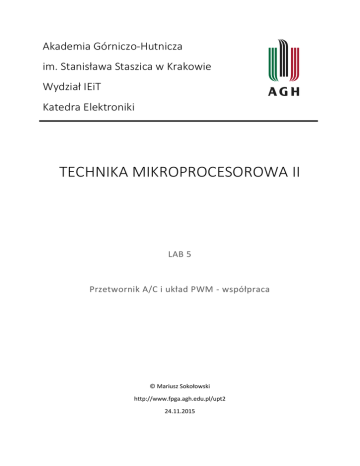 Akademia Górniczo-Hutnicza im. Stanisława Staszica w Krakowie Wydział IEiT Katedra Elektroniki TECHNIKA MIKROPROCESOROWA II LAB 5 Przetwornik A/C i układ PWM - współpraca © Mariusz Sokołowski http://www.fpga.agh.edu.pl/upt2 24.11.2015 1. WSTĘP 1.1. CEL Celem ćwiczenia jest: zapoznanie studenta z techniką poprawnej inicjalizacji przetwornika A/C, poznanie trybu pracy PWM licznika TPM, nabycie umiejętności łączenia funkcjonalnego układów peryferyjnych, na przykładzie współpracy przetwornika A/C z czujnikiem natężania światła oraz diodami LED za pośrednictwem układu PWM, wykorzystanie techniki uśredniania (celem ograniczenia zakłóceń mierzonego sygnału), wspomaganą wzorcowym sygnałem o częstotliwości 10Hz. 1.2. WYMAGANIA Sprzętowe: komputer klasy PC spełniający wymagania sprzętowe aplikacji KEIL v5, zestaw FRDMKL46Z Programowe: system operacyjny Windows XP lub wyższy środowisko Keil / uVision 5 MDK-ARM Doświadczenie: podstawowa umiejętność obsługi komputera klasy PC, podstawowa znajomość systemów operacyjnych rodziny Windows, podstawowa znajomość zagadnień z Techniki Mikroprocesorowej 1 podstawowa znajomość zagadnień z Techniki Cyfrowej Literatura: KL46 Sub-Family Reference Manual, Freescale Semiconductor Kinetis L Peripheral Module Quick Reference, Freescale Semiconductor HC-SR04 datasheet 2. PRZETWORNIK A/C Układ MKL46Z256VLL4, będący "sercem" zestawu FRDM-KL46Z, posiada w swoich zasobach sprzętowych, wielokanałowy, 16-bitowy przetwornik analogowo-cyfrowy (rys. 1). Rys. 1. Schemat przetwornika A/C Wszystkie wejścia mogą pracować w konfiguracji niesymetrycznej (w stosunku do masy). Część wejść, natomiast, można skonfigurować jako wejścia symetryczne (różnicowe). Właściwość ta ma swoje odzwierciedlenie w formacie wyniku przetwarzania oraz możliwych do uzyskania rozdzielczości. Dla wersji niesymetrycznej istnieją tryby: 8, 10, 12 i 16 bitów. W tym przypadku wynik jest liczbą bez znaku. Dla wersji symetrycznej zaimplementowane tryby to: 9, 11,13 i 16 bitów. Wynik jest liczbą ze znakiem w formacie U2. Zewnętrzne napięcie referencyjne wynosi 3.3V. Jest to wartość, której nie powinno się przekraczać na wejściach. Pierwszą czynnością, którą należy wykonać przed wykorzystywaniem przetwornika, jest kalibracja. Jednak zanim sie ją uruchomi, należy ustawić odpowiednie wartości w rejestrach konfiguracyjnych, wg następującego klucza: upewnić, czy stała CLOCK_SETUP, w zbiorze system_MKL46Z4.c, ma wartość 1. Jeśli nie, to należy ją zmienić. Dla takiego ustawienia parametry podstawowych sygnałów zegarowych mają następujące wartości: zegar referencyjny dla modułu MCG - 8MHz, Core clock - 48MHz, BusClock - 24MHz, dołączyć sygnał taktujący do modułu A/C w rejestrze SIM->SCGC6, ustawić źródło sygnału zegarowego przetwornika, wartość dzielnika dla tego sygnału oraz długi czas próbkowania, w rejestrze ADC0->CFG1 (ADICLK, ADIV, ADLSMP) wynikowa częstotliwość sygnału zegarowego ADCK powinna być mniejsza lub równa 4MHz, ustawić wspomaganie dla wysokich częstotliwości próbkowania oraz ilość dodatkowych cykli ADCK dla długiego czasu próbkowania (CFG1[ADLSMP]=1), w rejestrze ADC0>CFG2 (ADHSC, ADLSTS), wybrać zewnętrzne źródło referencyjne, w rejestrze ADC0->SC2 (REFSEL), włączyć uśrednianie sprzętowe oraz ustawić ilość na wartość maksymalną (32), w rejestrze ADC0->SC3 (AVGE, AVGS), rozpocząć kalibrację poprzez ustawienie bitu CAL na wartość 1, w rejestrze ADC0->SC3. Dla potrzeb kalibracji niepotrzebne jest ustawienie numeru kanału, trybu przetwarzania (pojedynczy czy ciągły), parametrów funkcji porównywania, rozdzielczości czy trybu pracy wejść (symetryczny, niesymetryczny). Czekając na koniec kalibracji należy sprawdzać stan bitu CAL. Wartość 0 oznacza koniec kalibracji. Następnie konieczne jest sprawdzenie stanu bitu CALF. Jeśli jest ustawiony na wartość 1, to kalibracja się nie powiodła i należy ją powtórzyć, względnie podjąć inne działania obsługujące tego rodzaju błąd. Po zakończonej pomyślnie kalibracji należy jej wyniki przetworzyć i zapisać do odpowiednich rejestrów. Wygląda to następująco: zsumować ze sobą wszystkie rejestry ADC0->CLPx, podzielić przez 2, ustawić najbardziej znaczący bit na 1, wysłać do rejestru ADC0->PG, zsumować ze sobą wszystkie rejestry ADC0->CLMx, podzielić przez 2, ustawić najbardziej znaczący bit na 1, wysłać do rejestru ADC0->MG. W tym momencie przetwornik jest gotowy pracy. Trzeba tylko ustawić pozostałe parametry oraz zmienić, w razie potrzeby, inne wcześniej ustawione. Do celów naszego ćwiczenia należy ustawić następujące parametry: w rejestrze ADC0->CFG1: zegar na BUS_CLOCK/2, dzielnik przez 1, długi czas próbkowania, rozdzielczość 12 bitów, w rejestrze ADC0->SC1[0]: przerwanie aktywne (AIEN). Ponieważ domyślnie, po sygnale RESET, pewne ustawienia są już zapewnione (np. wyzwalanie programowe, typ wejść), więc nie trzeba ich ponownie wprowadzać. Wyzwalanie pomiaru przeprowadza się poprzez ustawienie w rejestrze ADC0->SC1[0] numeru kanału pomiarowego. należy pamiętać, że układ (domyślnie) jest ustawiony na wyzwalanie programowe (ADTRG=0 w rejestrze ADC0->SC2). Wynik przetwarzania jest dostępny poprzez odczyt rejestru ADC0->R[0]. 3. LICZNIK TPM0 - TRYB PWM Licznik TPM0 posiada 6 kanałów, które niezależnie można wykorzystywać w różnych trybach pracy. Część z nich została poznana w trakcie ćwiczenia dotyczącego liczników (LAB4). Na obecnym etapie skupimy się na funkcji PWM. Dla przypomnienia przedstawiono tabelę (Tab. 1), w której zestawiono wszystkie możliwe tryby pracy licznika TPM. Tab. 1. Tryby pracy licznika TPM Nas będą interesować pozycje "Edge-aligned PWM" oraz " Center-aligned PWM". Pierwsza pozycja dotyczy trybu z impulsem pozycjonowanym względem zbocza. Druga natomiast odnosi się do trybu z impulse