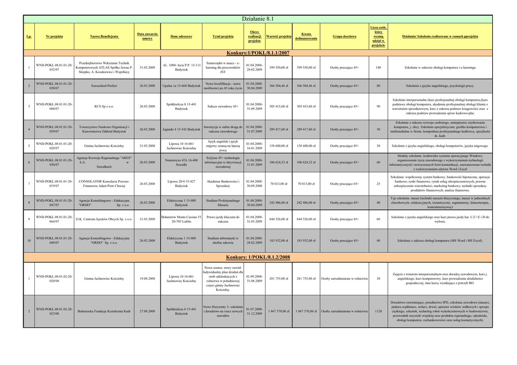 Działanie 8.1 Lp. Nr projektu Nazwa Beneficjenta Data zawarcia umowy Dane adresowe Tytuł projektu Okres realizacji projektu Wartość projektu Kwota dofinansowania Grupa docelowa Licza osób, które wezmą udział w projekcie Działania/ Szkolenia realizowane w ramach pprojektu Konkurs:1/POKL/8.1.1/2007 1 Przedsiębiorstwo Wdrażania Technik WND-POKL.08.01.01-20Komputerowych ATLAS Spółka Jawna P. 032/07 Skiepko, A. Kozakiewicz i Wspólnicy 31.03.2008 Al.. 1000- lecia P.P. 15-111 Białystok Samorządni w nauce - elearning dla pracowników JST 01.04.200828.02.2009 399 550,00 zł 399 550,00 zł Osoby pracujące 45+ 140 Szkolenie w zakresie obsługi komputera i e-learningu 2 WND-POKL.08.01.01-20038/07 Euroschool-Perfect 26.03.2008 Upalna 1a 15-668 Białystok Nowe kwalifikacje - nowe możliwości po 45 roku życia 01.04.200830.04.2009 366 504,46 zł 366 504,46 zł Osoby pracujące 45+ 80 Szkolenie z języka angielskiego, psychologii pracy. 3 WND-POKL.08.01.01-20084/07 RCS Sp z o.o. 26.03.2008 Spółdzielcza 8 15-441 Białytsok Sukces zawodowy 45+ 01.04.200831.09.2009 305 415,60 zł 305 415,60 zł Osoby pracujące 45+ 90 Szkolenie interpersonalne (kurs profesjonalnej obsługi komputera,(kurs podstawy obsługi komputera, akademia profesjonalnej obsługi klienta z warsztatem sprzedażowym, kurs z zakresu podstaw księgowości oraz z zakresu podstaw prowadzenia spraw kadrowo-płac 4 WND-POKL.08.01.01-20059/07 Towarzystwo Naukowe Organizacji i Kierownictwa Oddział Białystok 26.03.2008 Jagienki 4 15-542 Białystok Inwestycja w siebie drogą do sukcesu zawodowego 01.04.200831.07.2009 289 417,60 zł 289 417,60 zł Osoby pracujące 45+ 30 Szkolenie z zakresu rozwoju osobistego, umiejętności użytkowania komputera, j. obcy. Szkolenie specjalistyczne: grafika komputerowa i multimedialna w firmie, kompedium profesjonalnego hadlowca, specjlasita ds. kadr. 5 WND-POKL.08.01.01-20020/07 Gmina Juchnowiec Kościelny 31.03.2008 Lipowa 10 16-061 Juchnowiec Kościelny Język angielski i język migowy szansą na lepszą pracę 01.04.200816.01.2009 158 600,00 zł 158 600,00 zł Osoby pracujące 45+ 30 Szkolenie z języka angielskiego, obsługi komputerów, języka migowego. 6 WND-POKL.08.01.01-20050/07 Agencja Rozwoju Regionalnego "ARES" S.A. w Suwałkach 26.03.2008 Noniewicza 42A 16-400 Suwałki Sz@nsa 45+ technologia informacyjna w aktywizacji zawodowej 01.04.200831.01.2009 106 624,32 zł 106 624,32 zł Osoby pracujące 45+ 60 Moduły szkolenia: środowisko systemu operacyjnego Windows; organizowanie życia zawodowego z wykorzystaniem technologii informatycznych i nowoczesnych form komunikacji, zaawansowane techniki z wykorzystaniem edytora Word i Excel 7 WND-POKL.08.01.01-20019/07 CONSOLATOR Kancelaria PrawnoFinansowa Adam Piotr Chociej 26.03.2008 Lipowa 20/4 15-427 Białystok Akademia Bankowości i Sprzedaży 01.04.200830.09.2008 70 013,00 zł 70 013,00 zł Osoby pracujące 45+ 25 Szkolenia: współczesny system bankowy, bankowość hipoteczna, operacje bankowe; rynki finansowe, rynek usług ubezpieczeniowych; prawne zabezpieczenie wierztelności; marketing bankowy; techniki sprzedazy produktów finansowych; analiza finansowa. 8 WND-POKL.08.01.01-20047/07 Agencja Konsultingowo - Edukacyjna "ORDO" Sp. z o.o. 26.03.2008 Elektryczna 1 15-080 Białystok Studium Profesjonalnego Masażu 01.04.200830.04.2009 242 486,00 zł 242 486,00 zł Osoby pracujące 45+ 40 Typ szkolenia: masaż (techniki masażu klasycznego, masaz w jednostkach chorobowych, relaksacyjnych, izometryczny, segmentarny, kinezoterapia, kontralateratywny) 9 WND-POKL.08.01.01-20064/07 O.K. Centrum Języków Obcych Sp. z o.o. 31.03.2008 Bohaterów Monte Cassino 53 20-705 Lublin Prawo jazdy kluczem do sukcesu 01.04.200831.03.2009 644 526,00 zł 644 526,00 zł Osoby pracujące 45+ 60 Szkolenie z języka angielskiego oraz kurs prawa jazdy kat. C,C+E i D do wyboru. 10 WND-POKL.08.01.01-20049/07 Agencja Konsultingowo - Edukacyjna "ORDO" Sp. z o.o. 26.03.2008 Elektryczna 1 15-080 Białystok Studium informatyki w służbie zdrowia 01.04.200828.02.2009 183 932,00 zł 183 932,00 zł Osoby pracujące 45+ 40 Szkolenie z zakresu obsługi komputera (MS Word i MS Excel). 281 755,00 zł Osoby zatrudnienione w rolnictwie 30 Zajęcia z trenerem interpersonalnym oraz doradcą zawodowym, kurs j. angielskiego, kurs komputerowy, kurs prowadzenia działalności gospodarczej, inne kursy wynikające z potrzeb BO. 1120 Doradztwo reorientujące, poradnictwo IPD, szkolenia zawodowe (masarz, piekarz,wędliniarz, stolarz, drwal, operator wózków widłowych i sprzętu ciężkiego, szkutnik, technolog robót wykończeniowych w budownictwie, przewodnik turystyki wiejskiej oraz produktu regionalnego, rękodzieła, obsługi komputera, rachunkowowści oraz usług kosmetycznych). Konkurs: 1/POKL/8.1.2/2008 1 WND-POKL.08.01.02-20020/08 2 WND-POKL.08.01.02-20023/08 Gmina Juchnowiec Kościelny Białostocka Fundacja Kształcenia Kadr 19.08.2008 Lipowa 10 16-061 Juchnowiec Kościelny Nowa szansa- nowy zawód. Indywidualny plan działań dla osób odchodzacych z 01.09.2008rolnictwa w południowej 31.08.2009 częsci gminy Juchnowiec Kościelny. 27.08.2008 Spółdzielcza 8 15-441 Bialystok Nowe Horyzonty 3- szkolenia i doradztwo na rzecz nowych zawodów 01.07.200831.12.2009 281 755,00 zł 1 867 570,00 zł 1 867 570,00 zł Osoby zatrudnienione w rolnictwie 3 WND-POKL.08.01.02-20013/08 Stowarzyszenie "Miasta w Internecie" 25.08.2008 Krakowska 11a 33-100 Tarnów TR@NSPOD- Podlaskie Partnerstwo dla eRozwoju 01.09.200828.02.2010 1 264 200,00 zł 1 264 200,00 zł 4 WND-POKL.08.01.02-20009/08 Stowarzyszenie B-4 20.08.2008 Sokoła 4a/2 35-010 Rzeszów Nowa Rola 01.08.200830.09.2009 564 745,00 zł 564 745,00 zł Osoby zatrudnione: przedstawiciele władztw województwa, jst, samorządów gospodarczych i 400 osób i 100 zwodowych, przedsiębiorstw kluczowych sektorówgospodarki i podmiotów regionu, MSP, organizacji instytucjonal pozarządowych działających na nych rzecz eRozwoju, instytucje sekto