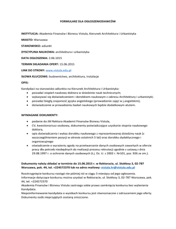 FORMULARZ DLA OGŁOSZENIODAWCÓW INSTYTUCJA: Akademia Finansów i Biznesu Vistula, Kierunek Architektura i Urbanistyka MIASTO: Warszawa STANOWISKO: adiunkt DYSCYPLINA NAUKOWA: architektura i urbanistyka DATA OGŁOSZENIA: 2.06.1015 TERMIN SKŁADANIA OFERT: 15.06.2015 LINK DO STRONY: www.vistula.edu.pl SŁOWA KLUCZOWE: budownictwo, architektura, instalacje OPIS: Kandydaci na stanowisko adiunkta na Kierunek Architektura i Urbanistyka:  posiadać stopień naukowy doktora w dziedzinie nauk technicznych;  wykazywać się doświadczeniem i dorobkiem naukowym z zakresu Architektury i urbanistyki;  posiadać biegłą znajomość języka angielskiego (prowadzenie zajęć w j.angielskim);  doświadczenie w prowadzeniu badań naukowych będzie dodatkowym atutem. WYMAGANE DOKUMENTY:     podanie do JM Rektora Akademii Finansów Biznesu Vistula, CV, kwestionariusz osobowy, dokumenty poświadczające uzyskanie stopnia naukowego doktora, opis doświadczenia i wykaz dorobku naukowego z reprezentowanej dziedziny nauk (z wyszczególnieniem pozycji w okresie ostatnich 5 lat) oraz dorobku dydaktycznego i organizacyjnego oświadczenie o wyrażeniu zgody na przetwarzanie danych osobowych zawartych w ofercie pracy dla potrzeb niezbędnych do realizacji procesu rekrutacji zgodnie z ustawą z dnia 29.08.1997 r. o ochronie danych osobowych (t.j. Dz. U. z 2002 r. Nr101, poz. 926 ze zm.). Dokumenty należy składać w terminie do 15.06.2015 r. w Rektoracie, ul. Stokłosy 3, 02-787 Warszawa, pok. 44, tel. +224572370 lub na adres mailowy: [email protected] Rozstrzygnięcie konkursu nastąpi nie później niż w ciągu 3 miesięcy od jego ogłoszenia. Informacje dotyczące konkursu można uzyskać w Rektoracie, ul. Stokłosy 3, 02-787 Warszawa, pok. 44, tel. +224572370 Akademia Finansów i Biznesu Vistula zastrzega sobie prawo zamknięcia konkursu bez wyłaniania Kandydata. Niepoinformowanie kandydata o wynikach konkursu jest równoznaczne z odrzuceniem jego oferty. Dokumenty osób nieprzyjętych zostaną zniszczone.
