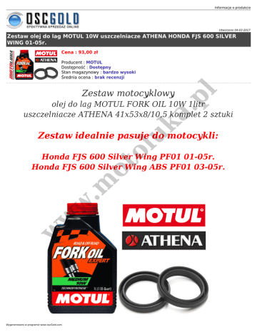 Informacje o produkcie Utworzono 04-03-2017 Zestaw olej do lag MOTUL 10W uszczelniacze ATHENA HONDA FJS 600 SILVER WING 01-05r. Cena : 93,00 zł Producent : MOTUL Dostępność : Dostępny Stan magazynowy : bardzo wysoki Średnia ocena : brak recenzji a. pl Zestaw motocyklowy uk olej do lag MOTUL FORK OIL 10W 1litr uszczelniacze ATHENA 41x53x8/10,5 komplet 2 sztuki ol Zestaw idealnie pasuje do motocykli: w w w .m ot Honda FJS 600 Silver Wing PF01 01-05r. Honda FJS 600 Silver Wing ABS PF01 03-05r. Wygenerowano w programie www.oscGold.com w w w .m ot ol uk a. pl Jeśli potrzebujesz innej lepkości oleju: wybierz 5W, 15W lub 20W i zaznacz w informacji przy zakupie.