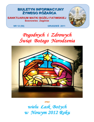 BIULETYN INFORMACYJNY ŻYWEGO RÓŻAŃCA SANKTUARIUM MATKI BOŻEJ FATIMSKIEJ Sosnowiec Zagórze NR 12 (59) GRUDZIEŃ 2011 Pogodnych i Zdrowych Świąt Bożego Narodzenia oraz wielu Łask Bożych w Nowym 2012 Roku Droga Wspólnoto Żywego Różańca Czas płynie nieubłaganie. To już grudzień, ostatni miesiąc kalendarzowego roku 2011. Rodzi się w sercu wdzięczność Bogu za przeżyty czas, za otrzymane dary i za opiekę Bożej Opatrzności nad nami. Rozpoczął się już nowy rok liturgiczny 2011/2012, który przebiegać będzie pod hasłem „Kościół naszym domem”. Kościół prawdziwie jest naszym domem, gdyż mamy jednego Ojca, który obdarzył nas łaską udziału w Jego boskim życiu i uczynił z nas jedną duchową rodzinę. Razem mówimy Ojcze nasz, wspólnie zasiadamy do eucharystycznego stołu słowa i chleba, jednomyślnie wyznajemy tę samą wiarę. Lecz choć tak wiele nas łączy i podejmujemy wiele dzieł wspólnie, to jednak nie wszyscy czujemy się w swoim kościele, jak w swoim domu. Nowy rok duszpasterski ma przyczynić się do odkrywania własnego miejsca w Kościele, do pogłębiania ducha zaangażowania i współodpowiedzialności za kościół, do patrzenia na kościół w taki sposób, w jaki rodzina patrzy na swój dom. Pierwszą odsłoną tajemnic roku liturgicznego jest Adwent, który rozpoczął się 27 listopada. To już kolejny Adwent naszego życia. Kolejne Boże wezwanie i kolejna próba wiary. Czy będzie to czas błogosławiony czy stracony - zależy wyłącznie od nas. Adwent ma podwójny charakter. Jest czasem przygotowania do uroczystości Bożego Narodzenia, przez którą Kościół czci pierwsze przyjście Syna Bożego do ludzi, ale zarazem jest okresem, w którym, wspominając to przyjście, oczekujemy drugiego, jakie będzie miało miejsce u kresu dziejów ludzkości. Liturgia Adwentu ukazuje nam dwie wielkie postaci: proroka Izajasza i św. Jana Chrzciciela. Pierwszy, uosobienie tęsknoty Starego Testamentu, jest prorokiem, który zostawił najwięcej proroctw związanych z Mesjaszem. Jan Chrzciciel nie tyle przepowiada, ile wskazuje na osobę Jezusa, który jako Zbawiciel i Odkupiciel już przyszedł i niedługo rozpocznie swą misję. Św. Jan Chrzciciel swoim życiem i słowem uczy nas, w jaki sposób należy przygotować się na przyjście Pana: przez pokutę, zerwanie z grzechem, powstanie z nałogów, słowem - ze starego człowieka przeobrażenie się w nowego, na wzór samego Chrystusa. Święty czas adwentowy jest także przypomnieniem prawdy, ogarniającej całe dzieje ludzkie, że Chrystus przyjdzie powtórnie, aby chwałą zmartwychwstania umarłych zakończyć dzieje świata. Zapowiadał przecież: „Przyjdę powtórnie i zabiorę was do siebie, abyście i wy byli tam, gdzie Ja jestem”. Kiedy odszedł, strapieni apostołowie usłyszeli potwierdzenie tej zapowiedzi: „Ten Jezus, wzięty od was do nieba, przyjdzie tak samo, jak widzieliście Go wstępującego do nieba”. A zatem On przyjdzie, dlatego życie całego świata, życie każdego z nas jest czekaniem na Jego przyjście, jest adwentem przed tym powtórnym i ostatecznym przyjściem Chrystusa. Przeżywanie Adwentu powinno nas mobilizować do uporządkowania swego wnętrza tak, aby powitać Pana czystym sercem. Każdy Adwent to czas nawrócenia, by jeszcze raz, ale już głębiej i pełniej, przebyć drogę Jezusa, w rozpoczynającym się roku liturgicznym. Adwent to oczekiwanie w ciemnościach symbolizujących człowieka pogrążonego w grzechu, szukającego ratunku i światła. Tym światłem jest dla nas Matka Jezusa, jasna Jutrzenka, Zorza rano powstająca, która błądzących prowadzi ku niebu, ku zbawieniu. Ona jest jakby drabiną Jakubową, po której zeszło na ziemię Zbawienie. Ona jest biblijną tęczą, zapowiadającą pojednanie, kres gniewu i kar. Ona, wybrana na Matkę Zbawiciela, zapowiada koniec nocy oczekiwania i bliskość wschodu Jego przyjścia. Ona w noc betlejemskiego cudu poda nam od żłóbka swego Syna, byśmy napełnieni Jego łaskami, szli przez życie ku wiekuistemu szczęściu. Ją szczególnie uwielbiamy w Adwencie, zwłaszcza przez nabożeństwa roratnie oraz 8 grudnia, kiedy Kościół obchodzi uroczystość Niepokalanego Poczęcia Maryi Panny. Pochylając się w tym dniu nad Tajemnicą Niepokalanego Poczęcia i znaczeniem tego dogmatu dla katolików, możemy świadomie przeżyć okres adwentowego oczekiwania, zrozumieć sens narodzin Mesjasza i lepiej przygotować się do duchowego odrodzenia. W tym szczególnym dniu, w godz. 1200 – 1300, przypada również Godzina Łaski dla całego świata. Zaproszenie do wspólnej modlitwy na str. 7. Msze św. roratnie odprawiane są w naszym Sanktuarium o godz. 18. Wśród ważnych symboli adwentowych wyróżnić należy światło. Świece i lampiony w Kościele posiadają bogatą i głęboką symbolikę. W ciemności czujemy się źle, brak nam pewności, nawet znając drogę, możemy łatwo zabłądzić. Światłość jest darem Bożym. Chrystus przychodzi na świat jako światłość świata, przynosi nam światło swojej nauki. Dlatego dzieci przynoszą na Msze święte roratnie lampiony i zapala się światła na „Chwała na wysokości”. Jest to jeden z nielicznych przypadków w roku liturgicznym, kiedy hymn ten śpiewa się każdego dnia (chociaż wyłącznie podczas Rorat). W naszej polskiej tradycji już od ponad 160 lat przyjął się też zwyczaj ustawiania wieńca adwentowego. Wieniec adwentowy jest wykonany w kształcie koła z gałązek szlachetnych drzew iglastych, świerku, jodły, daglezji lub sosny. Wieniec może być również wykonany z liści laurowych lub mahoniowych. Na wieńcu umieszcza się cztery świece – symbol czterech niedziel Adwentu. Płomienie tych świec, zapalanych kolejno w poszczególne niedziele, przypominają nam o tym, że: Pan jest już blisko! Chrześcijanie poszczególnym świecom nadali ewangeliczną symbolikę. Pierwsza świeca nazwana została